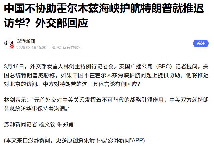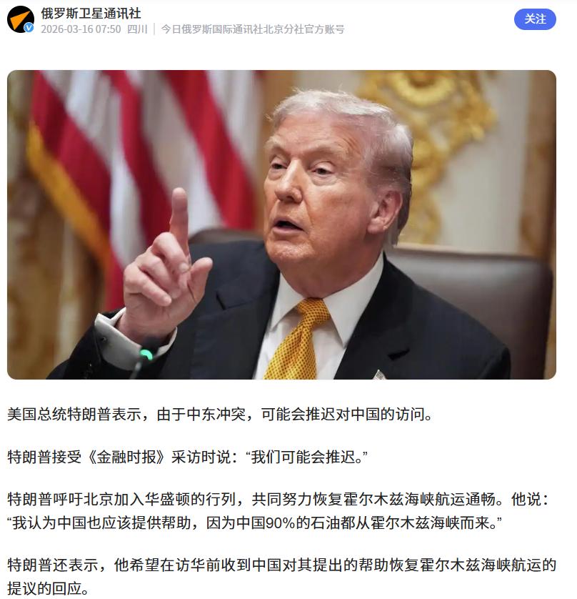 关于特朗普是否因为会因为中东冲突而推迟访问这事,连他自己都不确定。 《金融时报》发布的电话采访记录: 1. 关于中国应参与护航 "I think China should help too because China gets 90% of its oil from the Straits." 我认为中国也应该提供帮助,因为中国90%的石油都来自这个海峡。 2. 关于访华可能推迟 "We may delay." 我们可能会推迟。 3. 关于希望峰会前得到回应 "I would prefer to know Beijing's position before the planned visit." 我更希望在计划中的访问前,了解北京的立场。 《金融时报》并没有将是否参与护航与访问计划联系在一起,但将相关的内容却联系在了一起,其中所表达的逻辑无疑就是试图传达或者试探这样的一个意思:如果你们不帮我,我就要撒泼打滚,在地上不起来了。 但是莫名其妙的点在于,你来与不来,我们都在这里。霍尔木兹海峡的封锁目前看起来对咱们影响真的没有媒体渲染的那么大,数据显示了中东地区这段时间对咱们的石油供应只有多没有少。 好好的中东地区,你一定要去搞事,搞事你就搞事吧,搞到却又搞到没有办法收场。明明是求人帮忙,却摆出一副“你跪下来,我求你点事”的态度。你还真的以为大家都活在上个世纪么? 睁开眼睛看看吧,“百年未有之大变局”,新的时代来了。