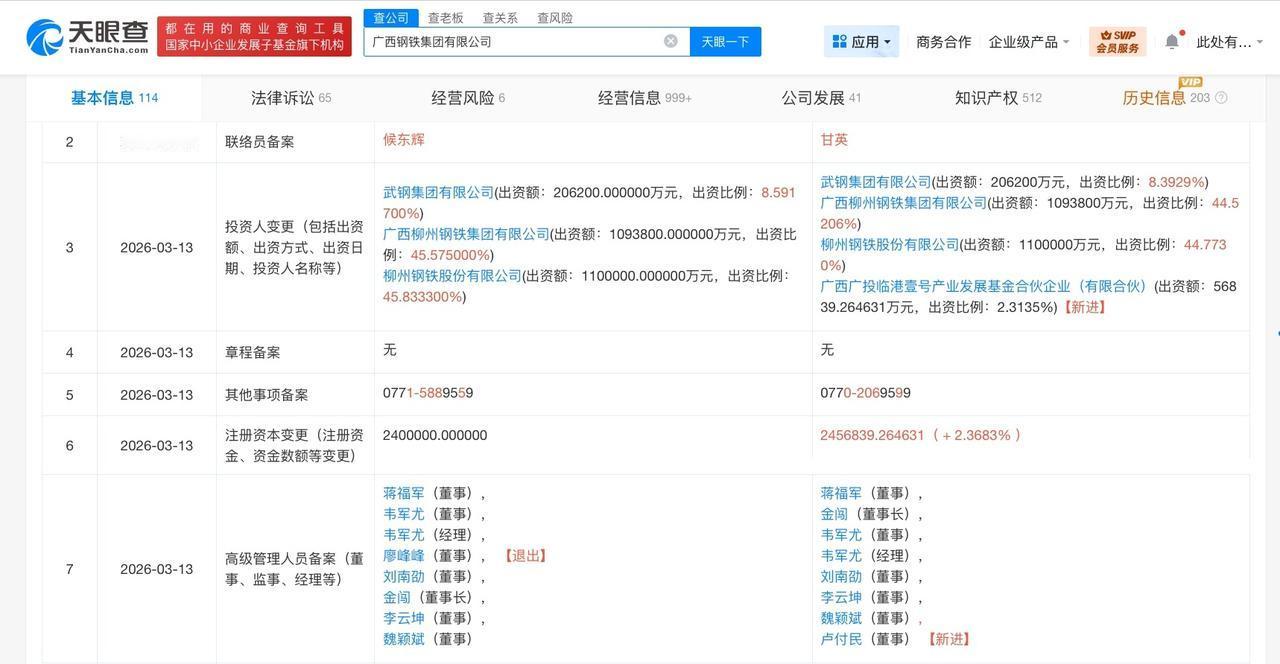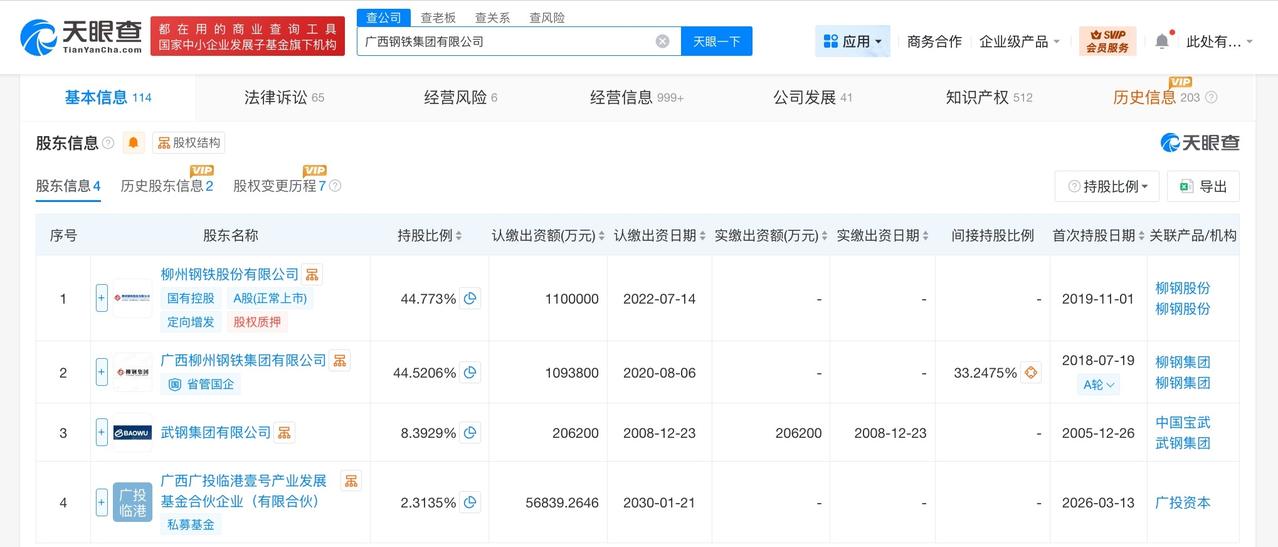 广西钢铁集团增资至245.7亿 天眼查工商信息显示,近日,广西钢铁集团有限公司发生工商变更,注册资本由240亿人民币增至约245.7亿人民币,新增广西广投临港壹号产业发展基金合伙企业(有限合伙)为股东,同时,部分高管发生变更。 广西钢铁集团有限公司成立于2005年12月,法定代表人为金闯,经营范围包括钢、铁冶炼、钢压延加工、炼焦、煤炭及制品销售等。股东信息显示,该公司由柳钢股份、广西柳州钢铁集团有限公司、武钢集团有限公司及上述新增股东共同持股。 天眼查信息:
