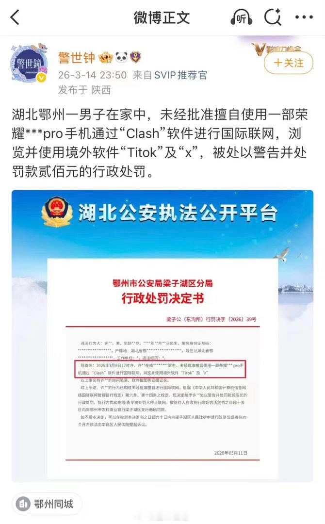 网友翻墙刷 X 和 TikTok 罚款200