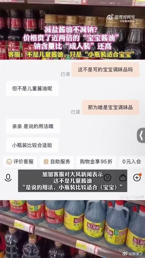 部分酱油减盐不减钠甚至反增客服称宝宝酱油指的是小瓶装 看到标题有点惊。想给宝宝选酱油,客服说“宝宝款”只是包装小瓶装,但没提可能“盐减钠增”的情况。健康产品标注不够透明,家长买前要仔细看清成分标签,别只信“宝宝”标签。