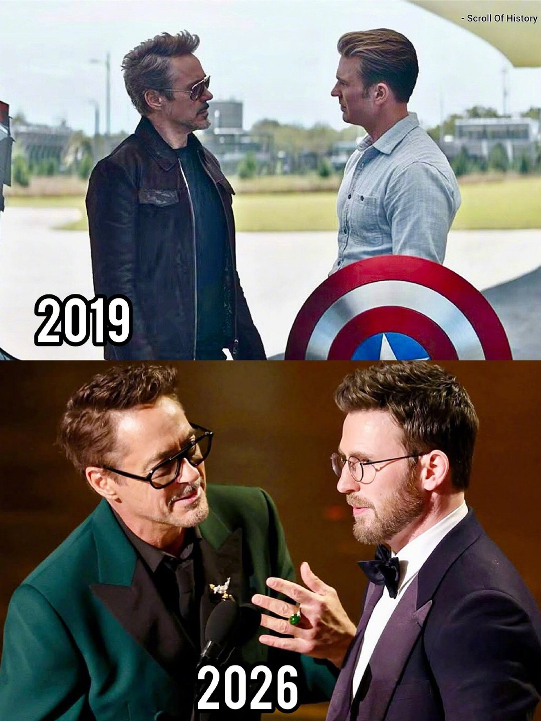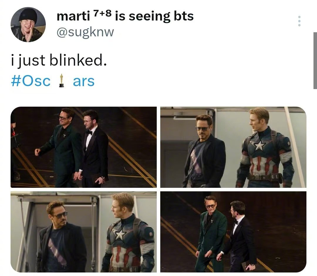 钢铁侠美队奥斯卡重聚 今天颁奖礼上RDJ与CE的盾铁同框引发一大波粉丝回忆杀,感受戏里戏外的同步率 今年是《复联1》北美&内地公映14周年,《复联5:毁灭之日》已定档今年12月18日北美公映~.奥斯卡 2026奥斯卡获奖名单