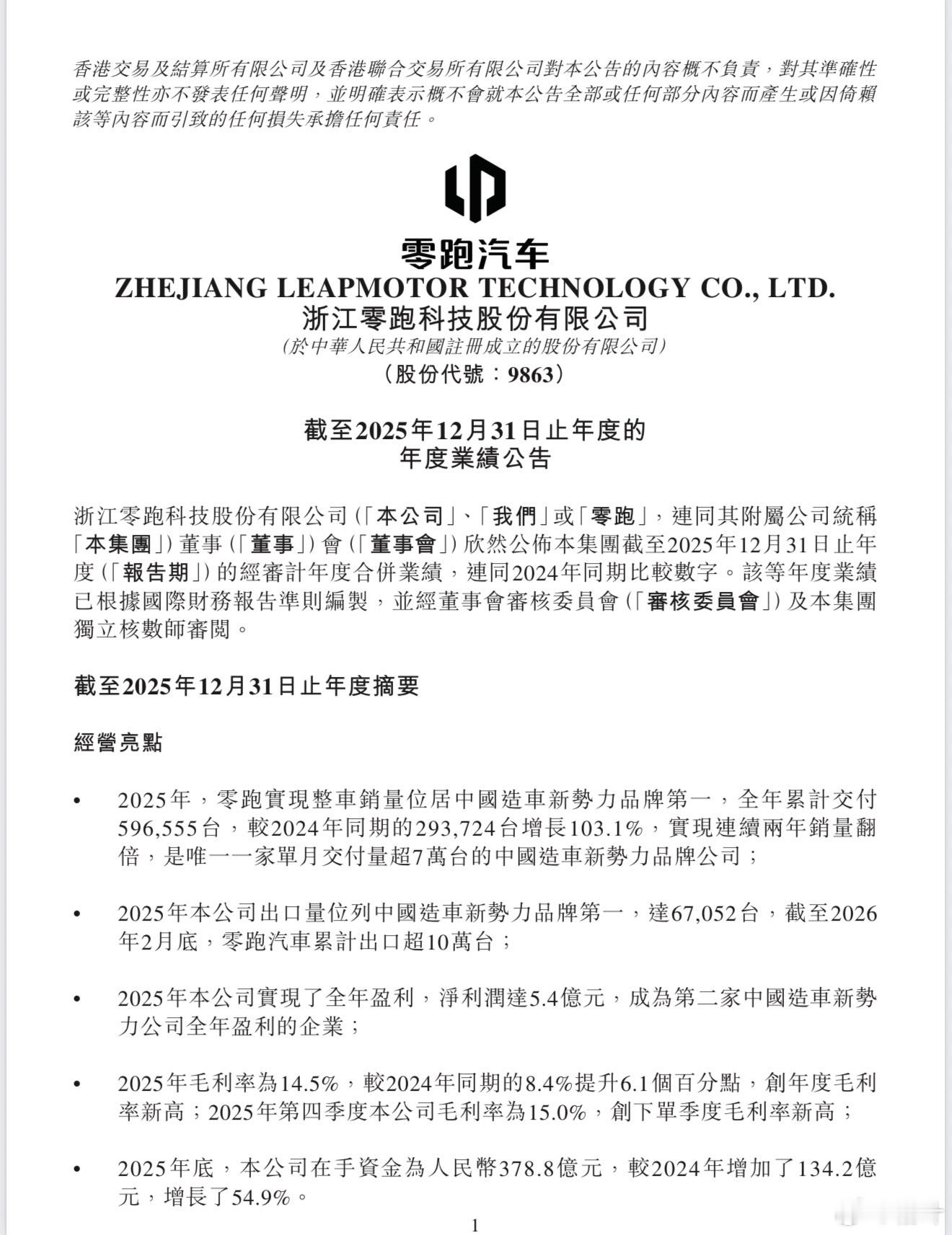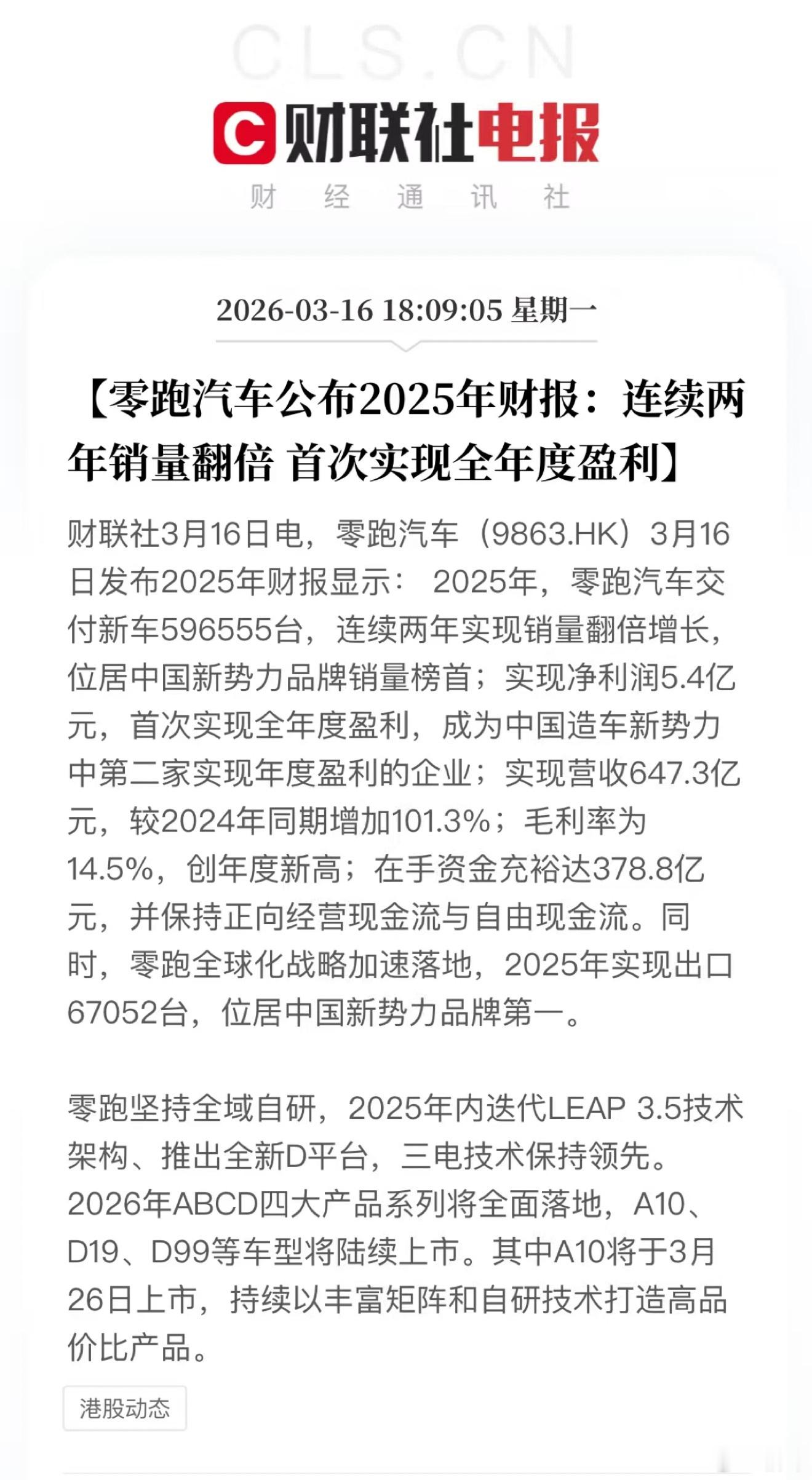 零跑汽车首次实现全年度盈利 3月16日,零跑汽车发布2025年全年财报,交出销量与盈利双丰收的成绩单。全年交付新车596555台,连续两年销量翻倍,位居中国新势力品牌销量榜首,同时也是唯一一家单月交付量超7万的中国造车新势力,全年出口量位列新势力第一,截至2026年2月底累计出口超10万台。财务方面,公司首次实现全年度盈利,净利润5.4亿元,成为中国造车新势力中第二家实现年度盈利的企业,全年营收647.3亿元,同比增长101.3%,毛利率14.5%创年度新高。此外,公司在手资金达378.8亿元,连续两年保持正向经营现金流与自由现金流,正式迈入高质量发展新时代。