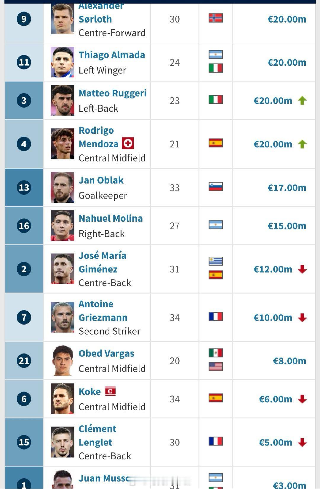 德转更新西甲身价,马竞多人变动,普比尔涨1300万到2800万,卢克曼涨回4000万,汉茨科涨到3500万欧,鲁杰里和门多萨涨到2000万。阿尔瓦雷斯跌1000万到9000万,巴埃纳跌倒4500万。此外,勒诺尔芒2500万,吉梅内斯,格列兹曼,科克和朗格莱身价均有下跌。