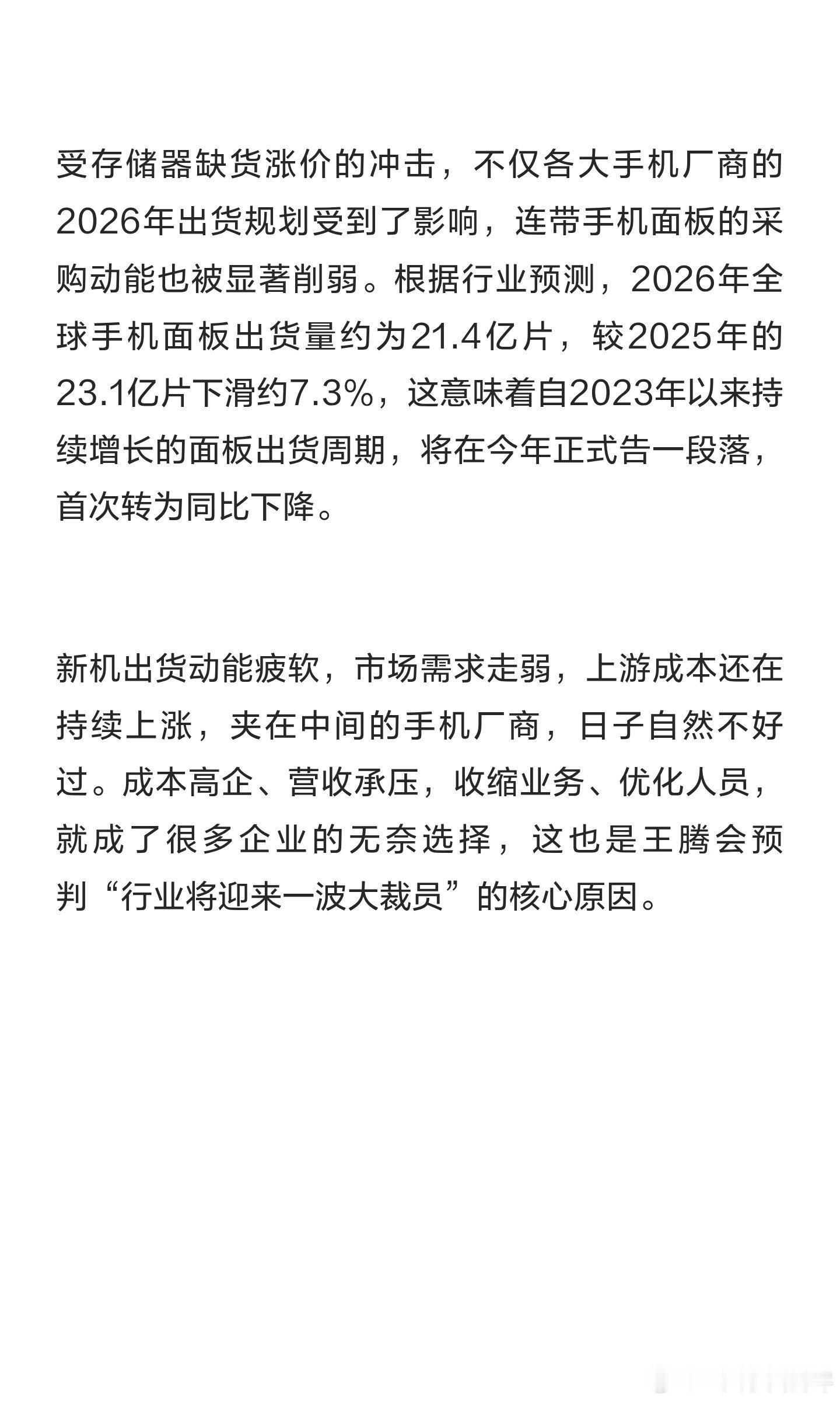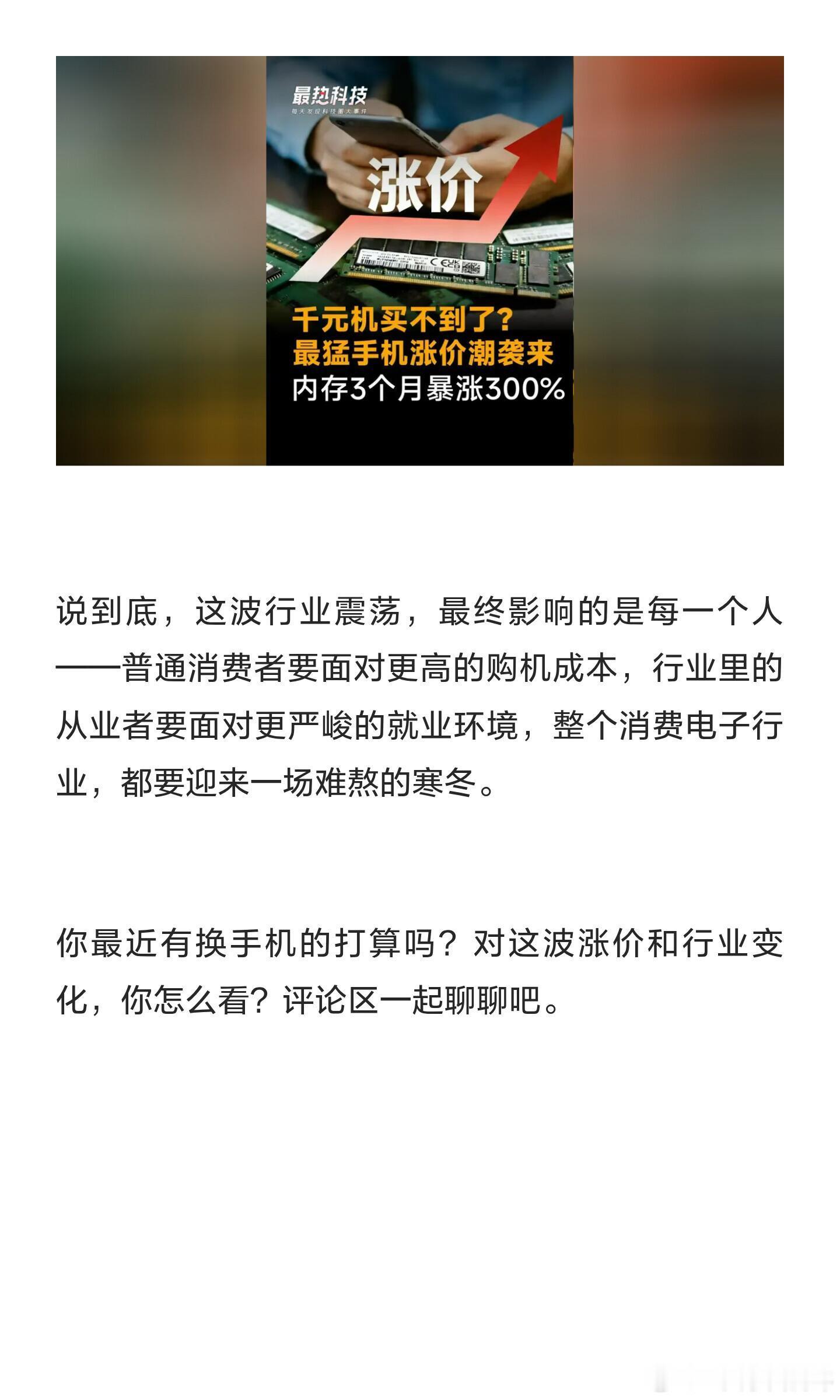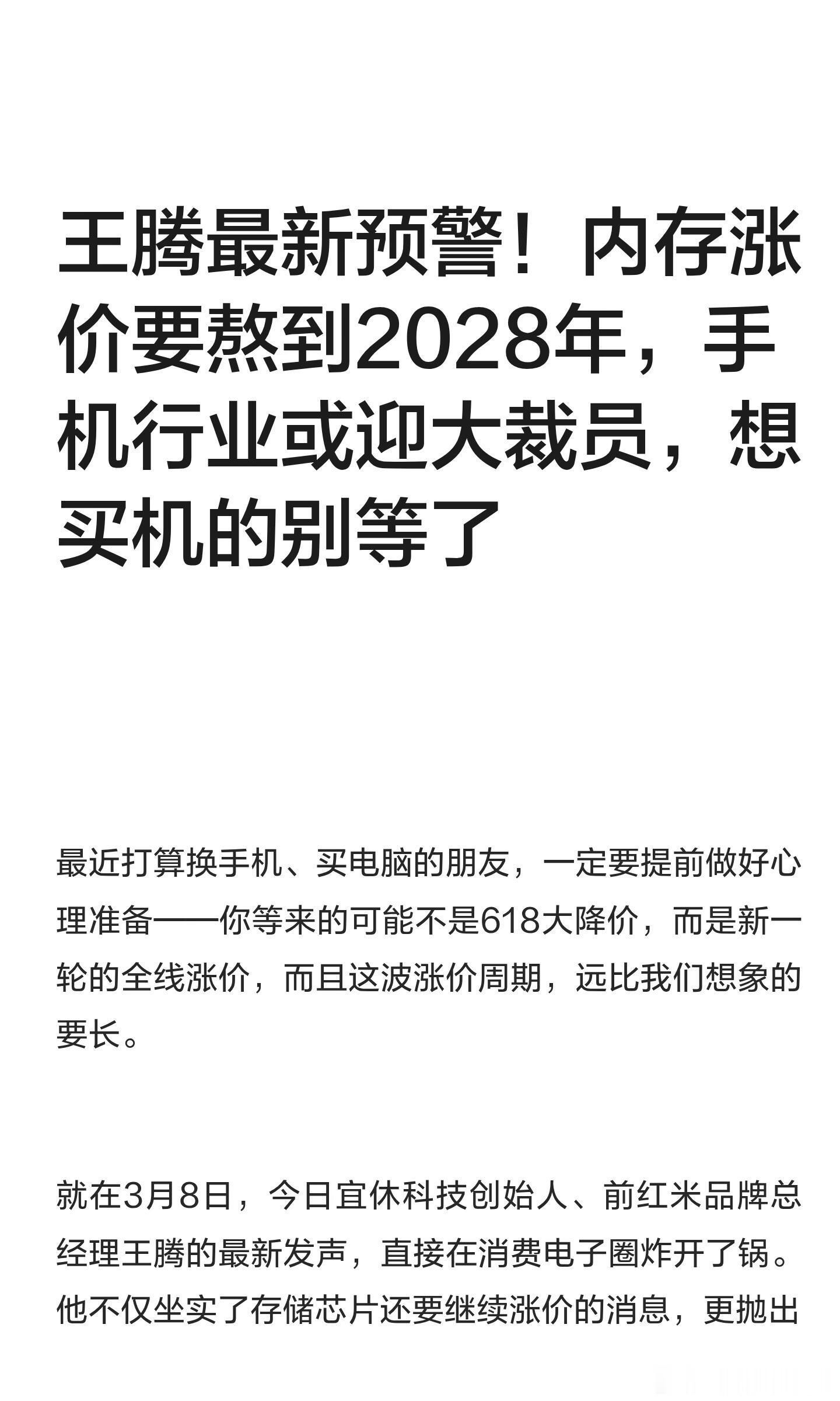 手机电脑迎来涨价潮王腾最新预警!内存涨价要熬到2028年,手机存储芯片涨价潮持续,预计2026年恢复正常,手机、电脑等产品价格将上涨,消费者面临更高成本,行业裁员风险增加,整体进入寒冬。