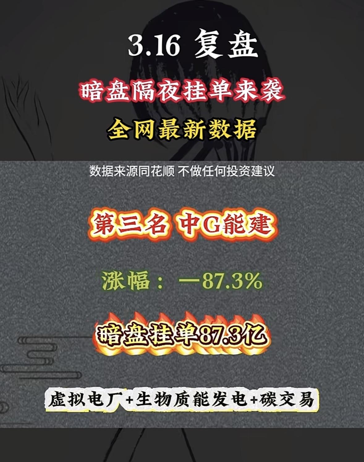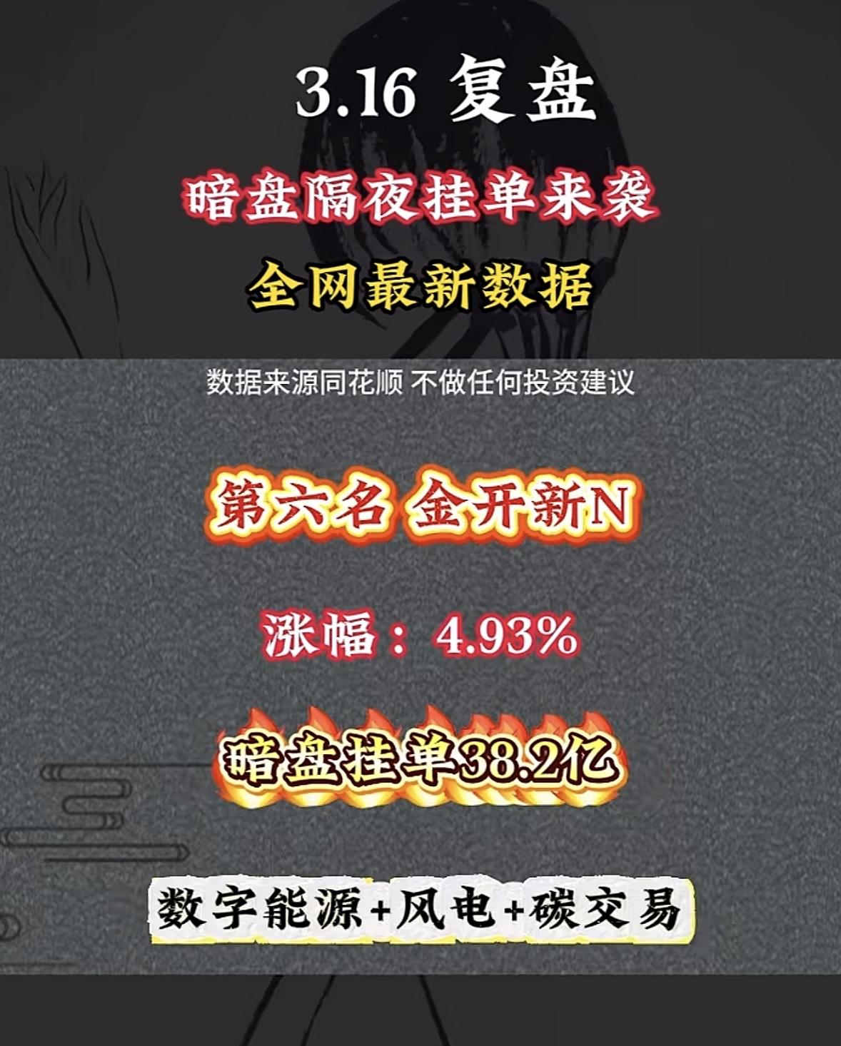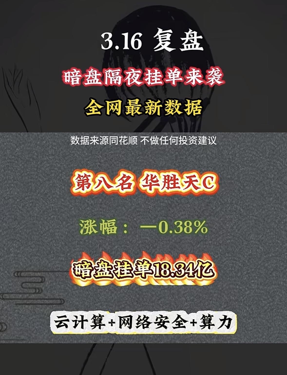 3月17日周二暗盘隔夜挂单排行榜揭晓 华胜天成暗盘来袭,涨幅 -0.38%,暗盘挂单18.34亿,这数据挺值得琢磨。3月3日暗盘隔夜挂单里,华胜天成现价29.98,挂单20.24亿排第八。暗盘隔夜挂单能反映市场资金关注度和预期。像协鑫JC挂单103.52亿居首,利欧GF挂单153.43亿排第二。华胜天C这次挂单量不少,但涨幅为负,说明市场情况复杂。挂单多不代表一定涨,投资还得综合分析,不能光看挂单就冲动入场,得保持理性。