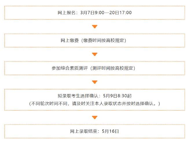 今年的高职提前招生的主要节点有这些:3月7日—20日网上报名;5月5日前由各试点高校组织综合素质测评;5月17日—30日公示录取名单。被高职提前批招生录取后,就不用再参加6月份的高考,也不用参与后续80个志愿的填报工作,可以说提前上岸。