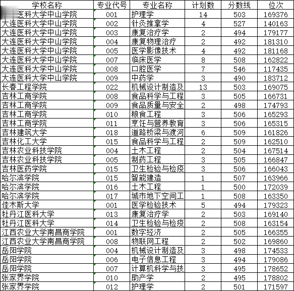 省外来看,也有一些可选的大学。比如大连医科大学中山学院的护理学、康复治疗学、医学影像技术等专业;吉林工商学院的食品科学与工程、食品质量与安全等专业等。