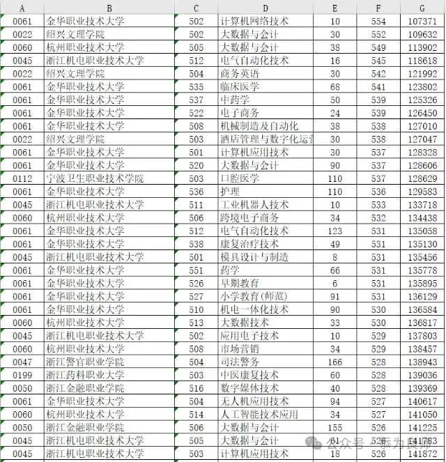 还有一大批高分的高职专业分数线:金华职业技术大学的计算机网络技术专业分数线达到554分。绍兴文理学院(现绍兴大学)的大数据与会计专业达到552分。