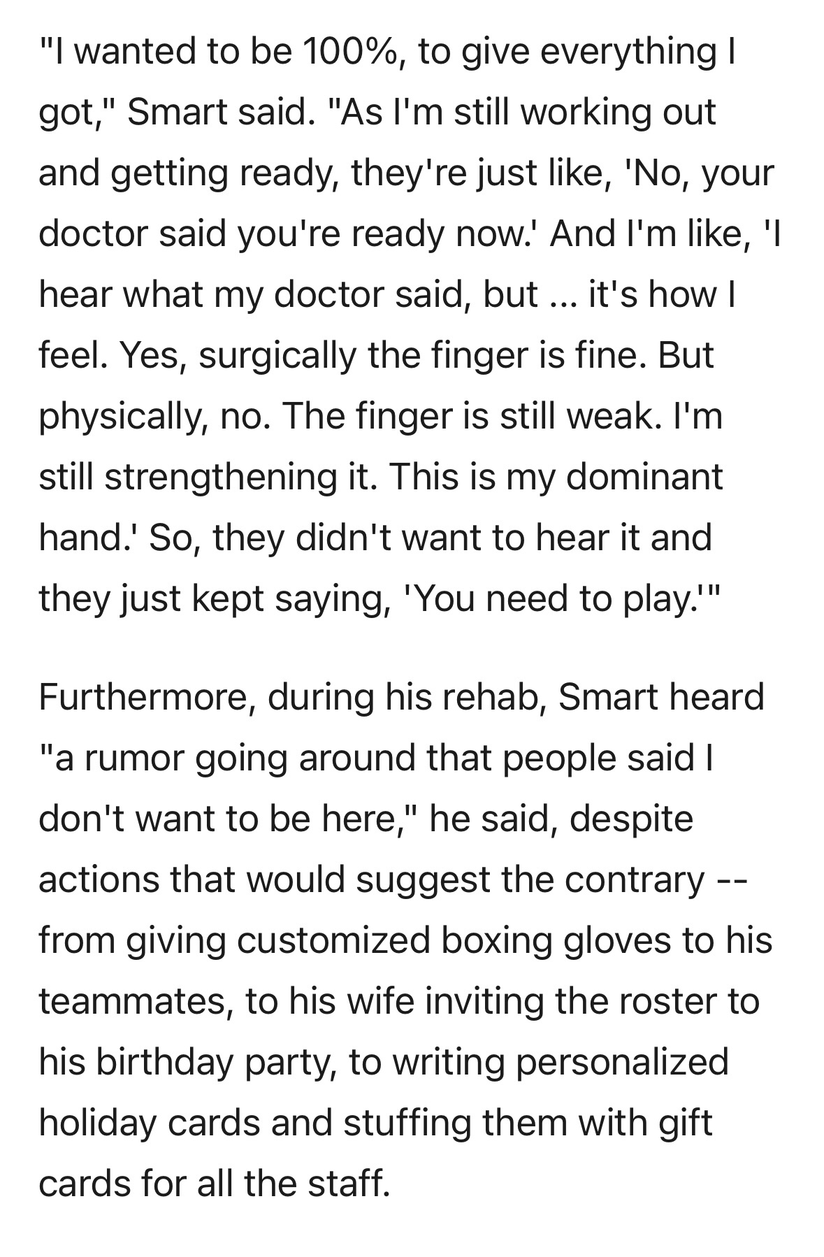 “我想以100%的状态上场,拼尽所有。”斯玛特说,“我还在训练、恢复,他们却只说:‘不行,你的医生说你现在就能打。’我回答:‘我知道医生怎么说,但……这是我身体的感受。手术是好了,但身体上没好。手指还是很弱,我还在强化力量。这是我的惯用手。’”
