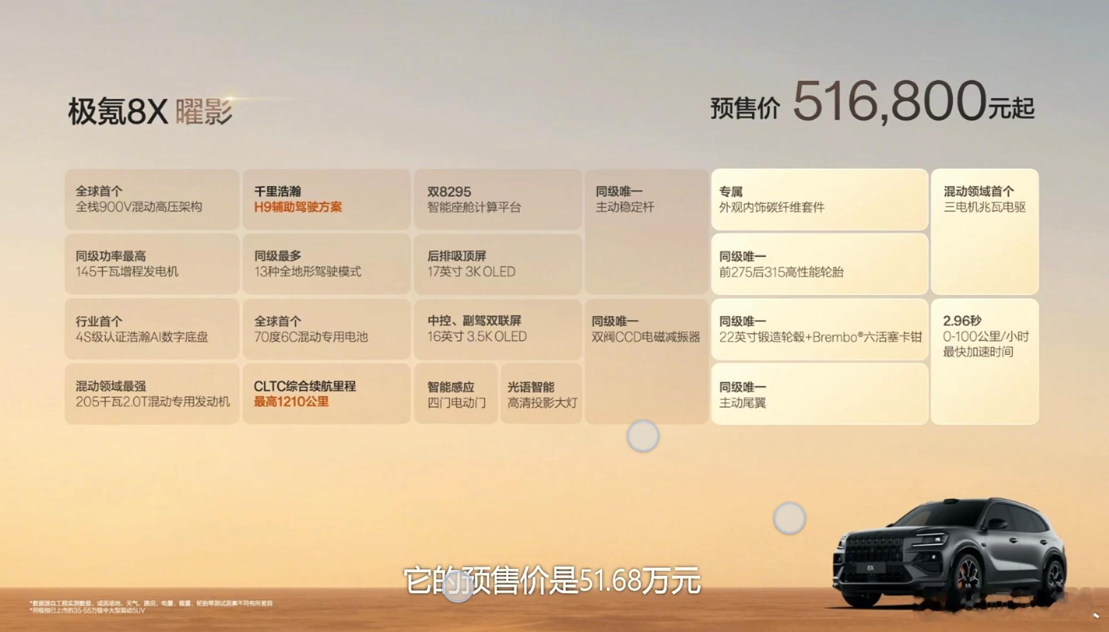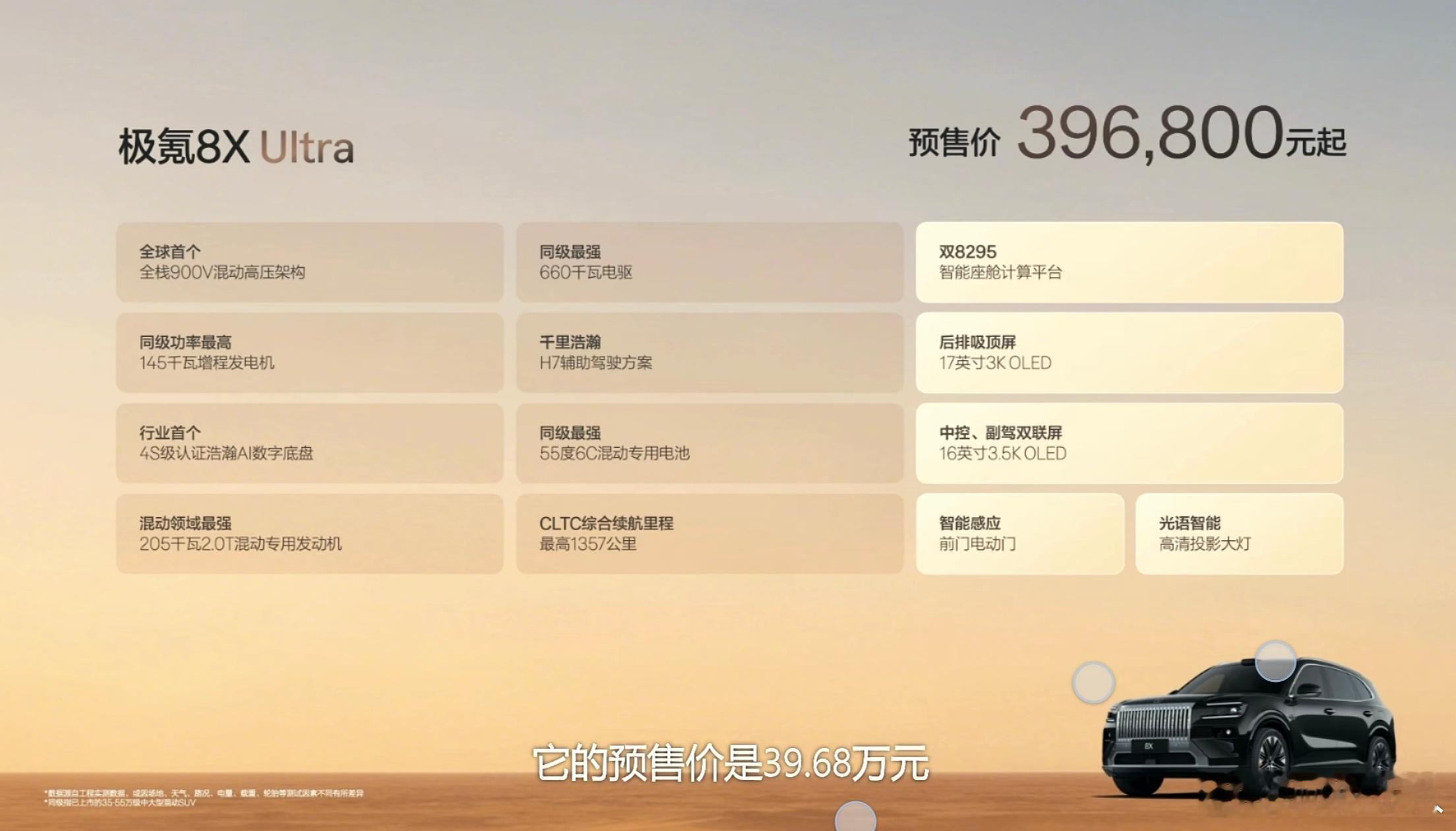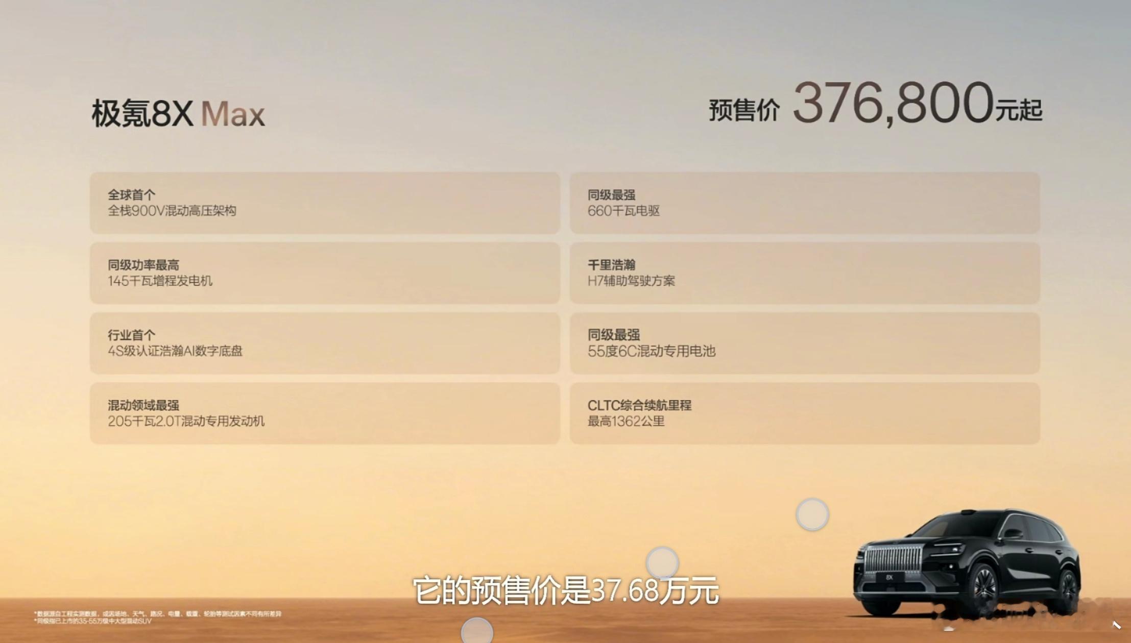 极氪8x37.68万起!基础版双电机四驱660kW,Ultra+版44.68万,70度电池+四门电吸,顶配曜影51.68万直接上三电机兆瓦电驱,2.96秒破百,碳纤维套件+高性能胎,轮胎和宝马X5L一样,前275/后315,大家觉得这个价格怎么样?极氪8x新公路之王极氪8x曜影极氪8X预售37.68万起