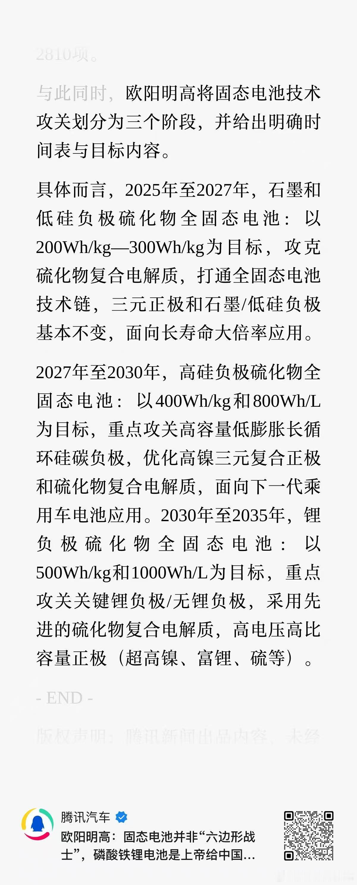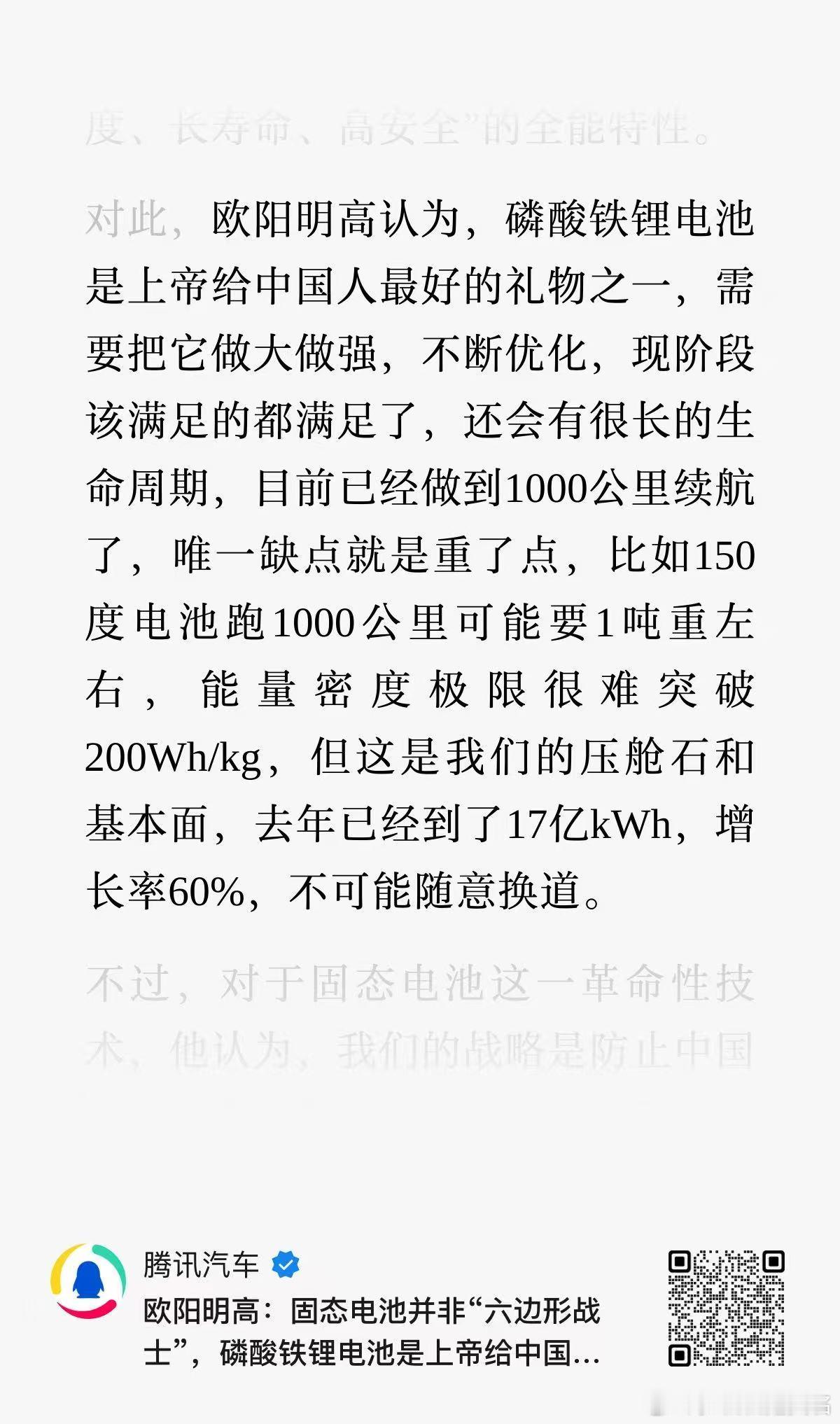 欧阳明高对于固态电池和磷酸铁锂的判断和看法。汽场全开