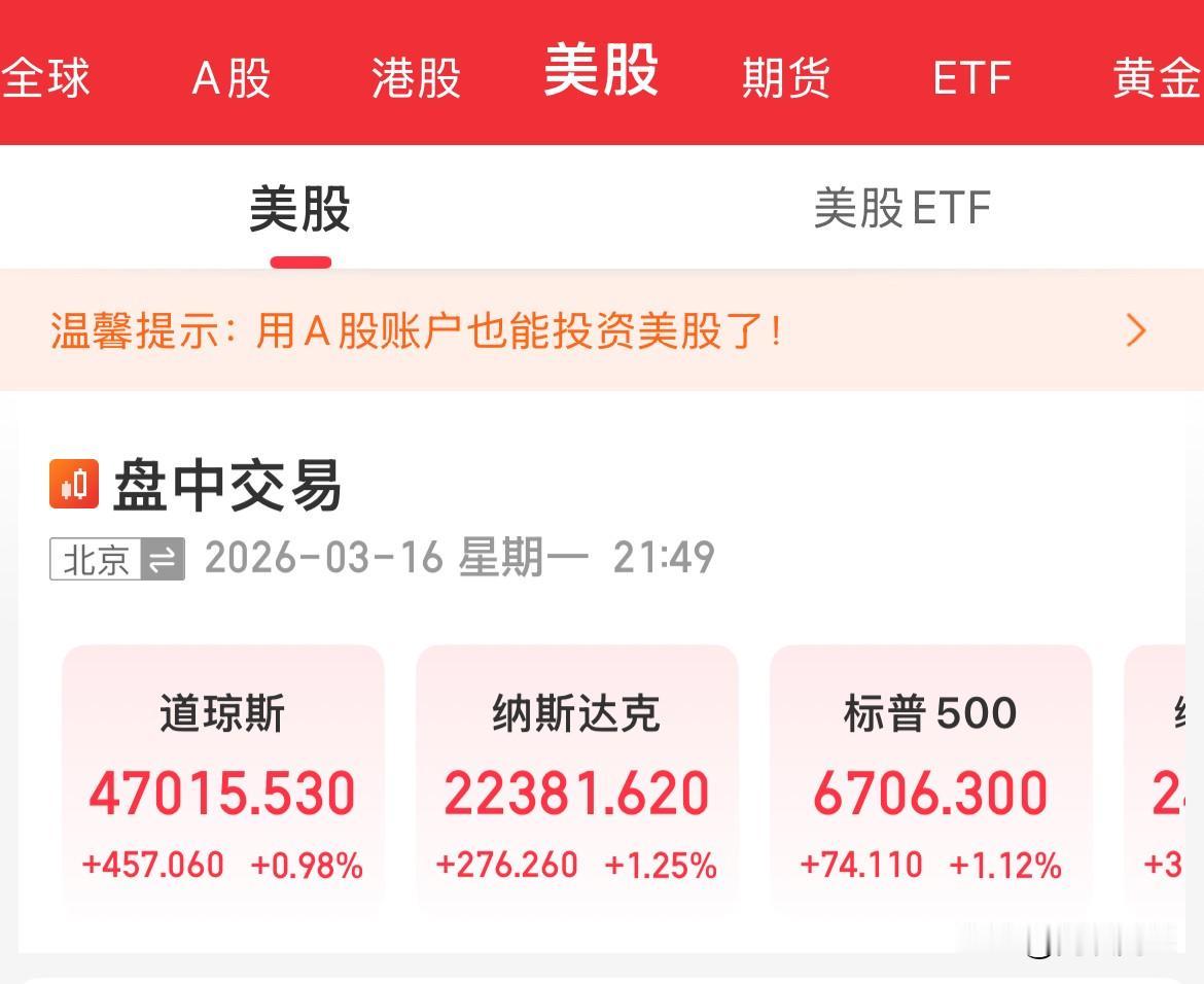 不错的消息!明天有戏了,美股开盘,纳斯金龙中国指数涨幅2%,纳斯达克指数涨幅超1%,原油期货市场全线跳水,黄金拉升,美元跳水 原油跳水,市场情绪回暖,美股三大指数全线高开,纳指涨幅超1%,热门科技股英伟达涨幅超2%,全球关注英伟达即将拉开的年度GTC大会, 原油市场全线跳水,!布伦特原油期货从高点106美元/桶跳水至101美元/桶,市场对油轮通过霍尔木兹海峡抱有希望,情绪有所回暖, 美元指数跳水,再度失守100,跌幅0.47%,非美货币震荡走高,人民币涨幅0.27%,报6.88,现货黄金重回5000美元/盎司,站上5030美元/盎司,现货白银涨幅1.41%,重回81美元/盎司, 纳指金龙中国指数走高涨幅1.97%,A50期货夜盘涨幅0.14%,恒生指数期货拉升涨幅0.73%, 外围回暖,缓和市场担忧情绪,明天回回血,毕竟下午后面已经V起来了,涨幅居前的还是存储芯片,科技方面的。