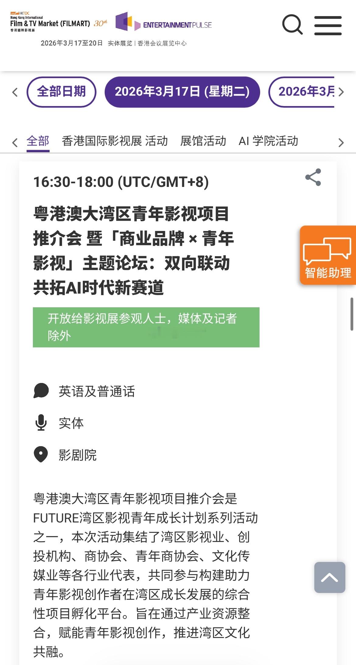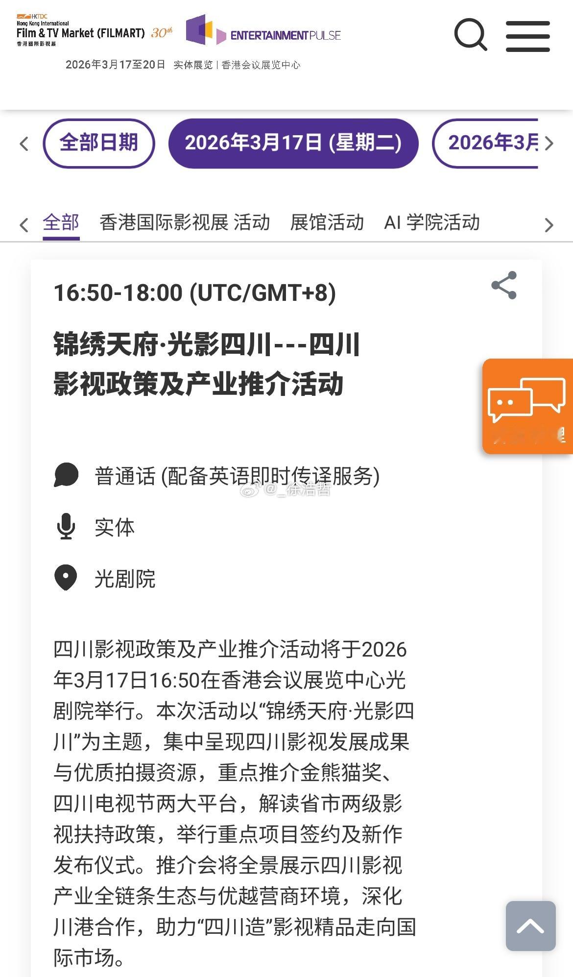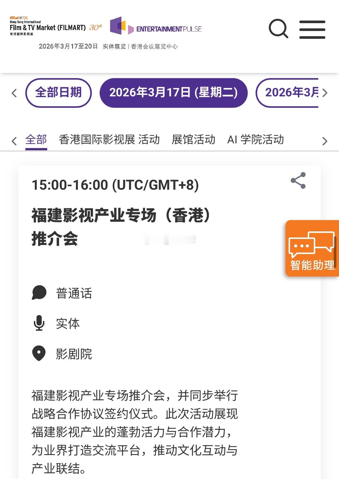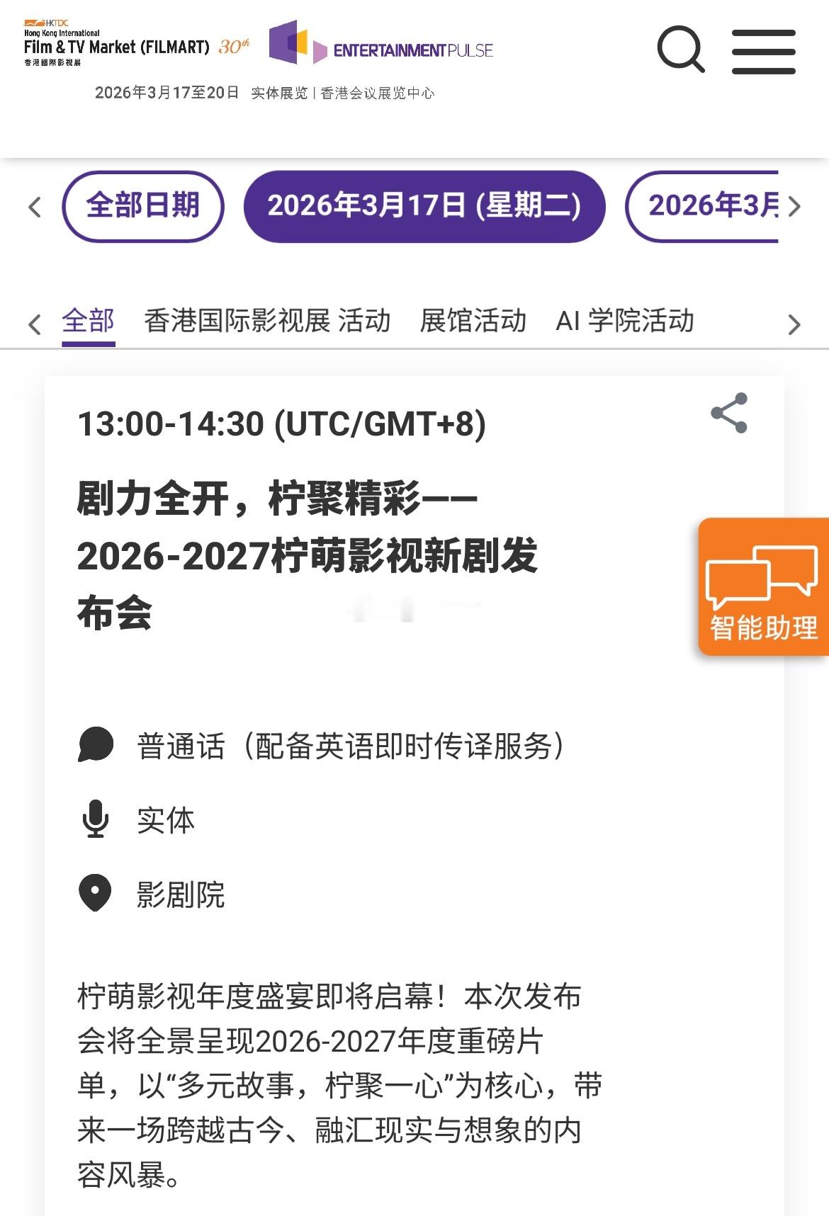 3.17一些值得关注的活动如下:13:00-14:30 剧力全开,柠聚精彩--2026-2027柠萌影视新剧发布会15:00-16:00 福建影视产业专场(香港)推介会16:30-18:00 粵港澳大湾区青年影视项目推介会17:00-18:00 《大圣崛起》动画电影及IP衍生业务全球发布会