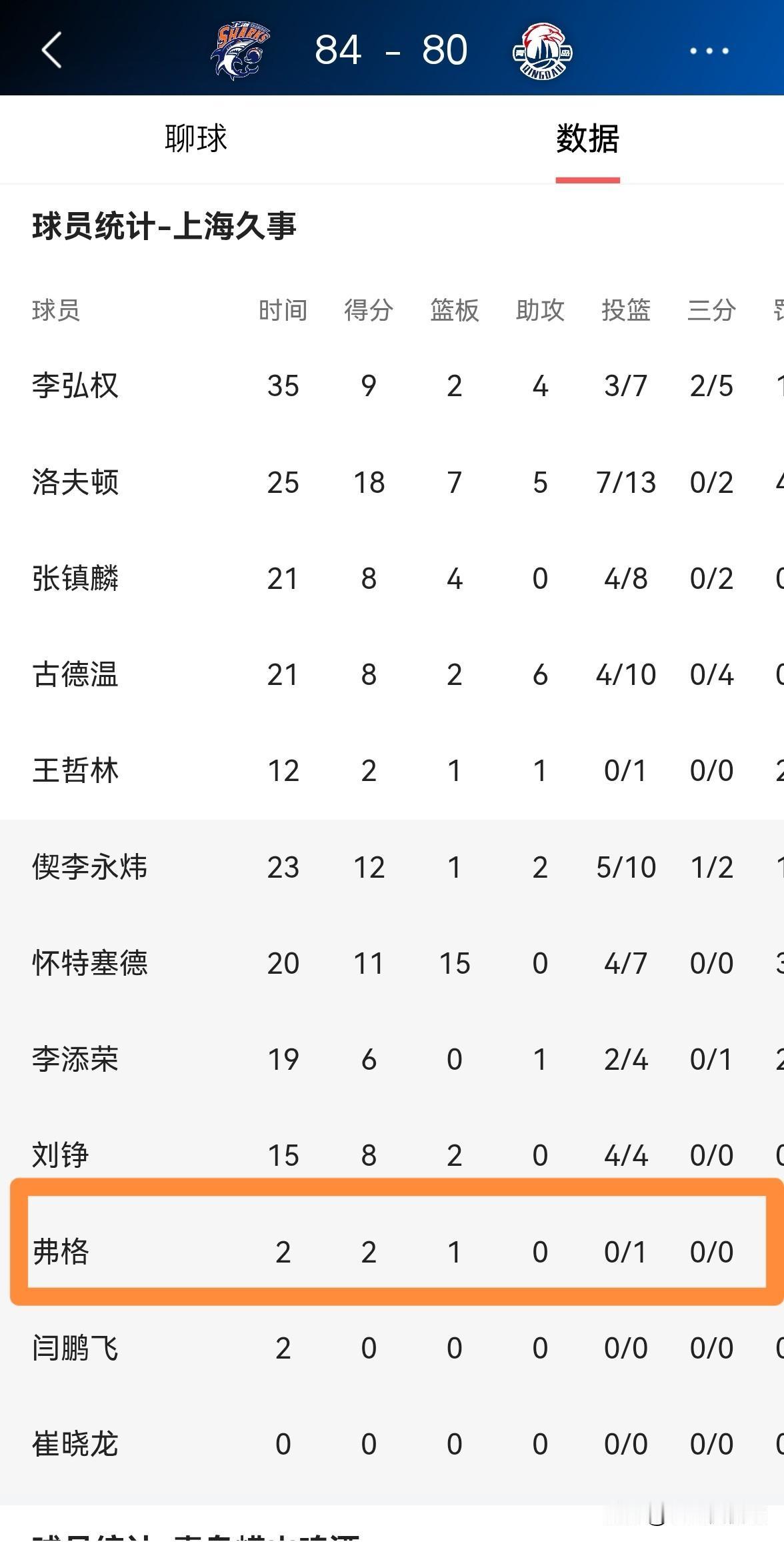 上海久事老将弗格真是彻底的凉凉了!在今天上海久事主场以84:80击败青岛崂山啤酒的比赛中,弗格仅仅得到了2分钟的上场时间,基本上处于被弃用的状态。 整场比赛下来,弗格替补出战2分钟,投篮1中0,其中罚球2中2得到2分,还有1次失误和2次犯规,他的场上正负值为-4。 以我的拙见来看,以目前的情况来看,等本赛季结束以后,弗格很有可能会彻底的告别CBA赛场了。