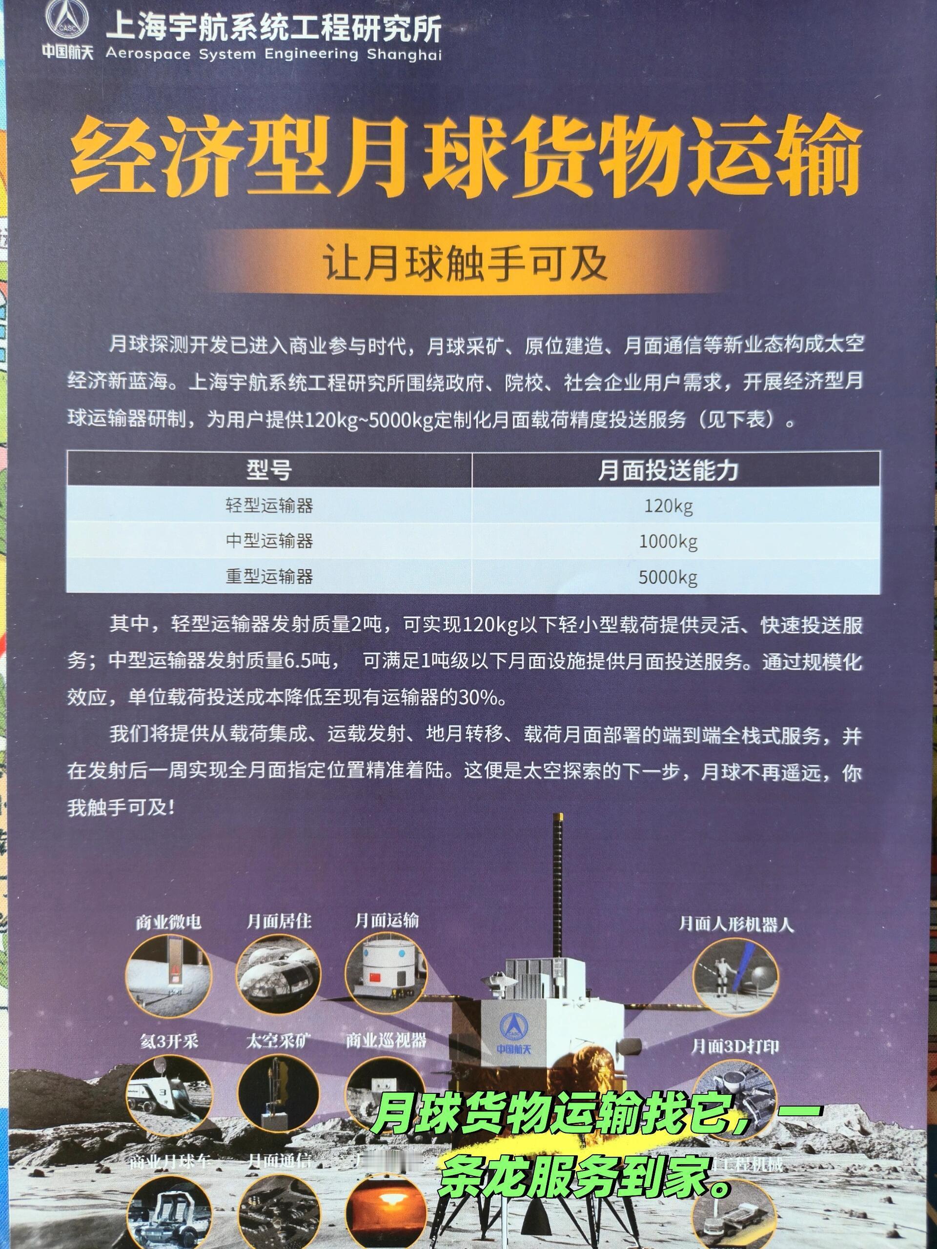 【经济型月球货物运输器】国内首个采用液氧甲烷动力的月球着陆器——经济型月球货物运输系统,由航天八院805所抓总研制,可为用户提供120kg~5000kg定制化月面载荷精度投送服务,规划有轻型运输器、中型运输器、重型运输器三种型号。目前,演示平台已完成地面起飞、悬停避障、着陆飞行试验。