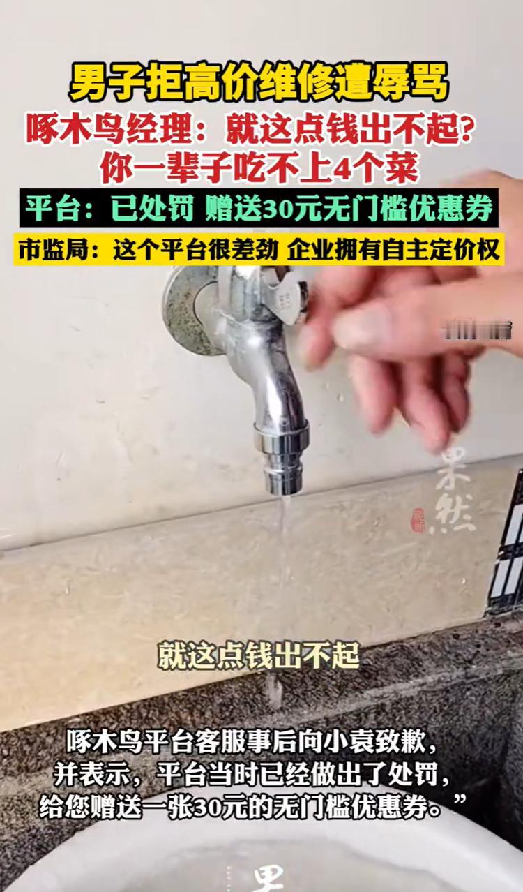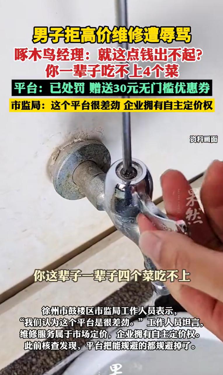 江苏徐州,一男子家里水龙头漏水,他自个儿买好材料,在某平台叫了师傅上门。心想东西都备齐了,师傅来搭把手,百八十块钱顶天了。结果师傅进门报价250,抹去零头也要220。男子觉得太冤,干脆不修了,让师傅走人。本以为这事翻篇了,谁承想师傅折返回来,递过手机让接电话,平台经理在电话那头张嘴就骂:“二百多块都掏不起,你一辈子吃不上四个菜!”男子拿着手机,越想越窝火,去市监局投诉了。没想到,市监局一句话,让男子整个人愣在原地。   那天傍晚,小袁下班回家,刚进厨房就感觉脚底下一凉。   低头一看,好家伙,地板砖上已经汪了一摊水,再一瞅,是水龙头接口那儿正往外滋水呢。也顾不上换鞋了,他赶紧先把总阀给拧死了。   小袁这个人,过日子还是比较仔细的,他没直接打电话叫维修,而是自己骑车去了趟五金店,花几十块钱买了个新水龙头。   东西备齐了,就差个师傅上门给装上。   他想啊,这活儿简单,材料我自己出的,师傅来也就是出个手工费,顶多百八十块钱撑死了。   打开手机,在某平台上下了单。   没过多久,一个穿着工装的师傅敲门进来了。   师傅进门扫了一眼,也没多说话,从包里掏出工具比划了两下,然后抬起头,张嘴报了个价:“师傅,这个活儿,250块钱。”   小袁一听,脑袋嗡的一下。   他以为自己听错了,又问了一遍:“多少?我就换个水龙头,东西都是现成的,您就帮把手装上,两百五?”   师傅倒也干脆,可能看小袁脸色不对,立马接了一句:“你要是觉得贵,我给你便宜点,220,不能再低了。”   小袁心里那个堵啊,他不是出不起这二百来块钱,就是觉得这钱花得太冤了。   他摆了摆手,态度很坚决:“算了算了,我不修了,您请回吧。”   师傅也没多说,收拾东西就走了。   小袁关上门,一边拿拖把收拾地上的残局,一边还自己嘀咕,就当叫人来量了个尺寸,虽然憋气,但也犯不上跟人吵架。   本以为这事儿就这么翻篇了,可谁能想到,这才是个开头。   师傅走了也就两三分钟,小袁家的门又“咚咚咚”被敲响了。   开门一看,还是刚才那个维修师傅,站在门口没进来,手里举着个手机,屏幕朝外,递到小袁跟前,闷声闷气地说:“我们经理电话,让你接一下。”   小袁当时有点懵,也没多想,迷迷糊糊就把手机接了过来。   刚“喂”了一声,电话那头就跟点了炮仗似的,一个男人的声音炸开了,那语气,横得不行,开口就是损人:   “就你这经济条件,还点上门维修呢?二百多块钱都拿不出来,你一辈子也吃不上四个菜!”   小袁拿着电话,整个人都愣住了。   还没等小袁回过神来还嘴,对方“啪”的一声把电话挂了。   师傅拿回手机,转身就走,留下小袁一个人站在门口,气得手都在抖。   这事儿放在谁身上能忍?小袁后来越想越气,拿起电话就投诉到了市场监管部门。   工作人员听了事情经过,又联系了平台那边核实。   最后反馈给小袁的时候,工作人员也忍不住在电话里叹了口气,说了句大实话:“实话跟您说,我们听了这事儿,也认为这个平台确实差劲。但是……”   工作人员解释说,维修服务这个行业,价格是放开的,属于市场调节价,不像药品、水电那样有政府定价。   人家师傅报价高,你可以不修,只要他提前跟你说清楚了,没藏着掖着,这就够不上价格欺诈,没办法。   说实话,明码标价没毛病,嫌贵不修就完了,买卖不成仁义在。   《价格法》第六条规定,商品价格和服务价格,除依照本法第十八条规定适用政府指导价或者政府定价外,实行市场调节价,由经营者依照本法自主制定。   本案中,家用电器维修服务不属于政府定价或政府指导价范畴,属于完全的市场调节价。   因此,平台或维修师傅有权根据自身技术、工时、运营成本等因素自主定价。   而根据 《中华人民共和国价格法》第十三条及 《明码标价和禁止价格欺诈规定》第五条,经营者销售商品和提供服务,应当明码标价。   在本案中,师傅上门后明确告知了维修费用为220元,这属于在服务开始前履行了告知义务。   小袁作为消费者,在得知价格后享有自主选择权,即选择接受服务或拒绝服务。   但单纯的价格高低属于市场博弈范畴,若无证据证明该价格存在虚构原价、谎称打折等情节,则难以被认定为法律意义上的欺诈。   不过,电话中的平台经理对小袁进行了人格侮辱,称其“没钱点什么上门维修”、“一辈子吃不上四个菜”,涉嫌治安违法,即便不构成,也属于民事侵权。   结合《治安管理处罚法》,小袁可以选择报警,由公安机关介入调查,一旦查实有公然侮辱行为,则平台经理面临罚款甚至拘留处罚。   此外,平台经理的行为至少符合侵权性质,结合侵权法律规定,小袁有权主张赔礼道歉等侵权责任。   而平台作为用人单位,基于替代责任规则,亦可能成为被诉对象。   对此,你怎么看?