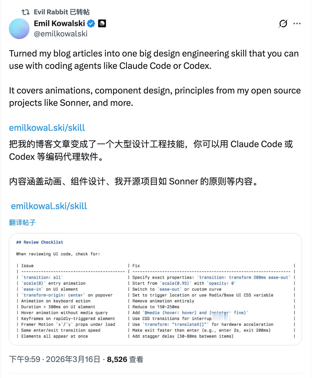 Linear 老哥把自己的博客文章都做成了 skills涵盖动画、设计、代码、性