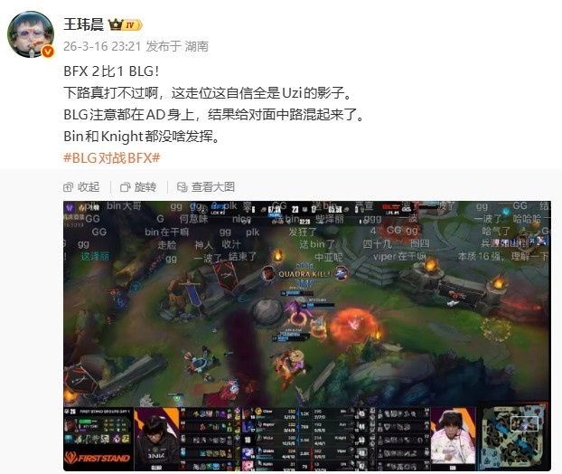 媒体人:BLG注意AD上结果给中路混起来了 Bin和Knight都没啥发挥