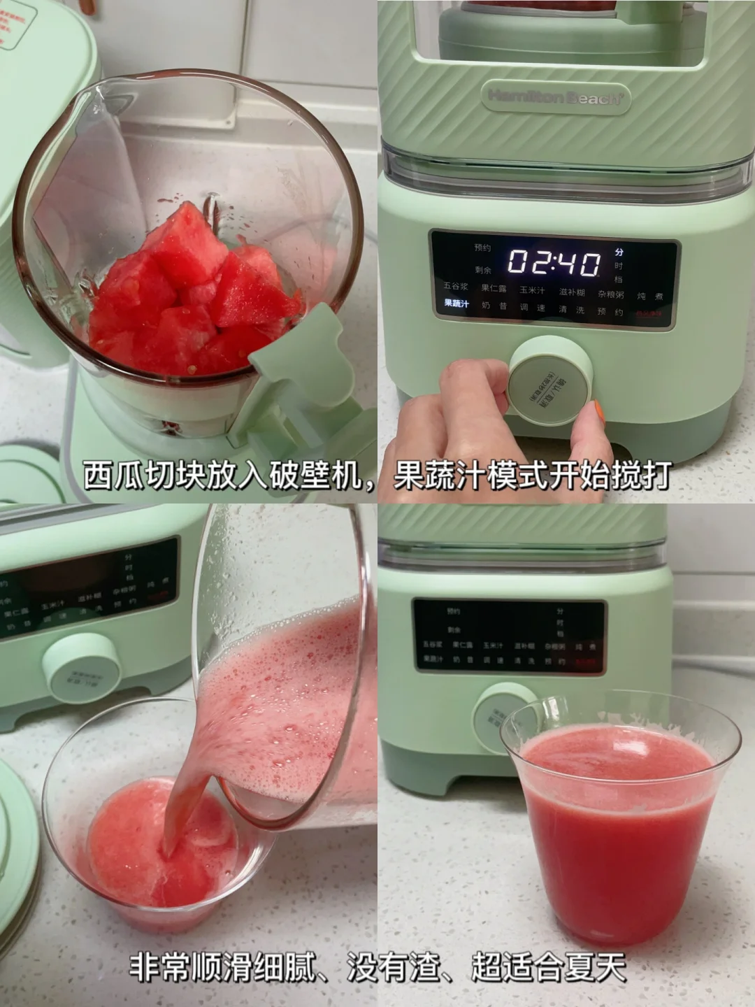 🍀今天的餐就比较清爽了,除了一道水煮牛蛙用来解解馋,其他都相对清淡些。一个西瓜篮子配一碗杨枝甘露就让我很满足了。正好用的是刚到的汉美驰破壁机,牛油果绿的机器也正适合夏天,做出的杨枝甘露非常细腻。让我很惊喜的是它带一个加厚减震隔音仓,操作全程没有尖锐的噪音。用完直接可以一键清洗,还带一个净味烘干盒,清洁后能快速除菌烘干,真是集颜值和便捷于一体呀[赞R]