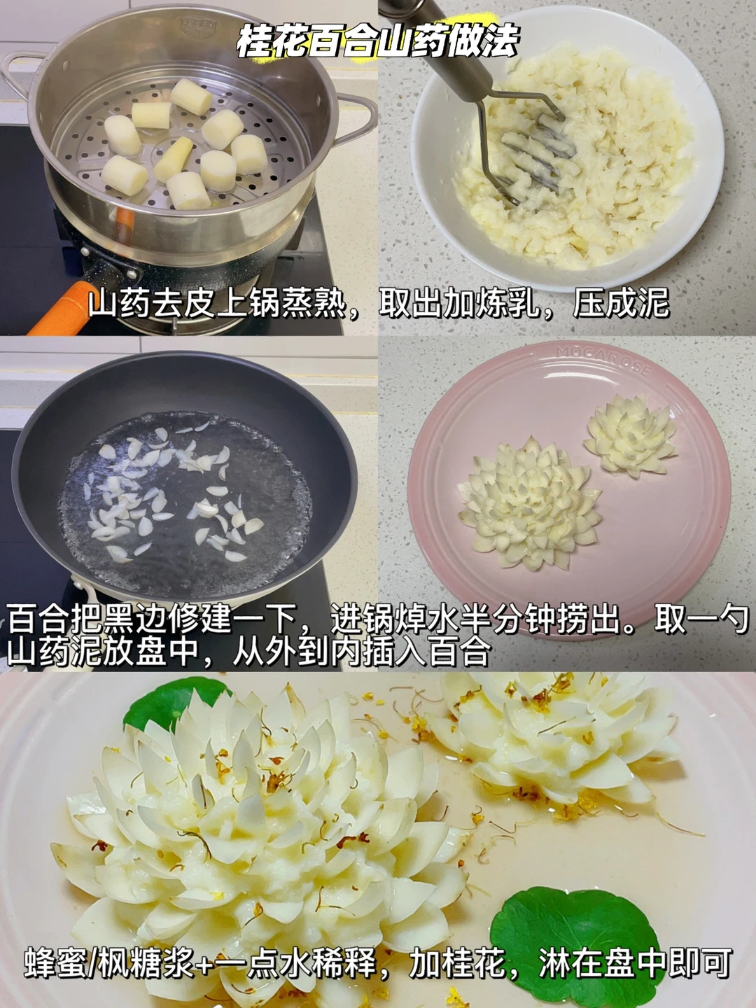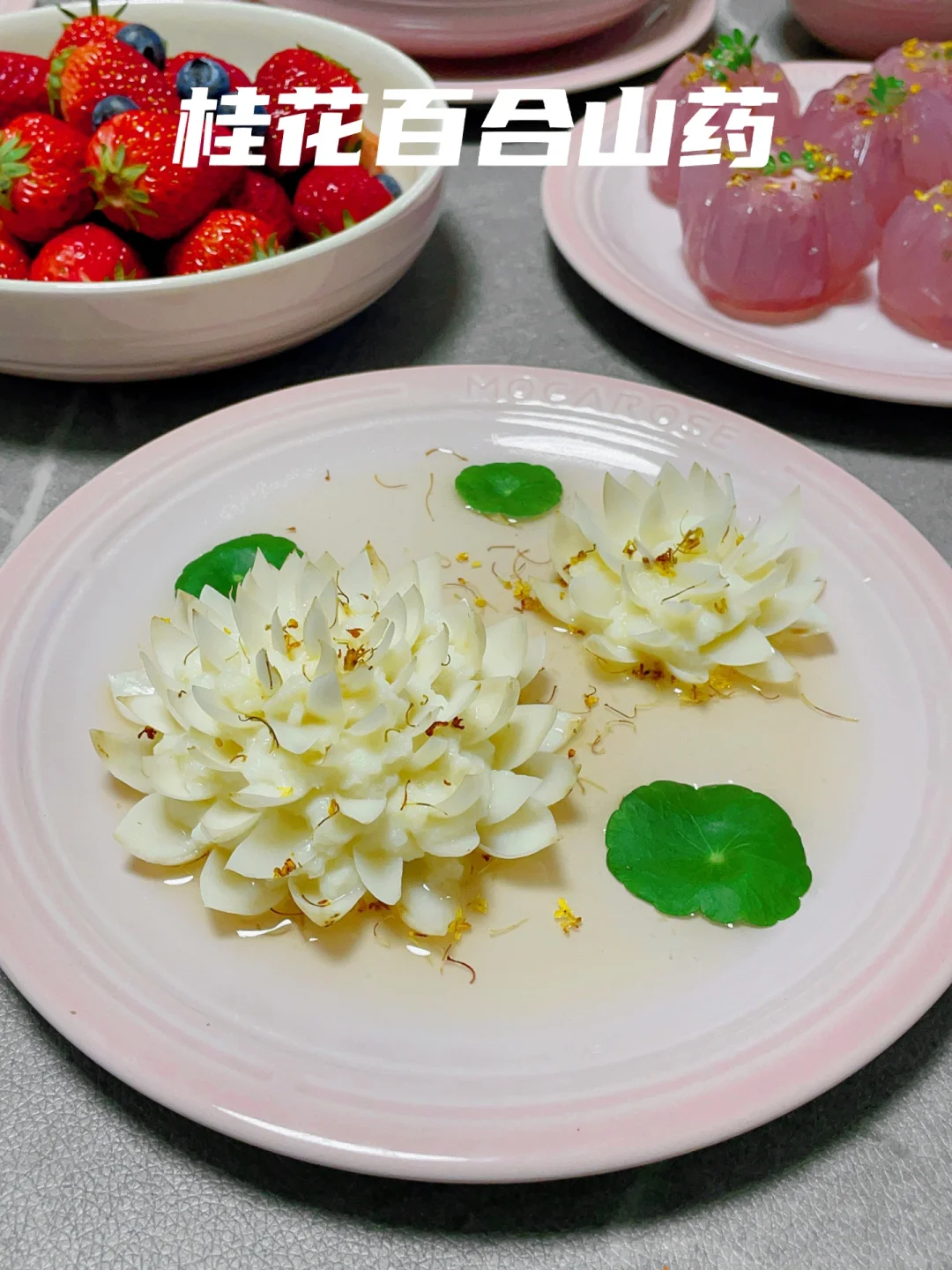 2、之前做的百合酿虾滑得到大家喜爱,今天做的桂花百合山药、也是一个清爽的春日小菜。制作时百合不要焯太久不然会软,淋上桂花糖浆、花香四溢~