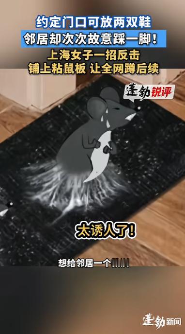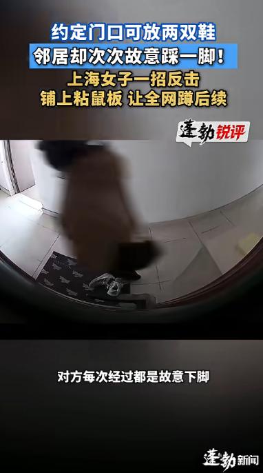 近日,上海,一女子发现自己摆在门口的鞋子上,总有脚印,查看门铃记录后,才发现是邻居每次路过都要故意踩上去,女子十分生气,在网上买了粘鼠板铺在门口,打算给邻居一点教训!网友:这脚也太欠了! 事情发生在上海的一个小区里。女子平时习惯把常穿的鞋子放在家门口,一开始她只是发现鞋子上偶尔会有脏印子,没太在意,以为是有人不小心蹭到。 可时间一长,她发现不对劲,尤其是那双白鞋,上面的黑脚印越来越频繁,几乎每天都有,明显不是意外,为了弄清楚到底是谁干的,她查看了门口的门铃监控记录。 监控画面里看得很清楚,每次邻居路过她家门前,都会特意停下脚步,然后抬脚往她放在地上的鞋子上踩一脚,动作很刻意,踩完就像没事人一样继续走,女子这才明白,之前的脚印全是邻居故意弄的。 更让她生气的是,她和邻居之前有过约定,门口可以放两双鞋,事发时她门口只摆了一双,完全没超出约定范围,邻居却还是反复踩踏。 女子心里很窝火,好好的鞋子被人反复糟践,换谁都忍不了。她没有直接上门争吵,而是决定用自己的方式解决问题。 她在网上买了粘鼠板,收到后就铺在了门口的鞋垫上,粘鼠板看着和普通脚垫差不多,但粘性很强,谁踩上去都很难挣脱。 她的想法很简单,既然邻居不尊重别人的东西,那就让对方尝尝被粘住的滋味,给对方一个教训,让对方知道这种行为不对。 这件事被女子发到网上后,很快就引起了网友的关注和讨论,很多网友都觉得邻居的行为太过分,故意踩别人鞋子的做法确实不妥,纷纷评论“这脚也太欠了”,支持女子的做法,想看看后续邻居会不会收敛。 也有一部分网友觉得,邻里之间抬头不见低头见,为了一双鞋闹成这样,可能会让以后的关系更僵,觉得没必要用这种方式解决问题,目前这件事还没有后续的官方通报,大家都在关注后续发展。 邻里之间相处,互相尊重是基本的,遇到矛盾还是应该多沟通,用合理的方式解决,避免小事闹大,影响彼此的生活。 以上都是个人观点,对此您有什么不同的看法,可以在评论区留言讨论!!!