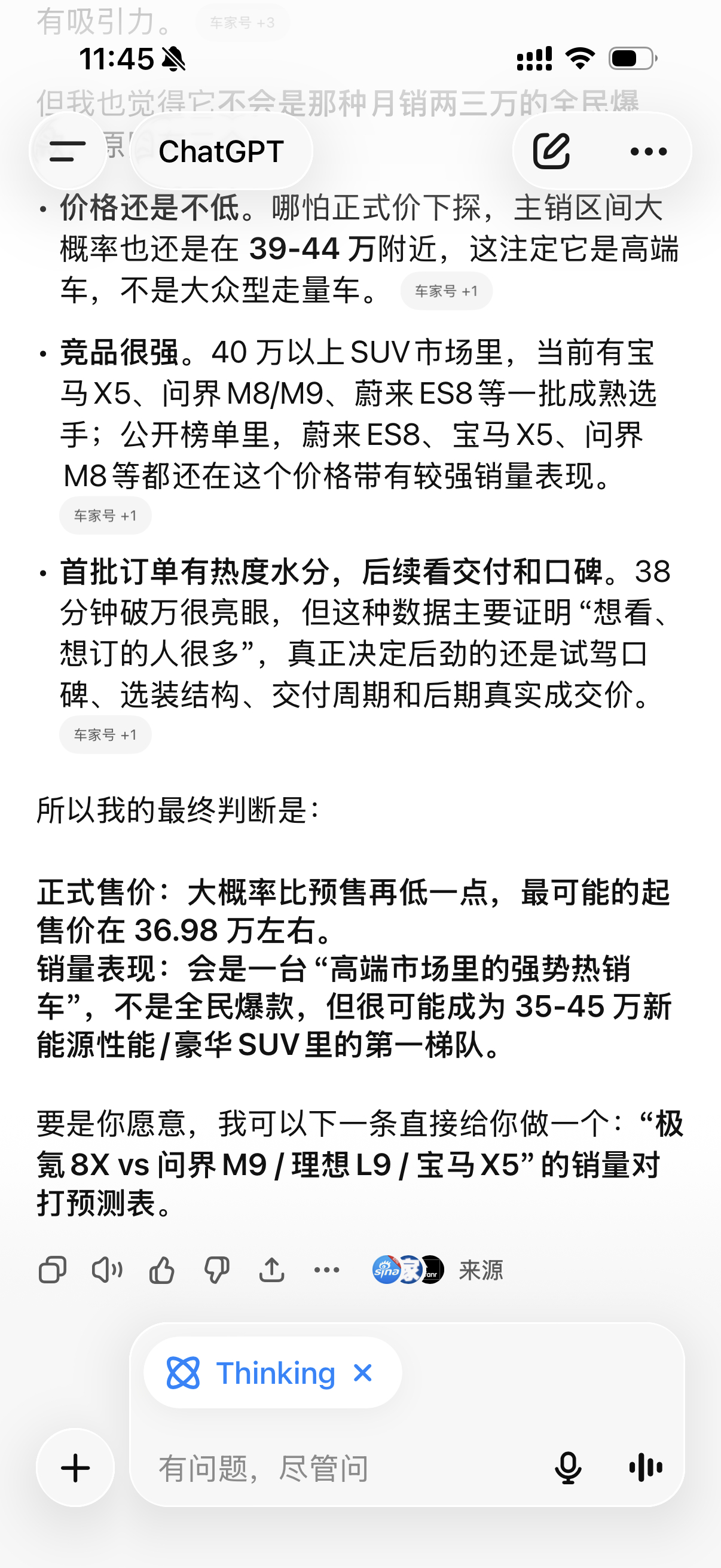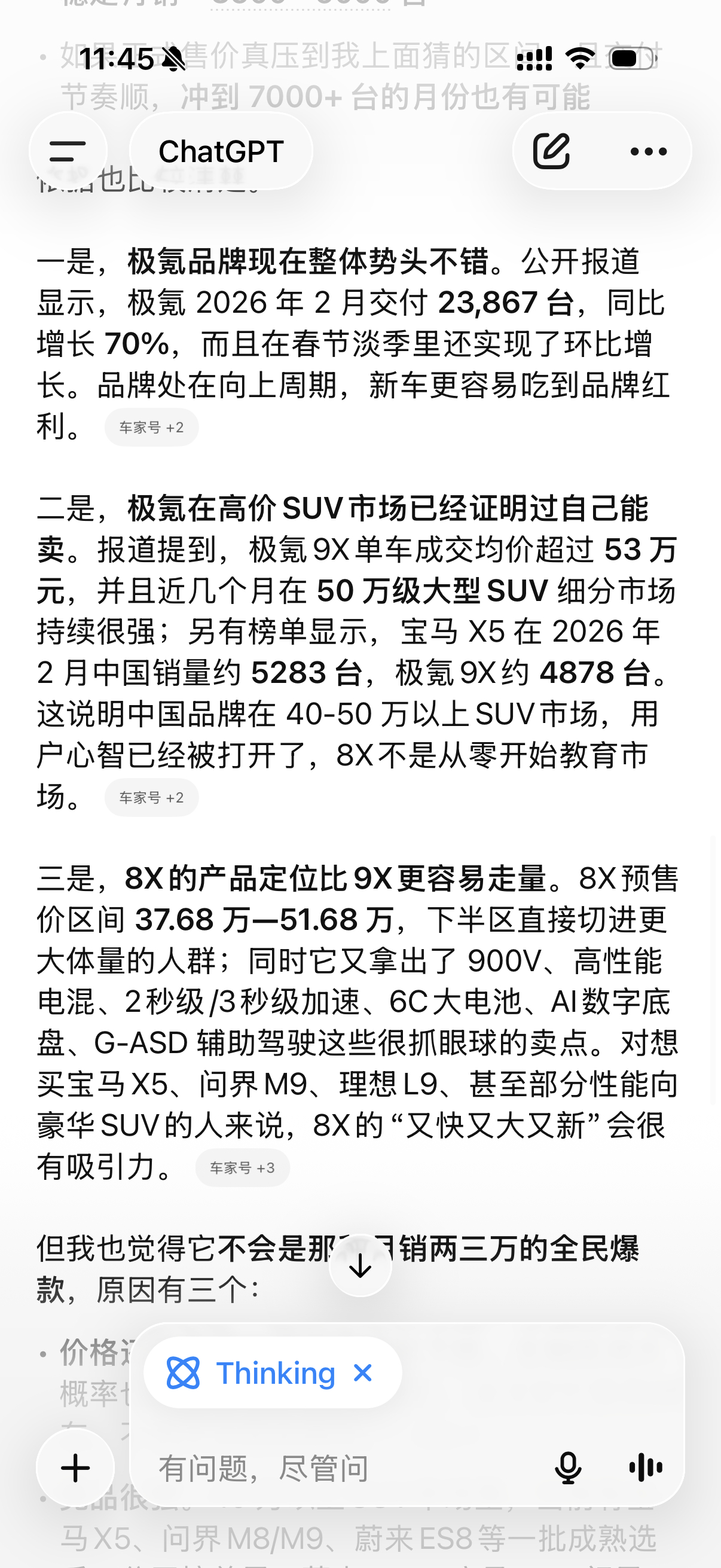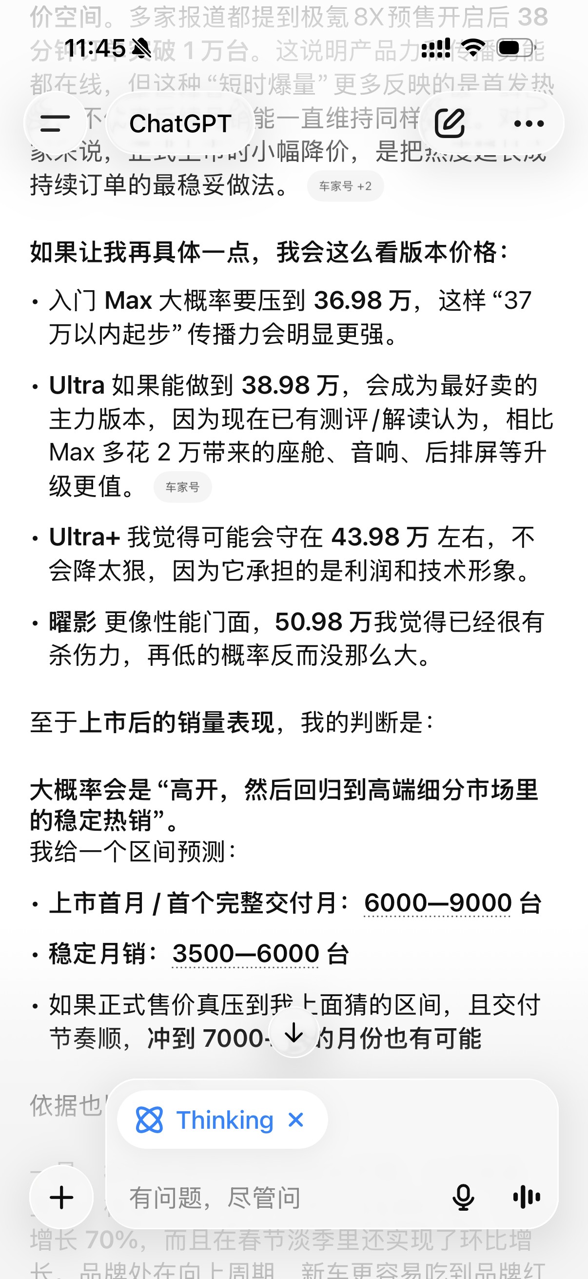问了下 ChatGPT,预测极氪8X 的正式价格和销量表现,回答的咋样,我觉得还