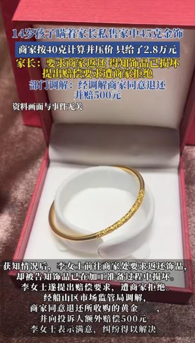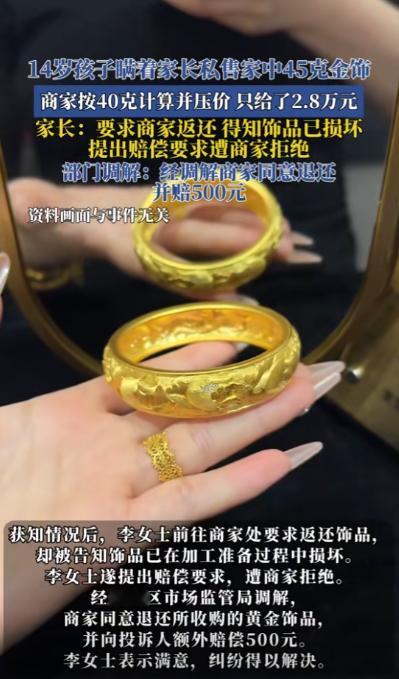 “啥钱都敢挣!”近日,四川遂宁,一14岁男孩背着父母,将家中45克重的黄金饰品拿去变卖,商家在回收时,不仅按40克回收,还压低价格,家长知道后,要求商家返还饰品,被告知饰品在加工过程中损坏,最后的结果却大快人心! 这事发生在2025年6月,遂宁船山区的李女士发现,自己14岁的孩子没跟家里说,就把家里一件约45克的黄金饰品,拿到当地一家饰品店卖了。 孩子年纪小,对黄金交易的流程和价格都不清楚,商家也没跟他核对清楚,直接就完成了交易。 李女士知道后,赶紧去核对交易细节,一查就发现了问题,商家收黄金时,没按实际重量算,把45克的饰品按40克结算,还在价格上动手脚,当天市场回收价大概是750元一克,商家却按700元一克给孩子算钱,最后只给了孩子28000元。 李女士越想越气,找到商家,要求把黄金饰品还回来,可商家的说法更让人生气,说饰品已经在加工准备的过程中损坏了,没法退还,李女士提出赔偿,商家也直接拒绝,双方协商了好几次,都没谈拢。 没办法,李女士只能向船山区市场监管局投诉,希望监管部门能查处商家的违规行为,帮自己挽回损失。 市场监管部门接到投诉后,立刻展开调查,核实了李女士说的情况,确认商家确实存在缺斤少两、压低价格的问题,而且回收未成年人的贵重物品,也没有尽到审核义务。 随后,监管部门依据《未成年人保护法》和《消费者权益保护法》的相关规定,组织李女士和商家进行现场调解。 在监管部门的介入和法律依据面前,商家没法再推脱,最终同意把收购的黄金饰品退还给李女士,还额外赔偿了500元,李女士对这个处理结果很满意,这件事也得到了妥善解决。 这件事也提醒大家,未成年人处置家里的贵重物品,本身就不符合规定,商家回收时更应该严格审核,不能为了赚钱就违规操作。 遇到类似的消费纠纷,一定要及时向监管部门反映,用法律手段维护自己的合法权益。 以上都是个人观点,对此您有什么不同的看法,可以在评论区留言讨论!!!
