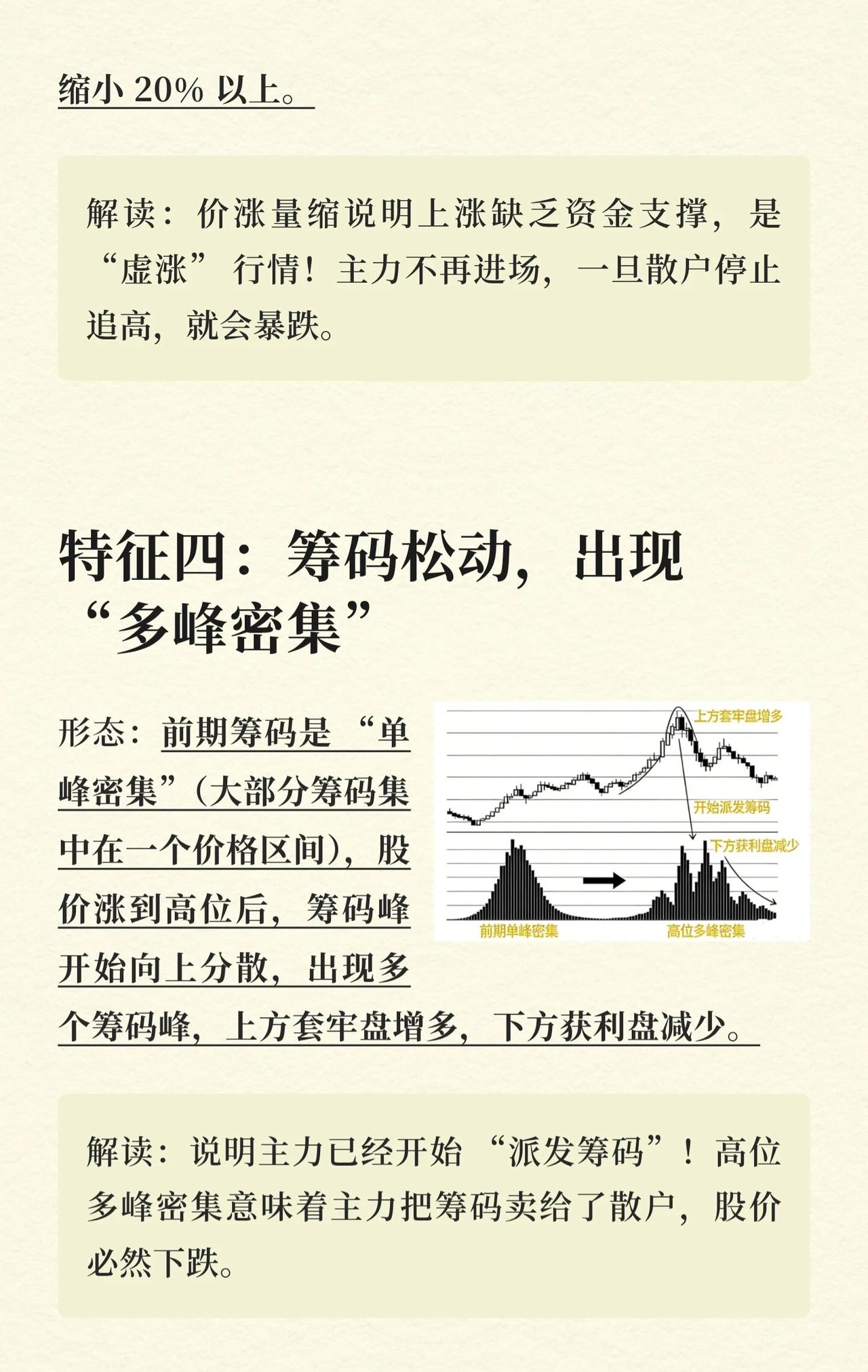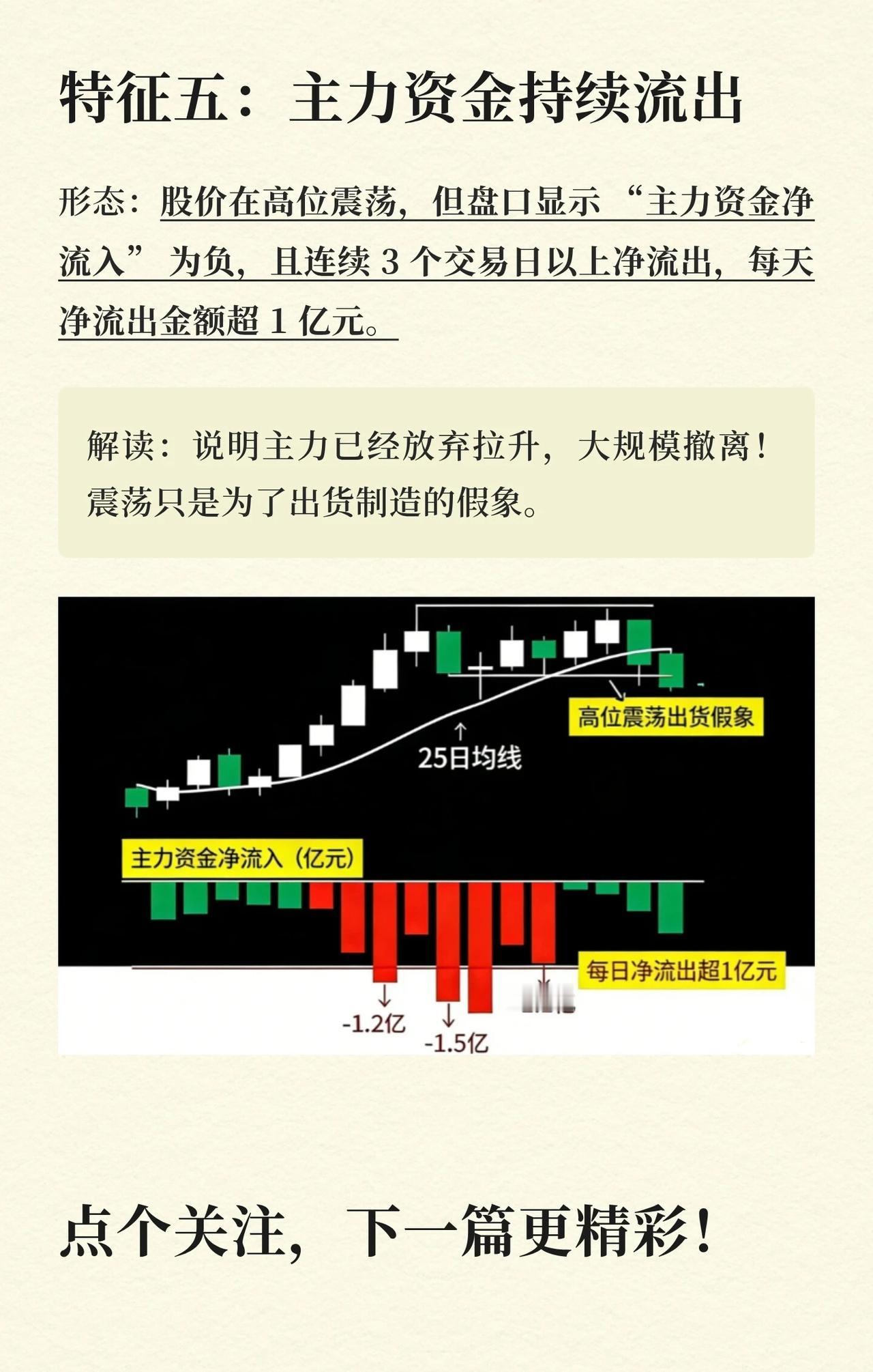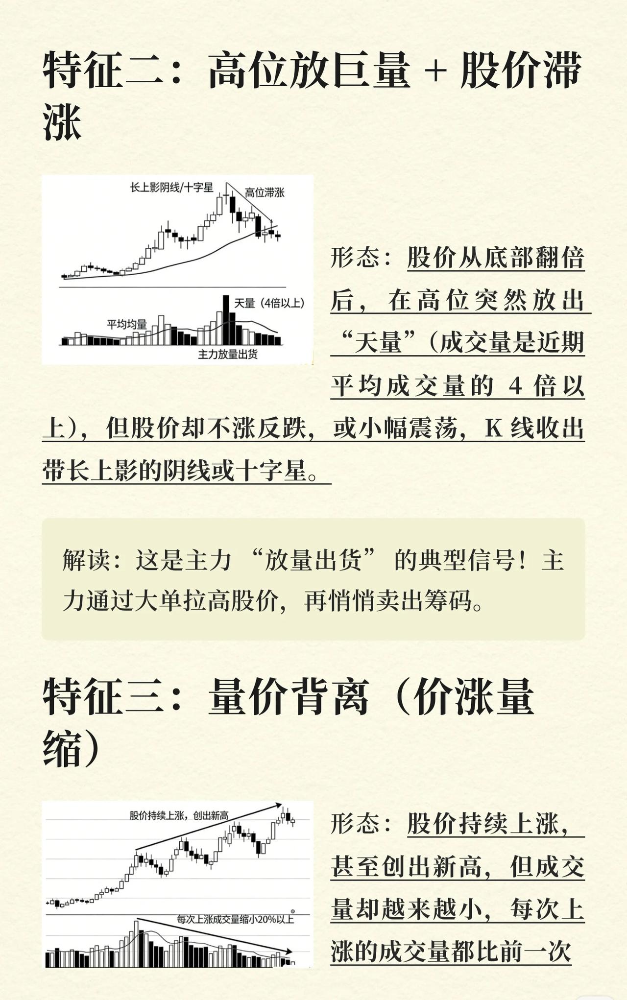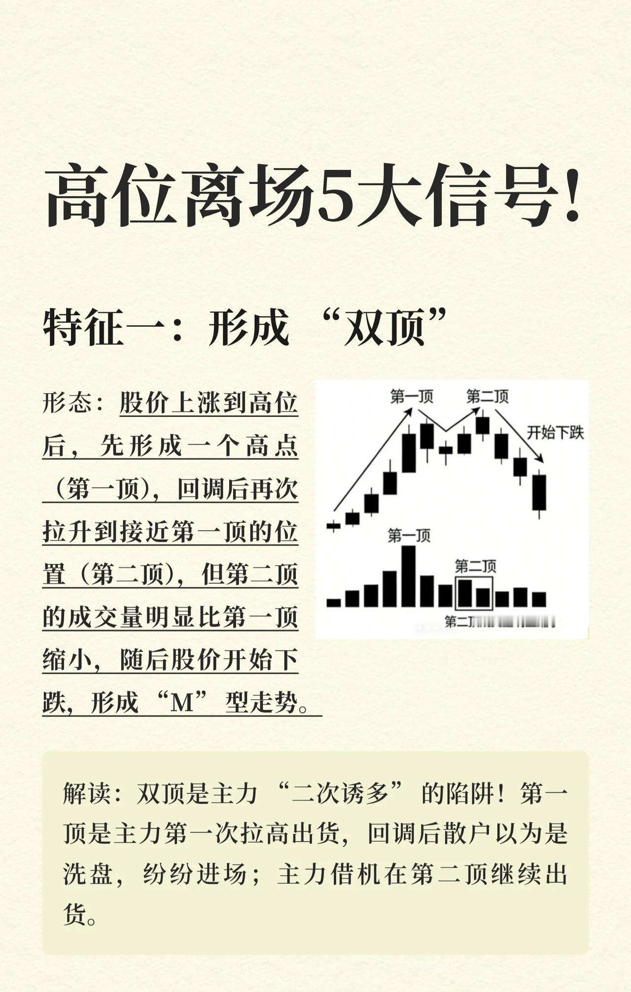 高位离场5大信号总结 该内容介绍了股票市场中,股价运行至高位区域时,投资者应考虑离场的五个关键信号。这些信号主要揭示了主力资金可能在出货或撤离的迹象,预示着股价可能即将下跌。 特征一:形成“双顶” * 形态描述:股价上涨至高位后,先形成一个高点(第一顶),随后回调,之后再次拉升但未能超过或仅接近第一顶的高度(第二顶),且第二顶的成交量明显小于第一顶,最终股价开始下跌,整体形成“M”型走势。 * 解读:这是一种主力“二次诱多”的陷阱。第一顶是主力第一次拉高出货,回调后散户误以为是洗盘而进场,主力则在第二顶继续出货。 特征二:高位放巨量 + 股价滞涨 * 形态描述:股价从底部翻倍后,在高位突然放出“天量”(成交量是近期平均成交量的4倍以上),但股价却不涨反跌或仅小幅震荡,K线图上常出现带长上影线的阴线或十字星。 * 解读:这是主力“放量出货”的典型信号。主力通过大单拉高股价,为悄悄卖出筹码创造条件。 特征三:量价背离(价涨量缩) * 形态描述:股价持续上涨,甚至创出新高,但成交量却越来越小,每次上涨的成交量都比前一次缩小20%以上。 * 解读:价涨量缩说明上涨缺乏资金支撑,是“虚涨”行情。主力已不再进场,一旦散户停止追高,股价就可能暴跌。 特征四:筹码松动,出现“多峰密集” * 形态描述:前期筹码是“单峰密集”(大部分筹码集中在一个价格区间),当股价涨到高位后,筹码峰开始向上分散,出现多个筹码峰,同时上方套牢盘增多,下方获利盘减少。 * 解读:这表明主力已经开始“派发筹码”。高位多峰密集意味着主力将筹码卖给了散户,股价必然下跌。 特征五:主力资金持续流出 * 形态描述:股价在高位震荡,但盘口数据显示“主力资金净流入”为负,且连续3个交易日以上净流出,每天净流出金额超过1亿元。 * 解读:这说明主力已经放弃拉升,正在大规模撤离。高位震荡只是主力为出货制造的假象。 核心思想 这五大信号的核心在于识别主力资金在股价高位区域的出货行为。无论是通过特定的K线形态(双顶)、成交量异常(巨量滞涨、量价背离)、筹码分布变化(多峰密集),还是直接的资金流向数据(主力资金持续流出),其共同指向都是主力正在或准备将筹码转移给散户,此时投资者应警惕风险,考虑高位离场。