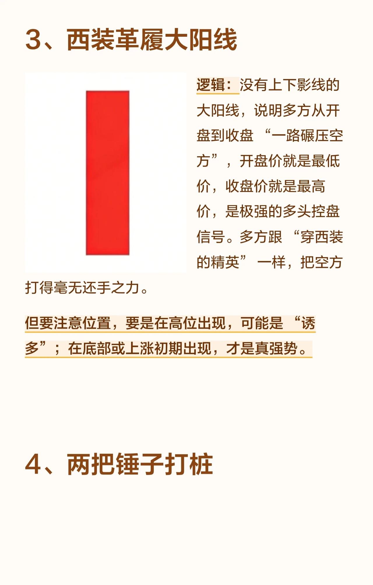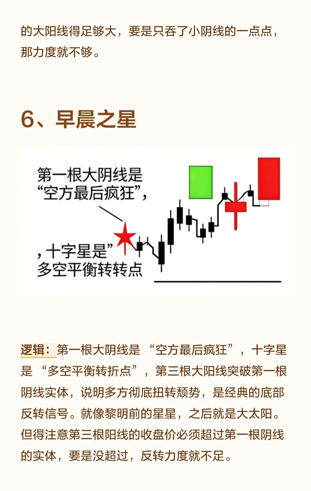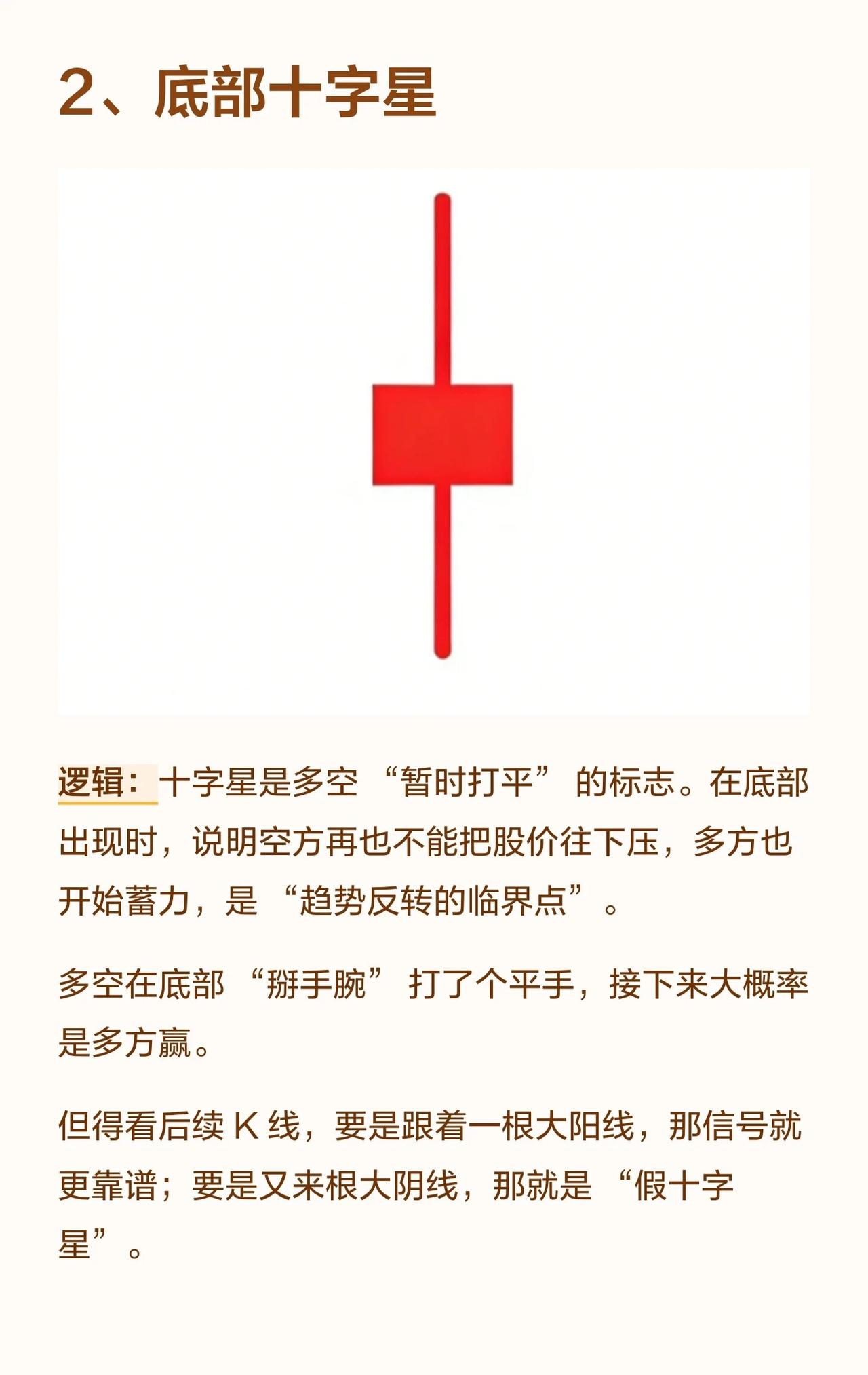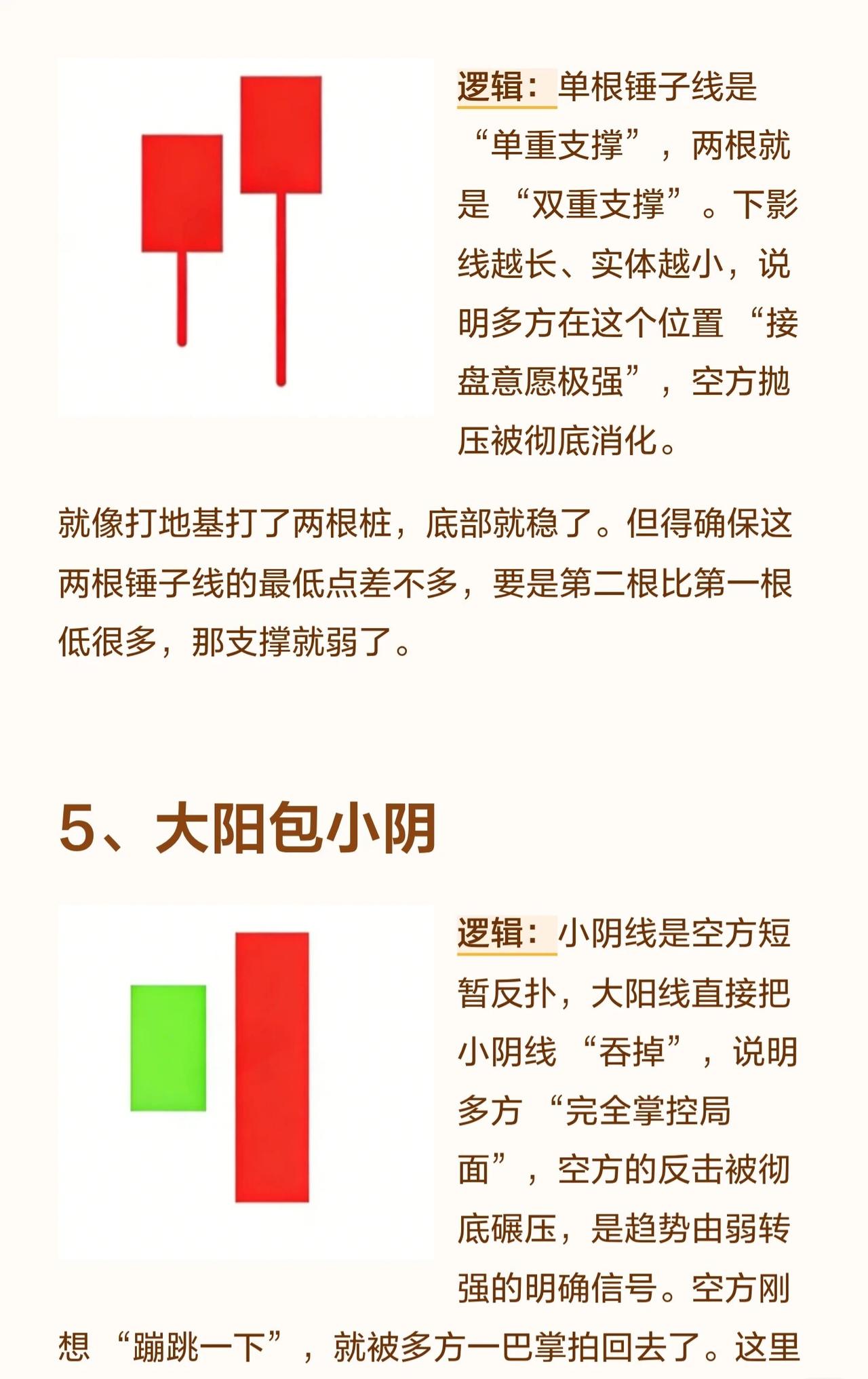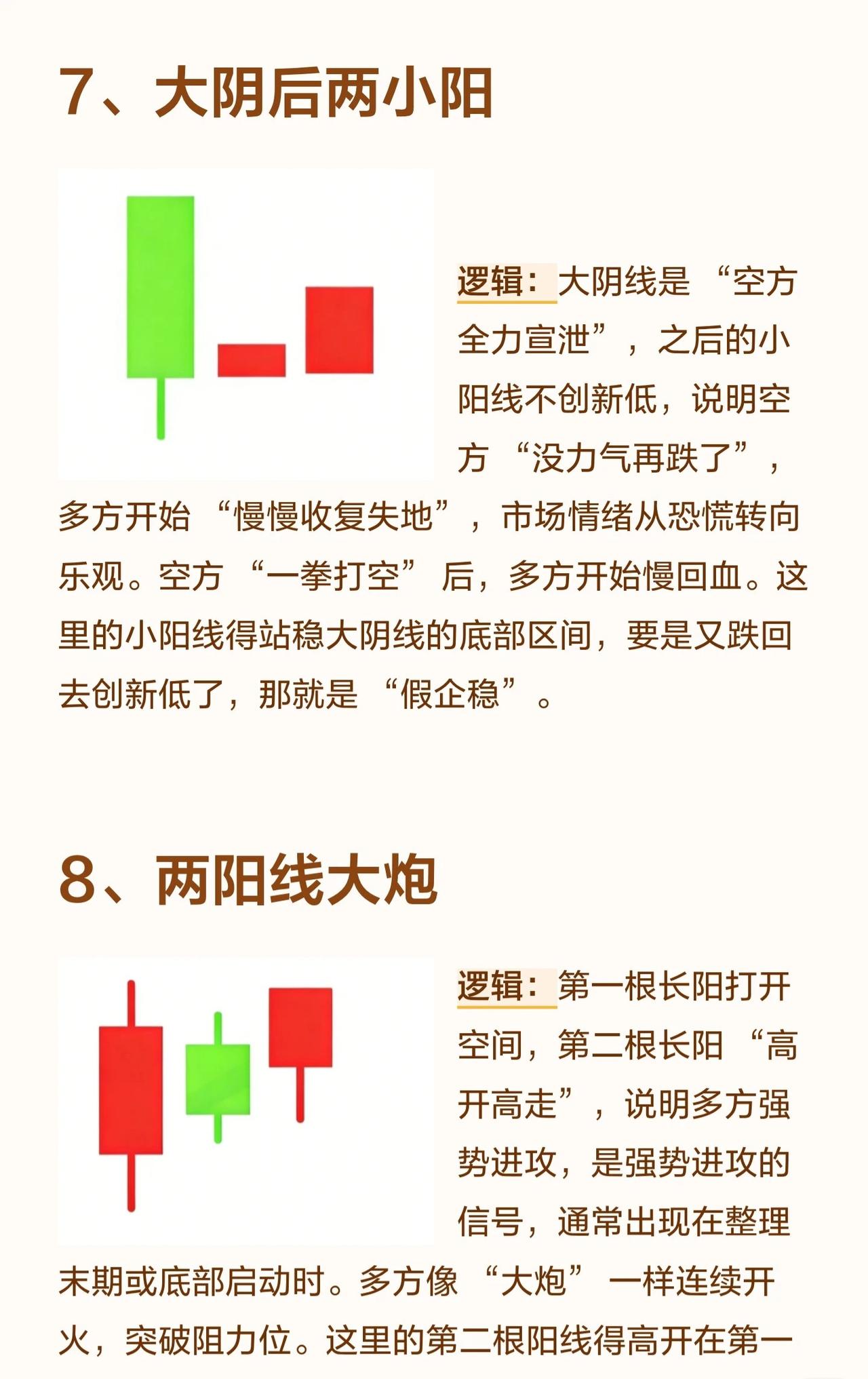 八个经典的看涨进场信号。以下是对这些信号的总结: 1. 底部大长腿在股价下跌至低位时出现,长下影线意味着空方砸盘被多方强势接住,表明下跌无力、承接强劲。这通常是“跌不动”的信号,但必须出现在真正的底部区域,若在半山腰则可能是“假支撑”。 2. 底部十字星十字星是多空力量暂时打平的标志。在底部出现说明空方无法继续打压股价,而多方开始蓄力,是趋势反转的临界点。若后续跟随一根大阳线则信号更可靠,若跟随大阴线则为“假十字星”。 3. 西装革履大阳线指没有上下影线的实体大阳线,表明多方从开盘到收盘完全碾压空方,是极强的多头控盘信号。该形态在底部或上涨初期出现是真强势,但在高位出现则可能意味着“诱多”。 4. 两把锤子打桩两根锤子线形成“双重支撑”,下影线越长、实体越小,说明多方接盘意愿极强,空方抛压被消化。这就像打下两根地基桩,底部稳固。前提是两根锤子线的最低点相近,若第二根低很多则支撑力弱。 5. 大阳包小阴小阴线是空方短暂反扑,大阳线直接吞没小阴线,说明多方完全掌控局面,空方反击被彻底碾压,是趋势由弱转强的明确信号。要求大阳线足够大,若只吞一点点力度则不足。 6. 早晨之星由一根大阴线、一根十字星、一根大阳线组成。大阴线是“空方最后疯狂”,十字星是“多空平衡转折点”,第三根大阳线突破第一根阴线实体,表明多方彻底扭转颓势,是经典的底部反转信号。要求第三根阳线收盘价超过第一根阴线实体,否则反转力度不足。 7. 大阴后两小阳大阴线是“空方全力宣泄”,之后的小阳线不创新低,说明空方“没力气再跌”,多方开始慢慢收复失地。要求小阳线站稳大阴线底部区间,若再跌回新低则是“假企稳”。 8. 两阳线大炮第一根长阳打开空间,第二根长阳高开高走,表明多方强势进攻,是强势进攻信号,常见于整理末期或底部启动时。第二根阳线必须高开在第一根阳线收盘价之上,若低开则进攻气势减弱。 总结要点: * 位置很重要:同一形态在底部、上涨初期或高位的意义完全不同。 * 确认信号:很多形态需要后续K线(如大阳线)来确认其有效性,避免“假信号”。 * 力度与结构:实体大小、影线长度、是否吞没等细节决定了信号的强弱。 * 综合判断:单一信号不足以构成交易依据,应结合其他技术指标和市场环境综合判断。