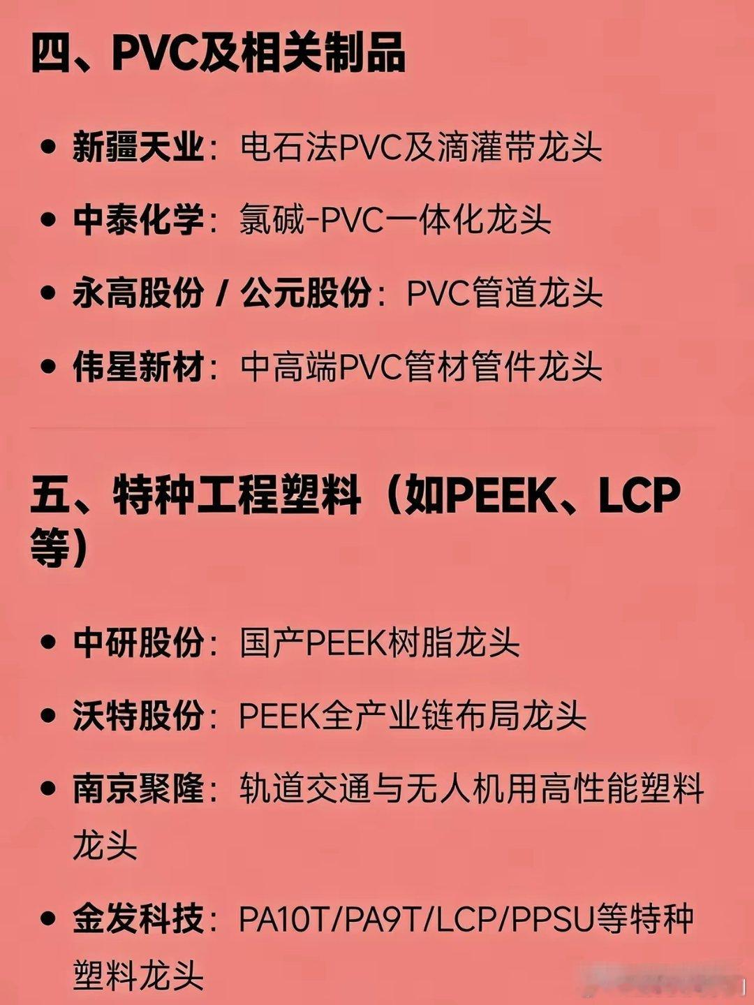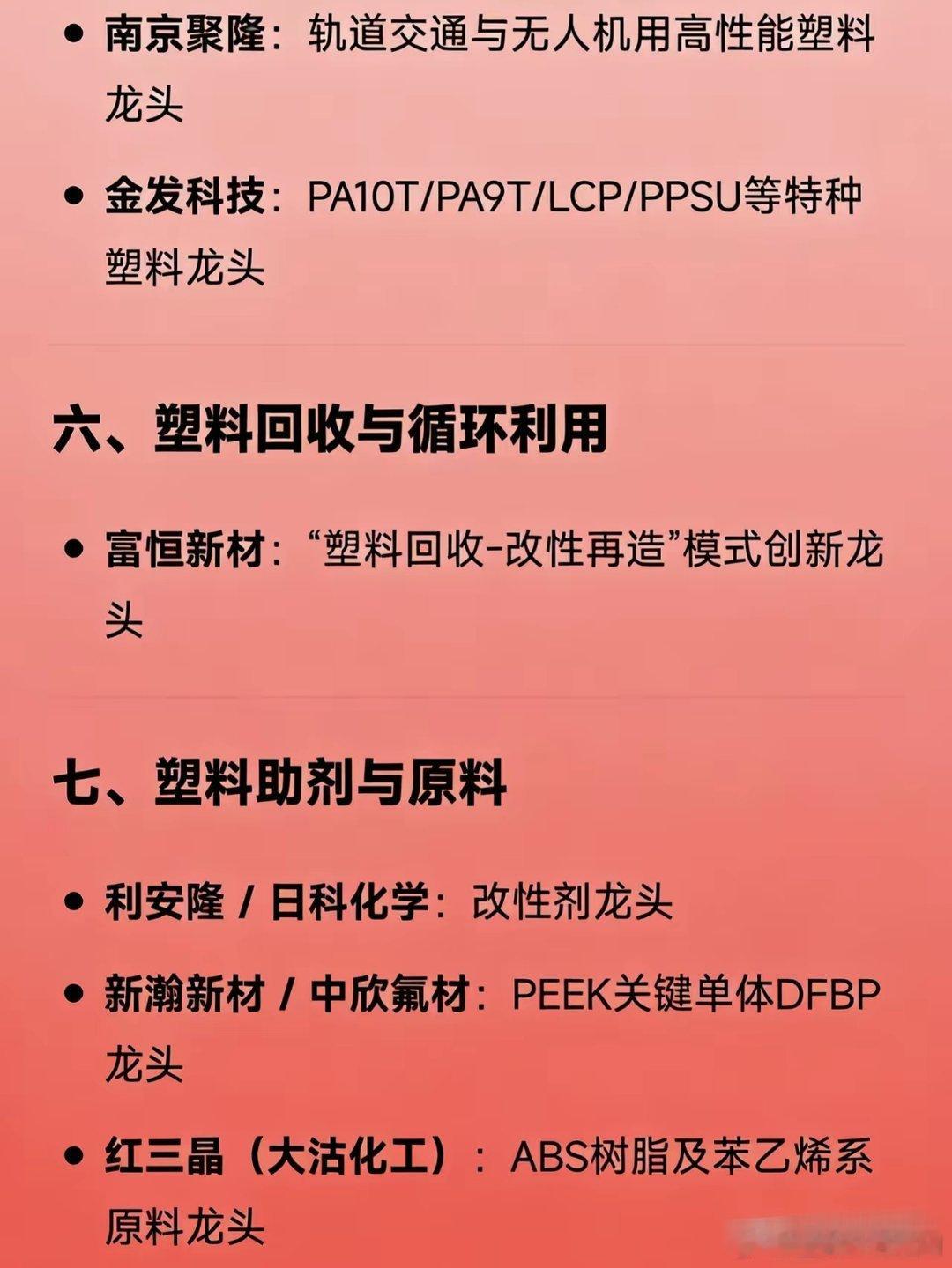 塑料产业链龙头股一、改性塑料金发科技、国恩股份、普利特、道恩股份、会通股份、银禧科技、聚石化学二、可降解塑料金发科技、丹化科技、金丹科技、新疆天业三、ABS塑料奇美、LG化学、中国石油、金发科技四、PVC新疆天业、中泰化学、永高股份、伟星新材五、特种工程塑料(PEEK/LCP等)中研股份、沃特股份、南京聚隆、金发科技六、塑料回收富恒新材七、塑料助剂 & 原料利安隆、日科化学、新瀚新材、中欣氟材、红三晶以上仅供参考,不构成投资建议。