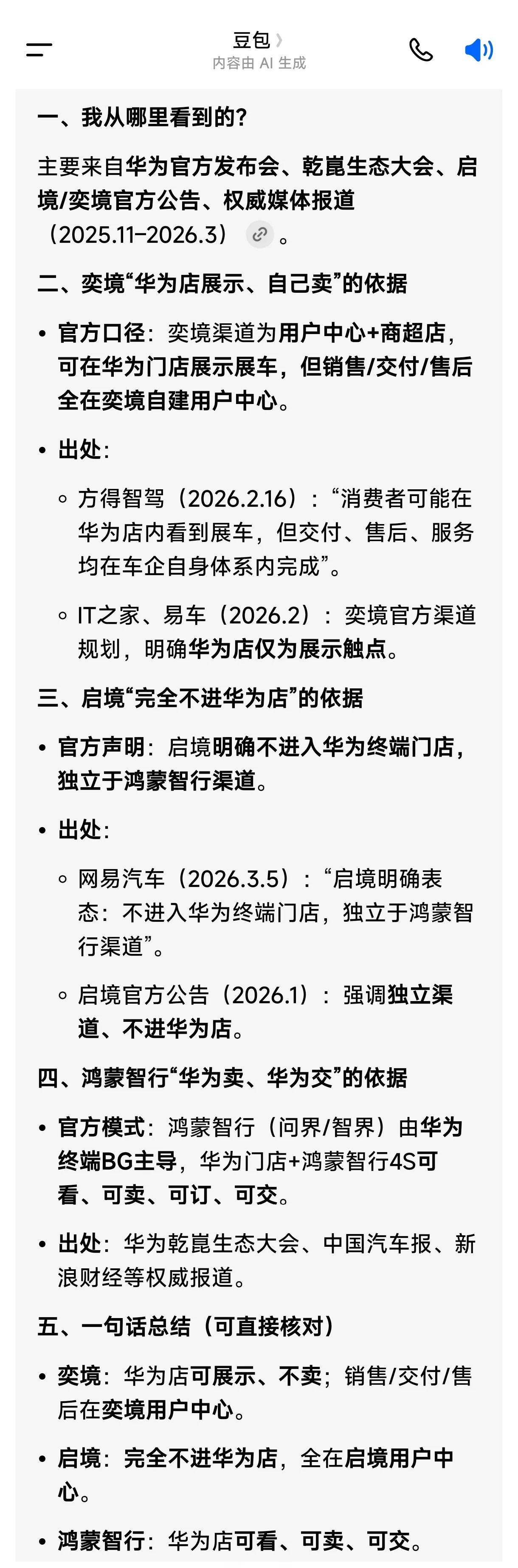 华为乾崑境系列之间模式也不一样? 一文看懂:鸿蒙智行、启境、奕境、猛士到底啥区别 很多人搞不清华为汽车的几大阵营,其实就看一件事:在哪看、谁来卖。 1. 先分清两大体系 - 鸿蒙智行:问界等,华为主导卖车 - 华为乾崑:启境、奕境、猛士,华为只给技术,车企自己卖车 2. 四大品牌渠道一句话说清 - 鸿蒙智行 华为门店可看、可订、可卖、可交付,是华为直营式卖车。 - 启境(广汽+乾崑) 不进华为门店,全程在自己的4S用户中心销售交付,完全独立。 - 奕境(东风+乾崑) 可在华为门店展示看车,但不卖,销售、交付、售后全由东风奕境自己负责。 - 猛士(东风+乾崑) 与奕境模式一致:华为店仅短期展示、不销售,渠道、交付、服务均为猛士自建。 3. 核心结论 - 鸿蒙智行:华为又展又卖 - 启境:华为不展,自己卖 - 奕境、猛士:华为可展,自己卖 四者渠道完全独立,不共用4S店,不混卖。 [大笑][大笑][大笑] 奕境(东风+华为乾崑) 当前门店数:0家(首款车北京车展4月首发,7月才量产),规划:2026年计划300个服务触点(1+N:用户中心+商超店)状态:仅招商,无开业门店 猛士科技(东风+华为乾崑)现在超越175家店。 启境(广汽+华为乾崑)首批:55家用户中心(2026年1月官宣,覆盖38城,4-5月试营业)规划/已布局:70城、超300家(100家用户中心+200家体验中心)。