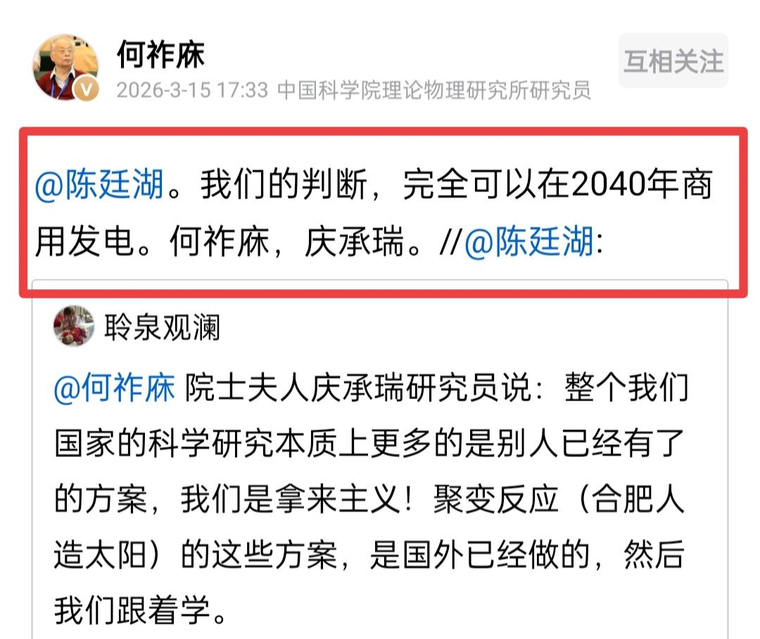 何祚庥老院士在3月15日发文称,他判断完全可以在2040年实现核聚变商用发电。