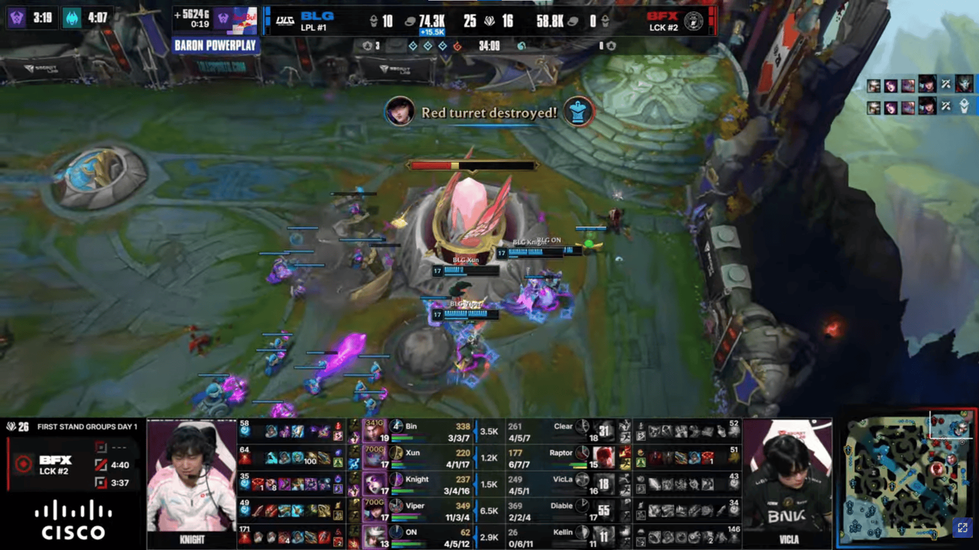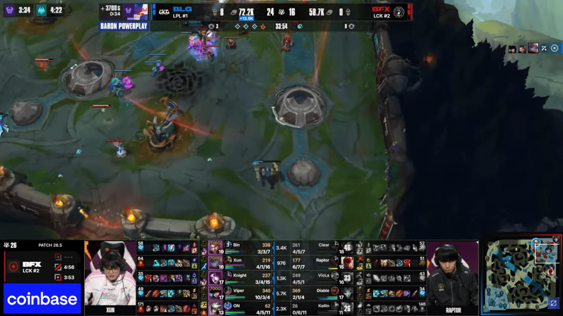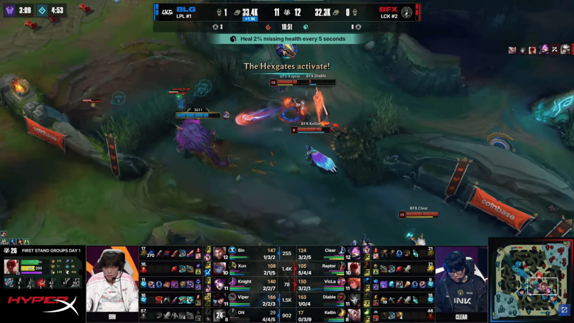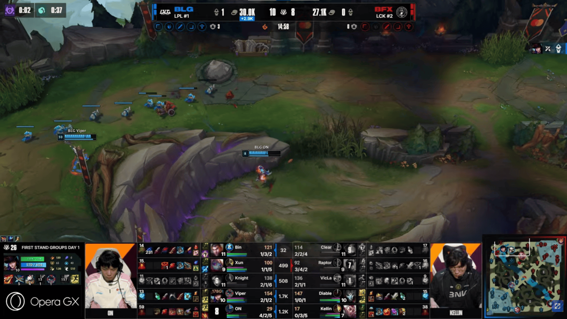 比赛第18分钟,Viper女警三杀帮助BLG打出3换5团灭BFX→