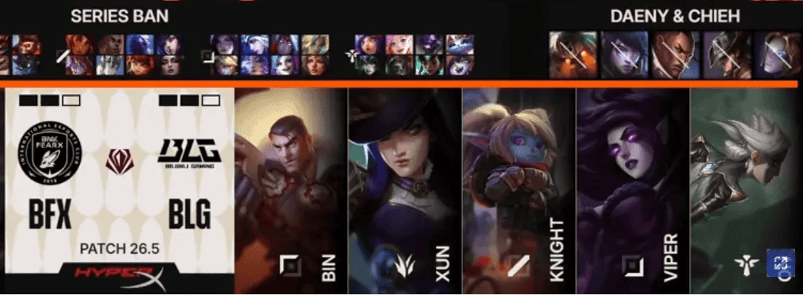 BLG选用:Bin杰斯、Xun波比、knight莫甘娜、Viper女警、ON青钢影