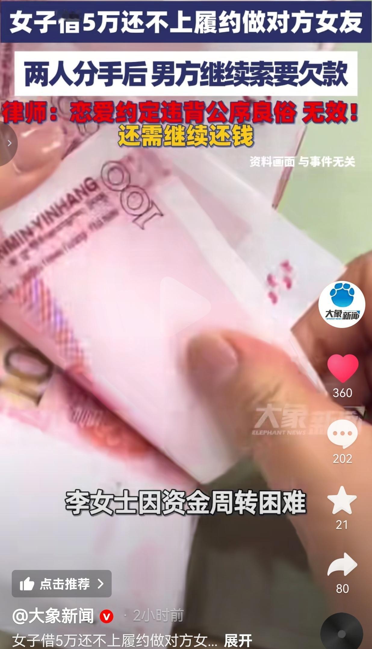 太离谱了!这哪是谈恋爱,这分明是披着“恋爱”外衣的高利贷交易! 李女士急着用钱周转,找朋友张先生借了5万,白纸黑字打了借条,连还款日期都写得明明白白。 可真到了要还钱的日子,她翻遍了银行卡余额,连凑齐零头都难,急得坐在出租屋里直掉眼泪,连饭都顾不上吃。 这时候张先生踩着点找上门,脸上挂着虚伪的笑,终于露出了藏在“朋友”面具下的真面目:“还不上钱也行,你当我女朋友,这5万就一笔勾销。” 走投无路的李女士盯着那张借条,指尖都攥白了——她知道这是个陷阱,可身后是催债的电话、是压得喘不过气的生活,最后只能咬着牙把眼泪往肚子里咽,点了头,成了对方名义上的女友。 可这段从钱堆里长出来的感情,从一开始就没半点温度:他带着她出门,眼里全是“我花钱买了你”的理所当然;她陪着他应付朋友,心里只想着“熬完这段就能摆脱债务”。 两个人揣着各自的算盘,连牵手都带着算计的尴尬,没过多久就因为一点小事爆发矛盾,彻底闹掰,连句好聚好散都没有。 本以为这段荒唐又屈辱的关系终于结束了,李女士甚至偷偷松了口气,觉得总算能摆脱这段恶心的纠缠。 可她万万没想到,张先生转头就拿着当初的借条堵在了她家门口,语气比借钱时还要理直气壮:“恋爱约定不算数,你欠我的5万必须还!” 李女士彻底懵了,站在原地浑身发抖:我都按你要求当你女友了,连尊严都丢了,凭啥还要还钱? 更扎心的是,她找律师咨询后,得到的答案像一盆冰水浇在头上:这种“以恋爱抵债”的约定违背公序良俗,压根不受法律保护!合法的借贷关系受法律保护,她欠的5万,还得一分不少还回去! 网友看到后评论说:“这男的算盘打得我在隔壁省都听见了!想白嫖还想把钱要回来,脸呢?!” 也有的网友说:“姑娘也是傻!再急用钱也不能卖自己啊!这哪是借钱,这是把自己往火坑里推!” 也有的网友说:“看着都气!这男的就是吃准了姑娘急用钱,拿捏她的软肋!这种人根本没把人当人看!” 还有的网友说:“太可笑了!有人用钱买感情,有人为钱卖尊严,最后吃亏的永远是走投无路的普通人!” 要我说,这哪里是什么“恋爱纠纷”,这就是一场赤裸裸的PUA和剥削!他精准抓住了普通人“急用钱”的软肋,用“不用还钱”当诱饵,把别人的尊严踩在脚下,最后还能拿着法律当挡箭牌,把自己摘得干干净净——他算透了法律,算透了姑娘的软弱,唯独没算过一点人心! 我们总说要讲法律、讲规矩,可规矩之外,更该讲点人心!法律能明明白白判定“以恋爱抵债的约定无效”,能清清楚楚要回那5万块钱,却判不了一个人的自私和凉薄,要不回李女士被践踏的尊严和被消耗的信任! 别再跟我说什么“一个愿打一个愿挨”!走投无路的“愿挨”,从来都不是心甘情愿,而是被生活逼到墙角的妥协!别再用“恋爱自由”当遮羞布,掩盖这种把人当商品的冷漠和贪婪!别再让那些精明的利己主义者,拿着法律当武器,去欺负那些走投无路的普通人! 钱能算得清,人心算不清;债能还得完,尊严丢了,一辈子都捡不回来! 对此,你怎么看?