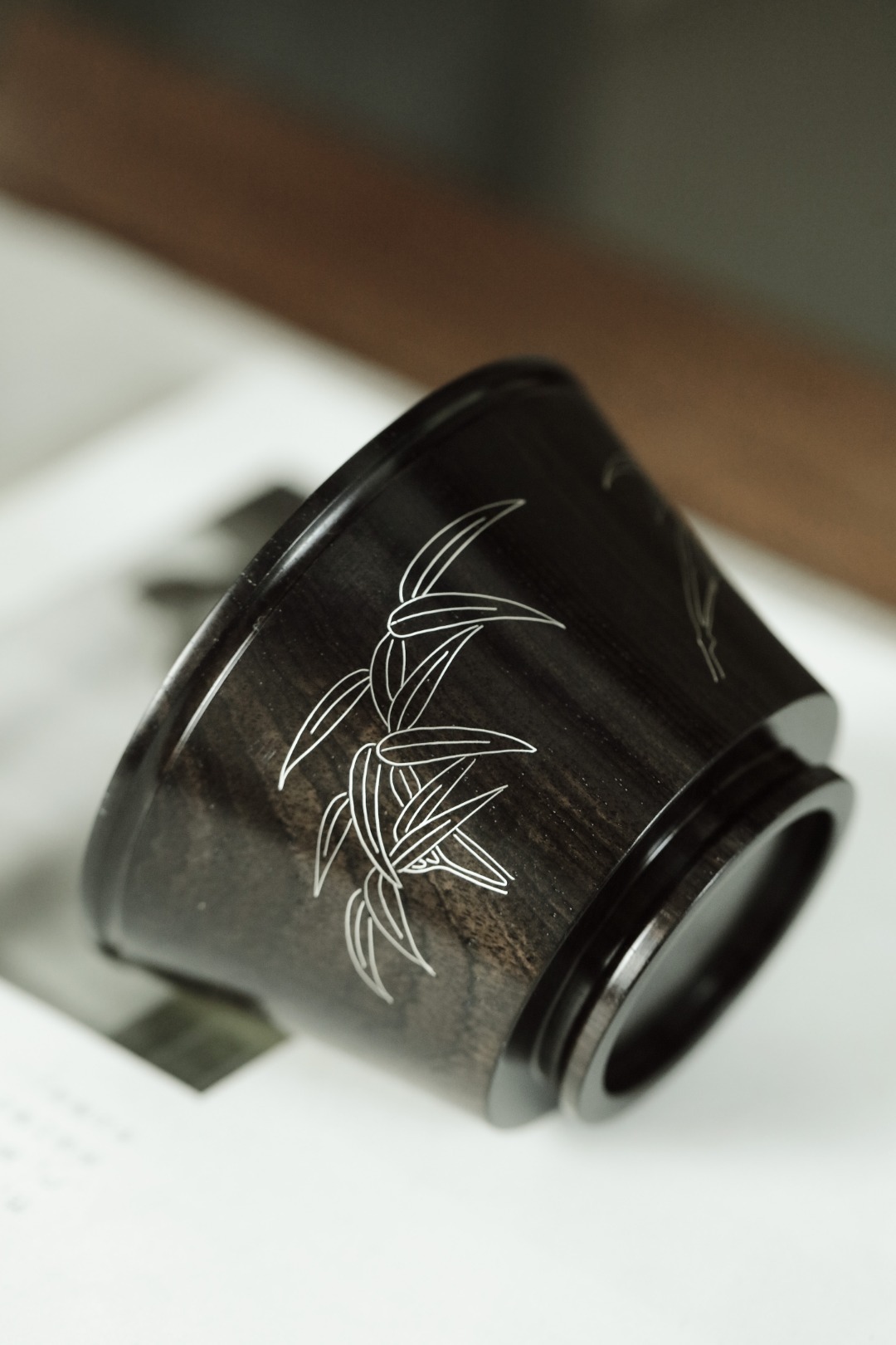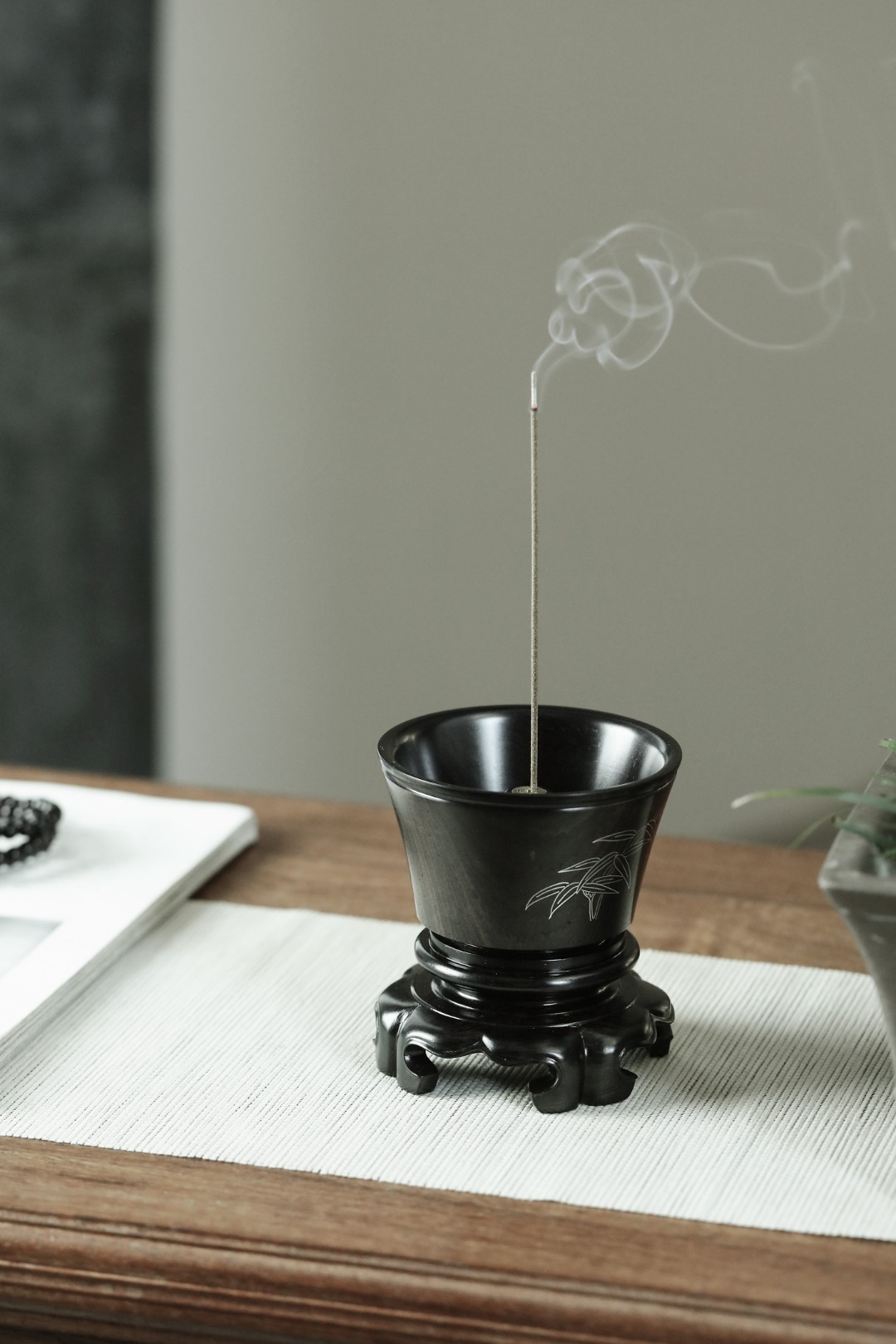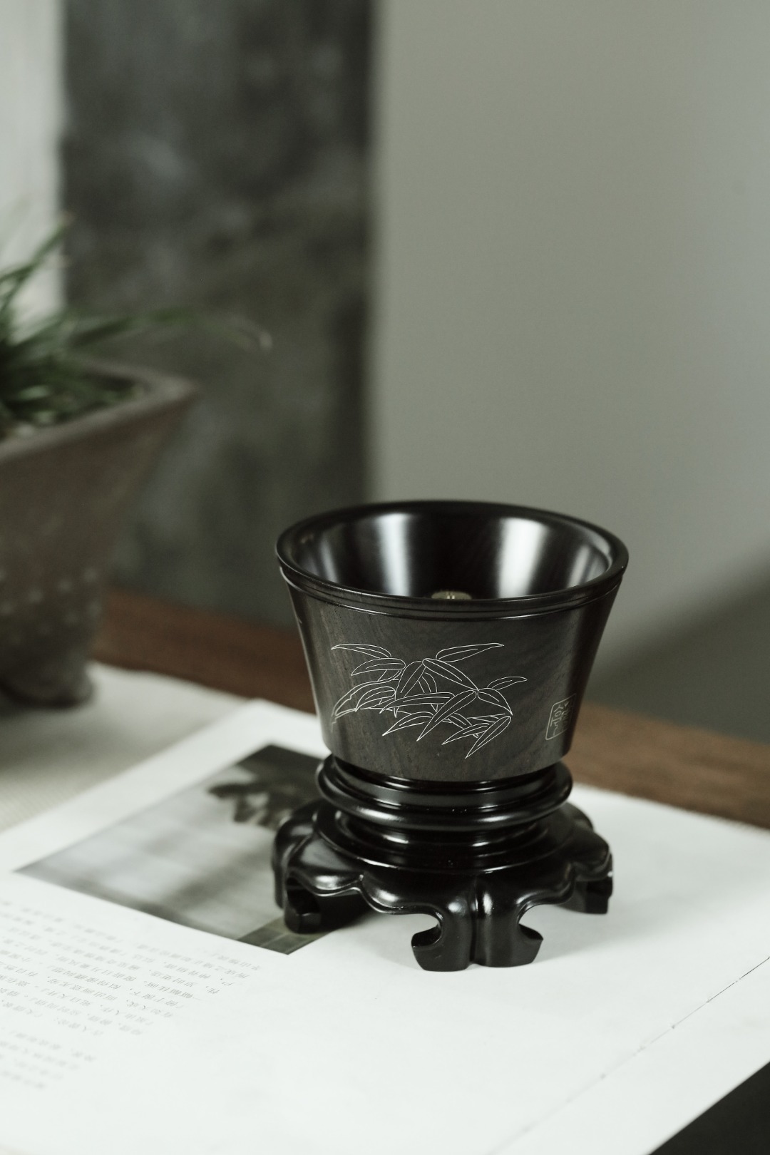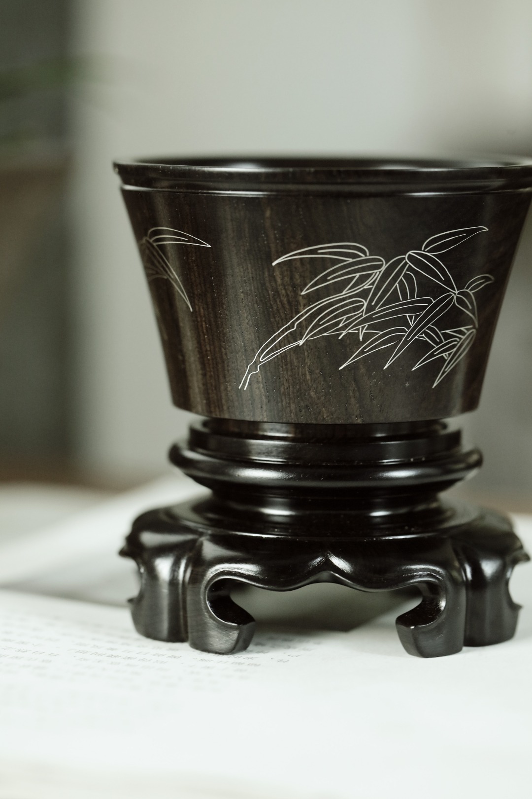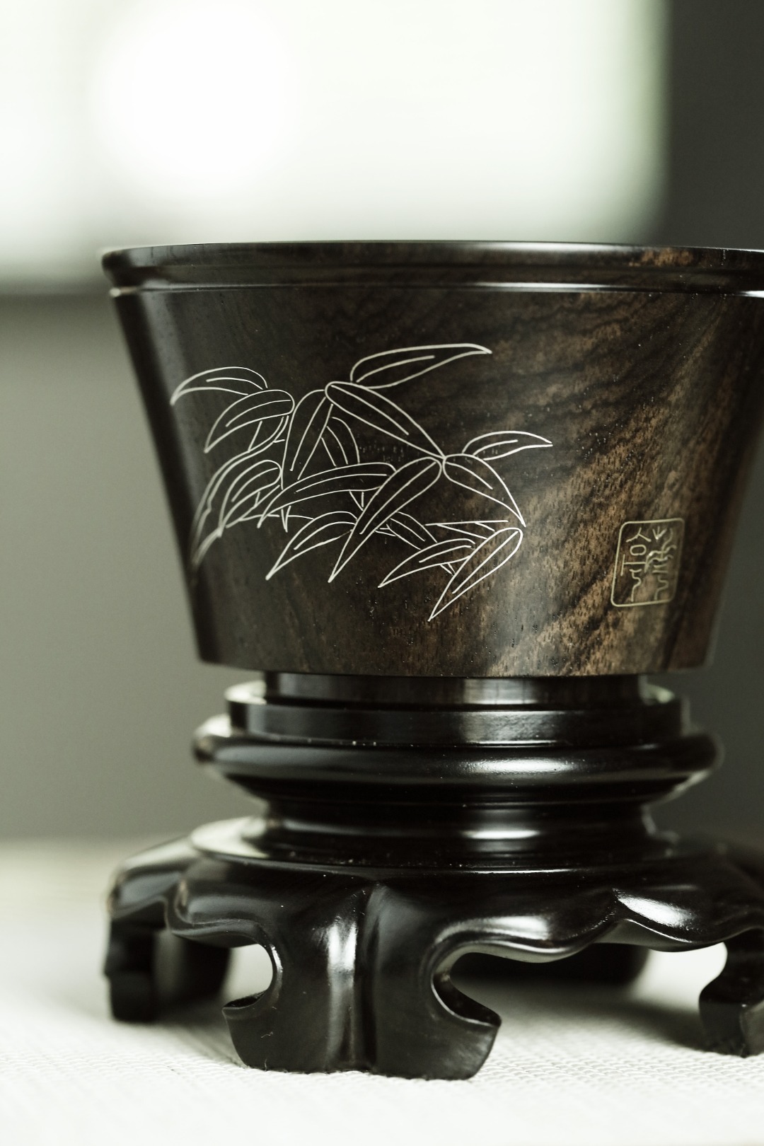 取材紫光檀精品料,上部外壁以嵌银丝工艺饰文竹、落款篆书”下部四足底座,型似战国杯,陈置案几燃香,文雅精致!