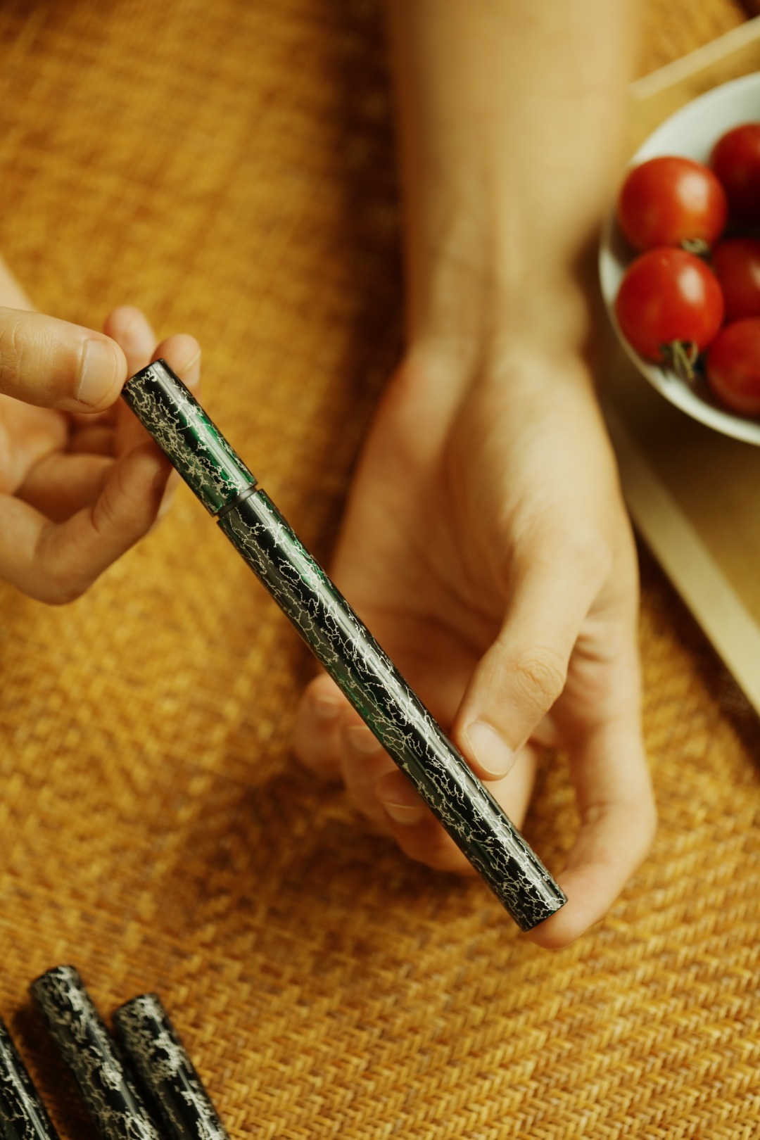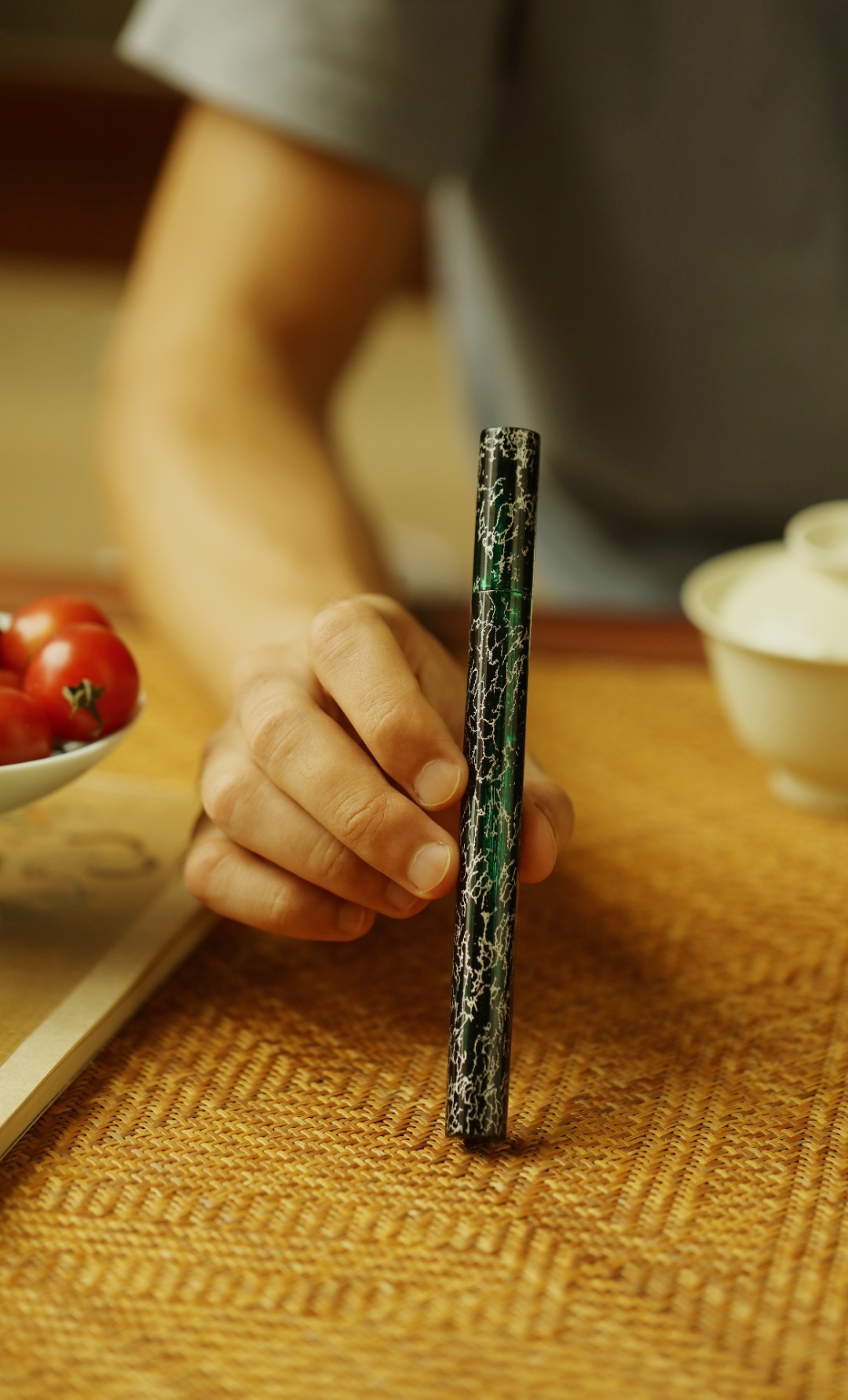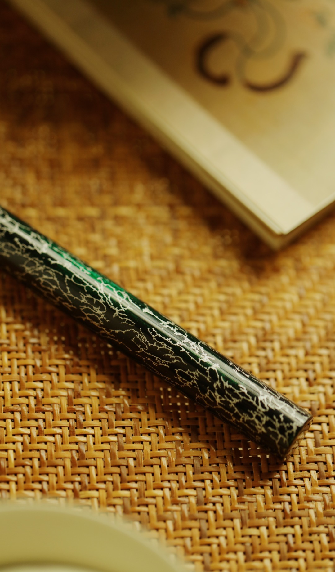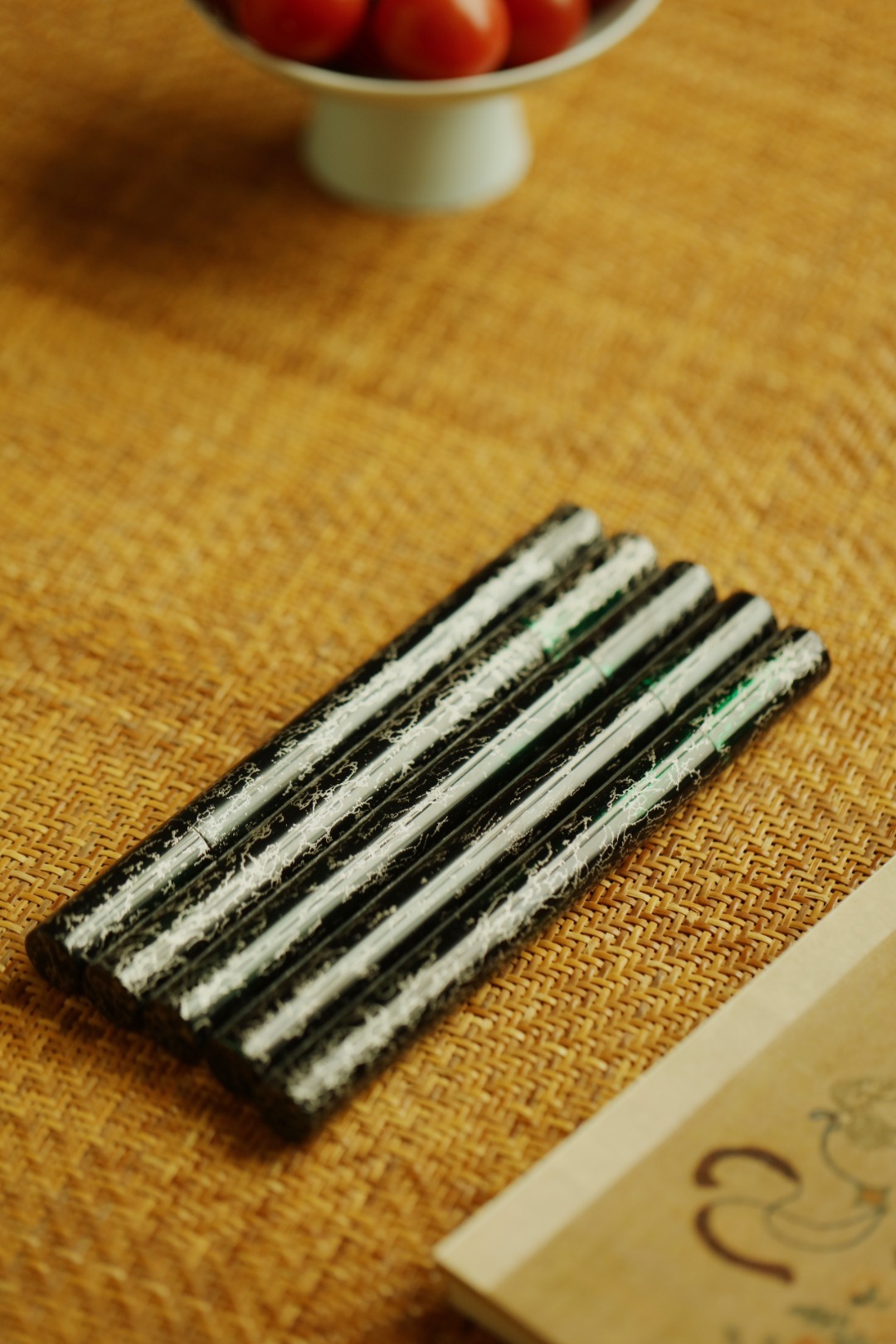 此款香筒器形简约,修饰大漆,底色是贴银箔髹大漆透明绿、循环往复数层打磨,再做蜻蜓涂装饰。这款香筒小巧可做户外便携好物,在旷野里品茗观烟云曼妙,漾开的云气像写意的山水在空气中弥漫开来;清雅的颜色、温润的色泽也是室内手边称手雅器,点一根香,把喧嚣留给世外,静谧留给自己。