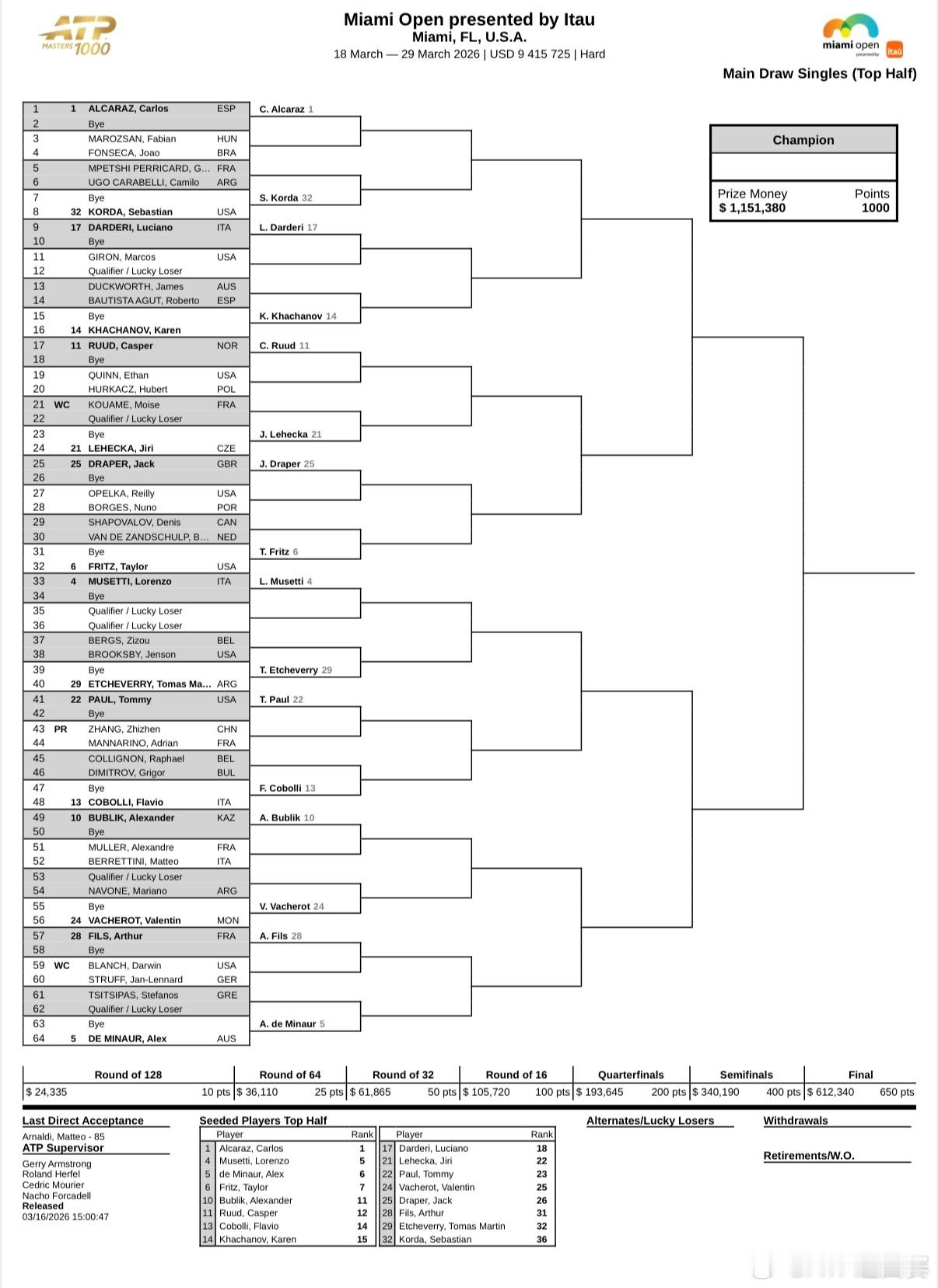 ⭕️ATP1000 迈阿密大师赛单打签表出炉🔥📍美国·迈阿密📅3月18-29日🎾门希克以卫冕冠军身份出战,阿尔卡拉斯、辛纳领衔,中国选手吴易昺首轮对阵加拿大球员迪亚洛,胜者第二轮面对31号种子恩贝尔。