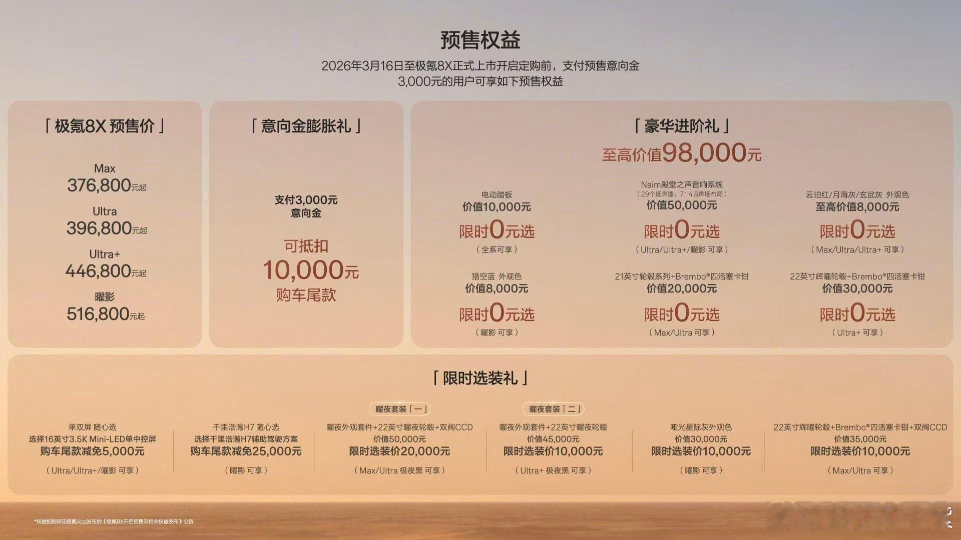 极氪8X预售37.68万起 不止家用,更是越级享受。极氪8X用大气外观、硬核性能与豪华舒适,重新定义家庭出行的情绪价值。从9系开始,极氪在情绪价值的提供上爆发!大气原创设计、全球唯二宾利同款音响、百万级性能车主动稳定杆,配置直接拉到顶。极氪8X,早已跳出传统8系的家用局限,实力越级,不止于家。极氪8X预售38分钟破万