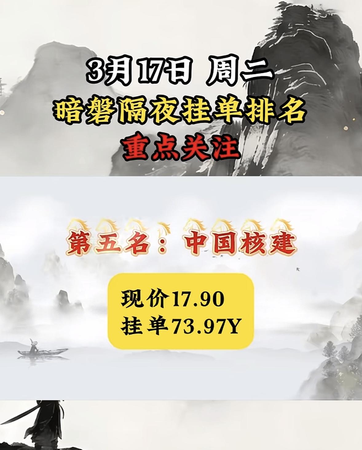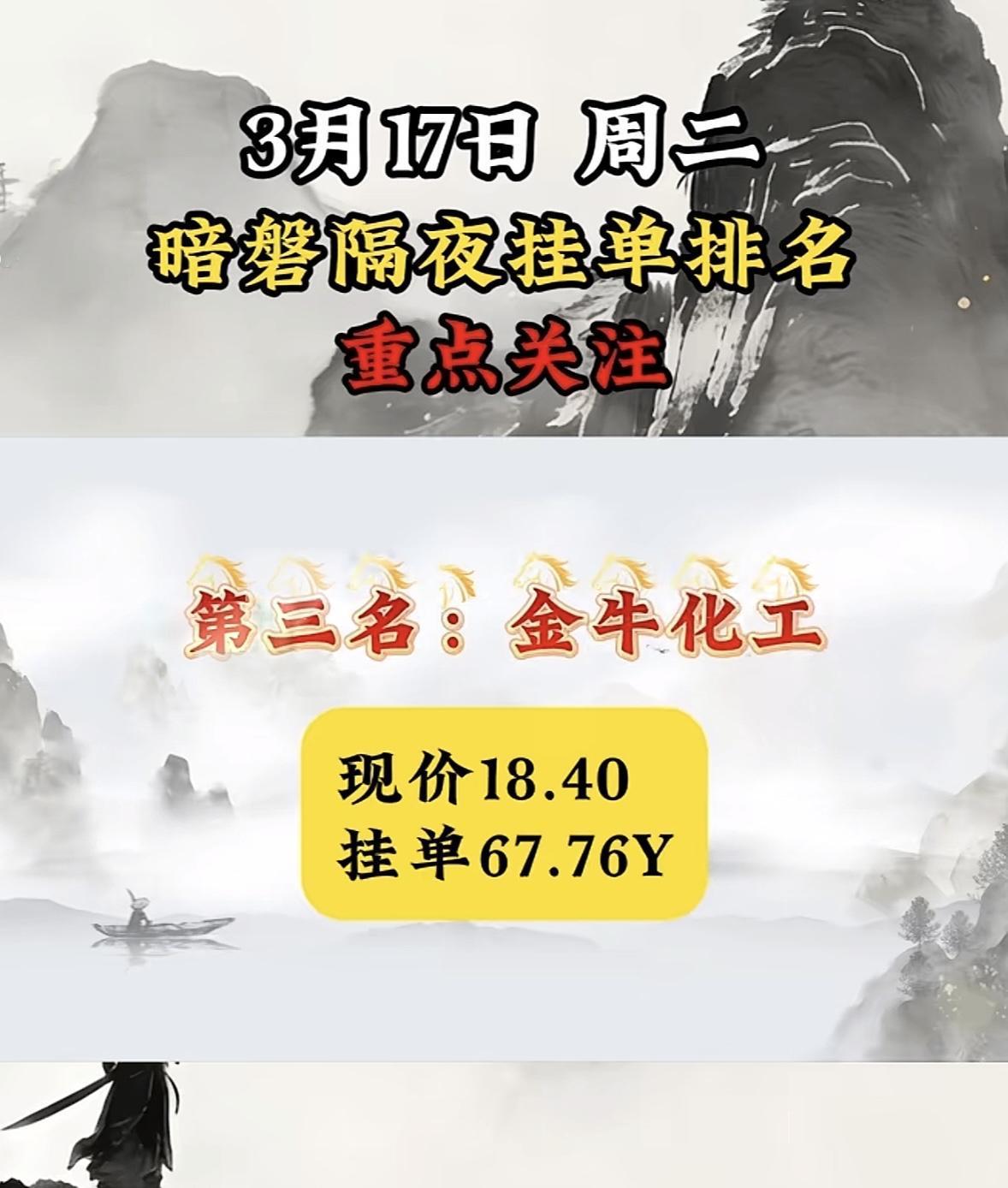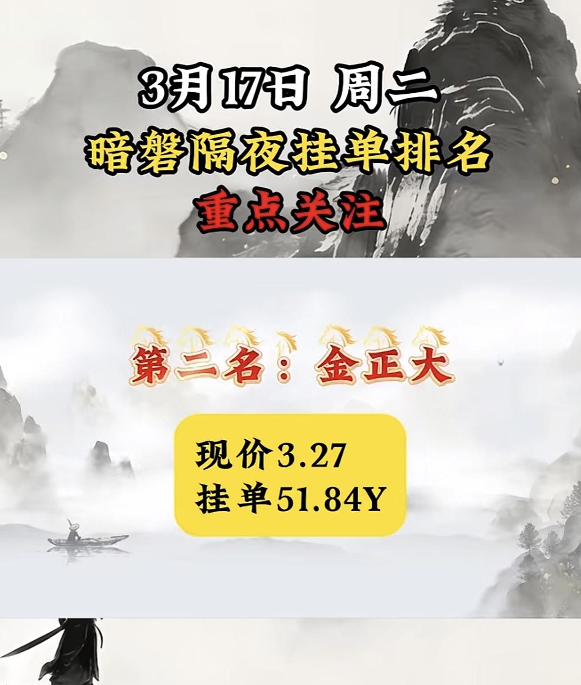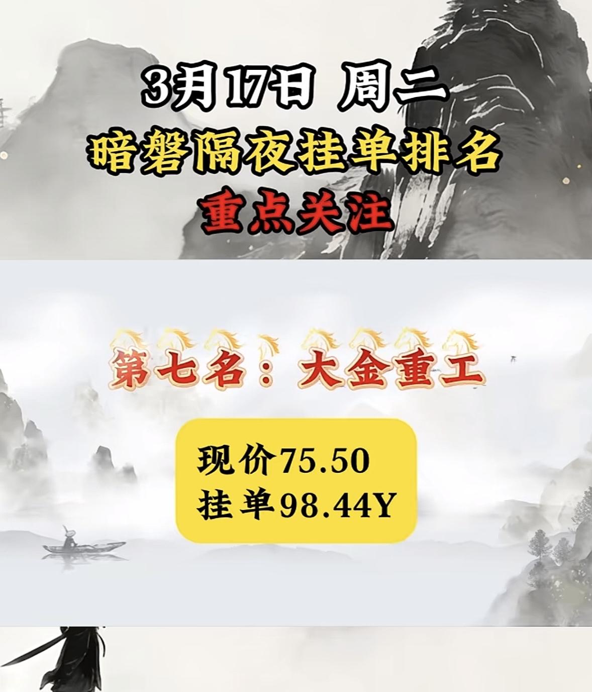 3月17日暗磐隔夜挂单排行揭晓 大金重工很是惹眼。现价75.5,挂单竟达98.44亿。从过往数据看,大金重工这走势挺猛。2026年3月5日收盘报70.39元,较前一交易日跌2.29%,当日成交额12.23亿。其2025年年报显示,全年营收61.74亿,同比增63.34%;净利润11.03亿,同比增132.82%。如此亮眼的业绩,难怪有这么大的挂单量。不过股市风云变幻,大金重工后续会如何,还得接着瞧。