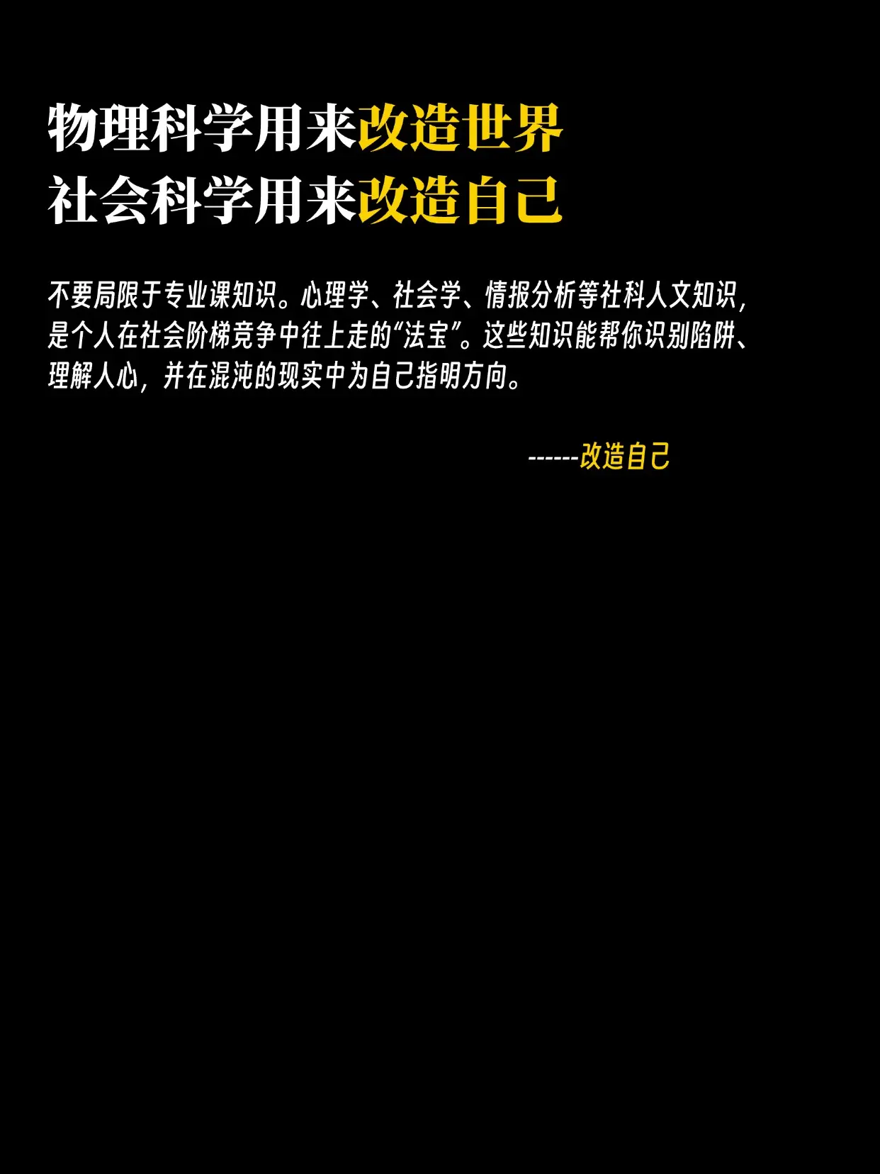 1、满足富有阶级的特殊需求,是你赚钱最快的方式。 2、要服从于现实,放下自尊心的包袱,去积累自己的能量。 3、物理科学用来改造世界,社会科学用来改造自己。