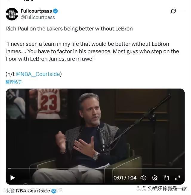 富保罗怒怼质疑:没有詹姆斯湖人会更强?我从未见过! 针对近期“没有詹姆斯湖人会更强”的言论,知名经纪人里奇-保罗在节目中霸气回怼: “我这辈子从来没见过哪支球队,在没有詹姆斯之后会变得更好!” 他强调,湖人磨合需要时间,詹姆斯一直是持球大核,打法转换需要过程;而且核心球员伤病不断,根本没多少时间一起打球。 “大多数和詹姆斯一起上场的球员都会全力以赴,除非有人演戏。” 詹姆斯本赛季场均可以拿到21.3分5.7篮板和7.0助攻,整体投篮命中率保持在50.5%! 这番话力挺詹姆斯,你认同吗?