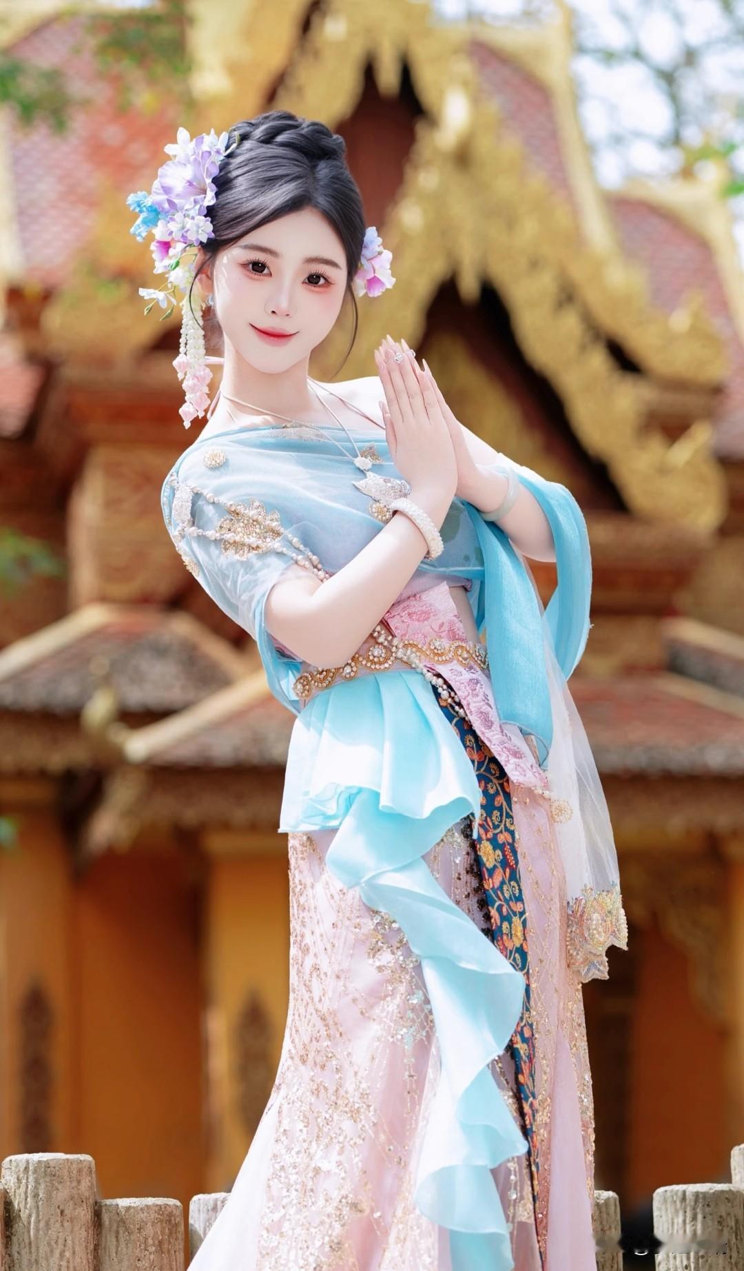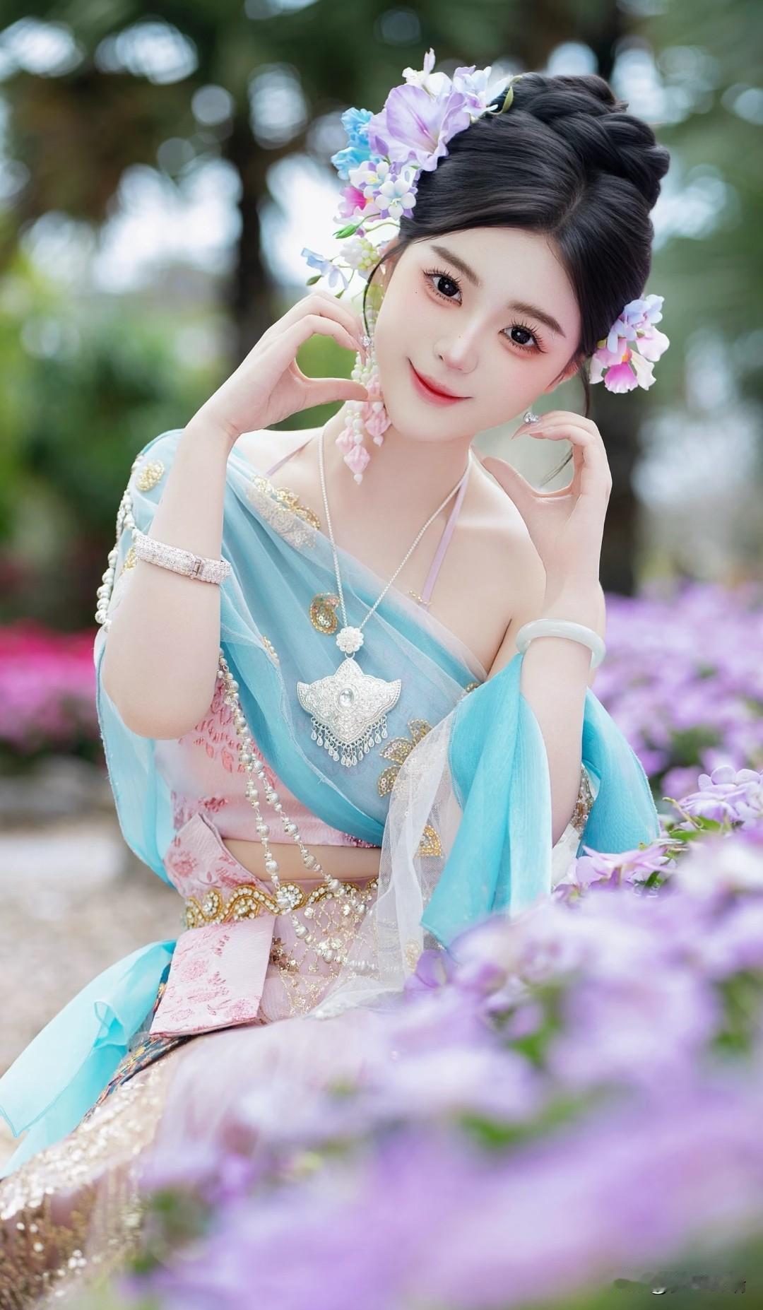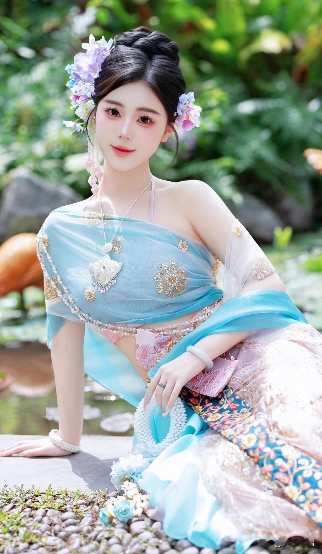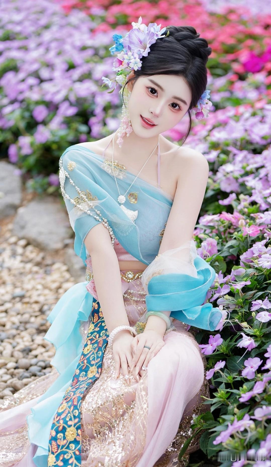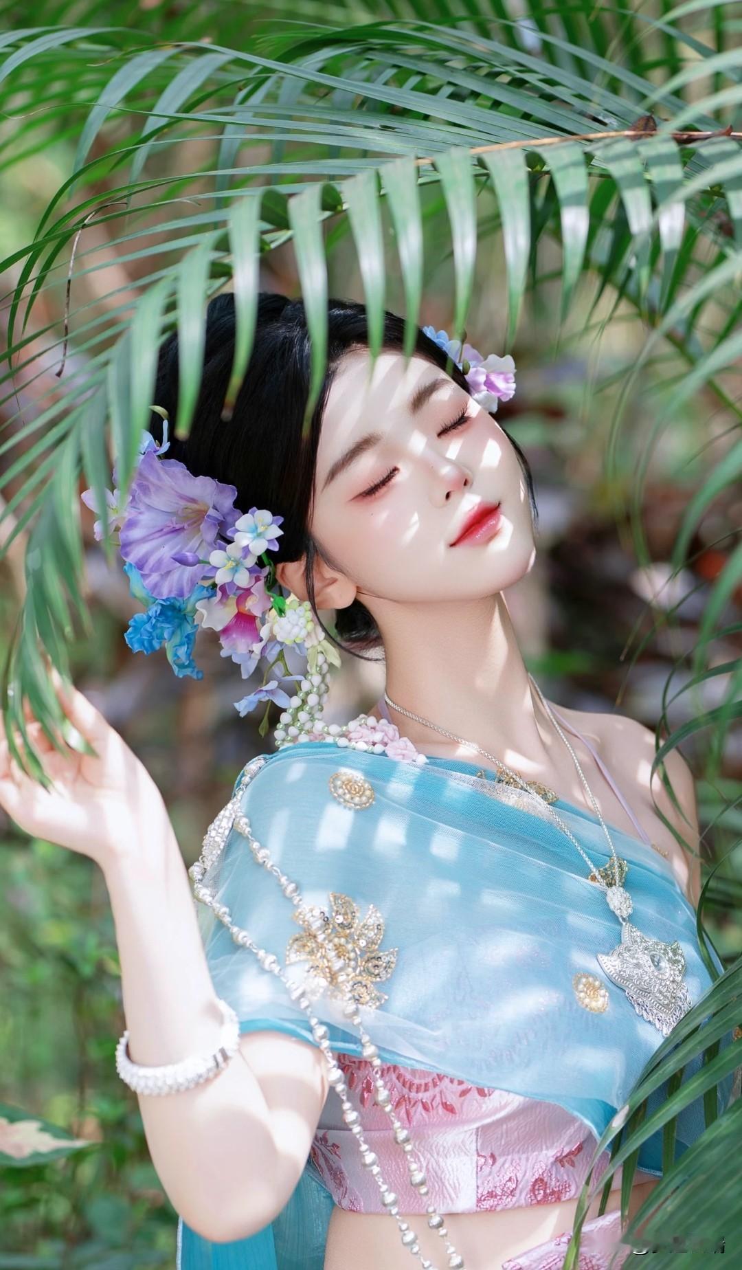仙气飘飘的傣族仙子,置身于梦幻的园林之中。