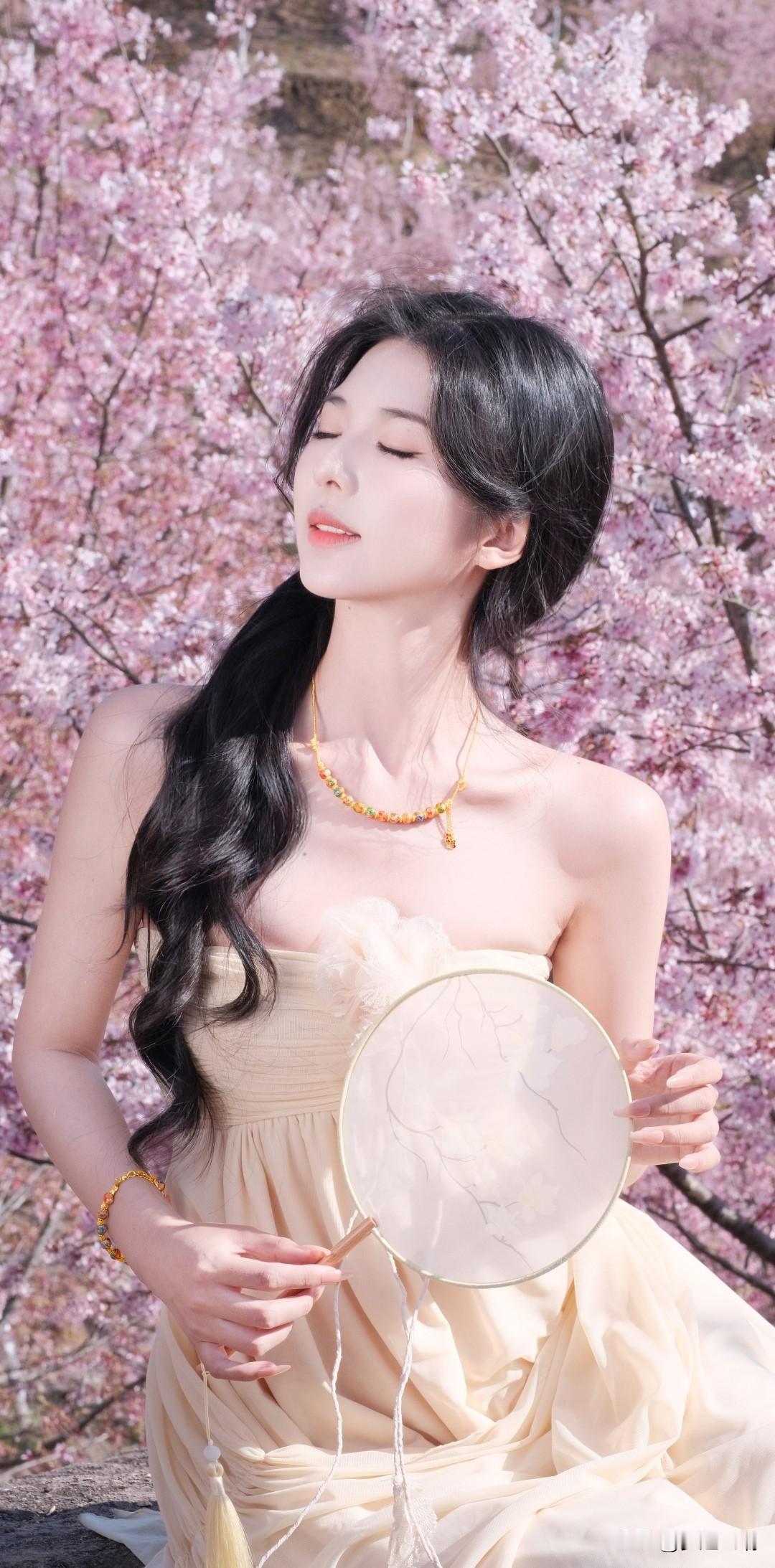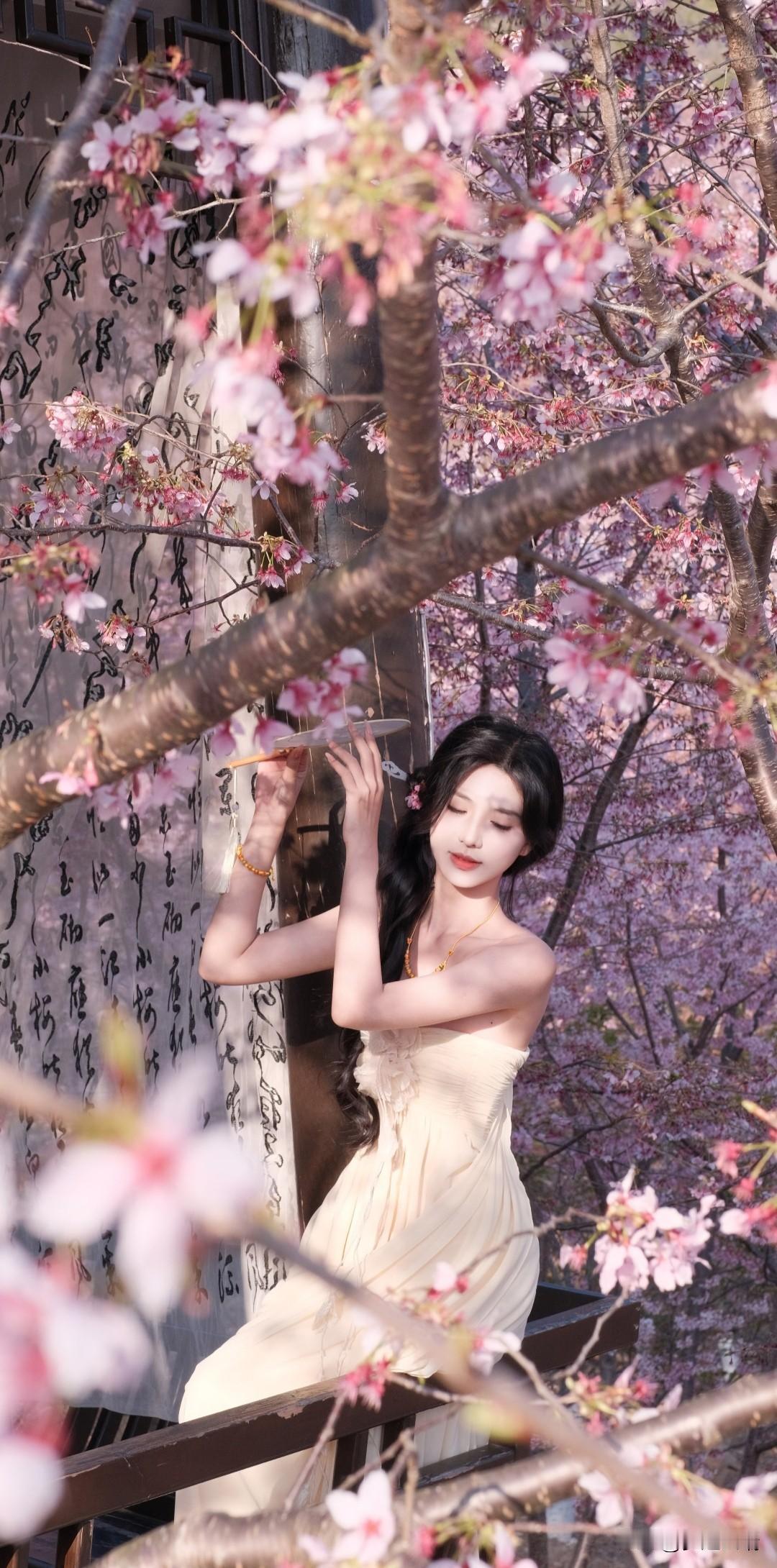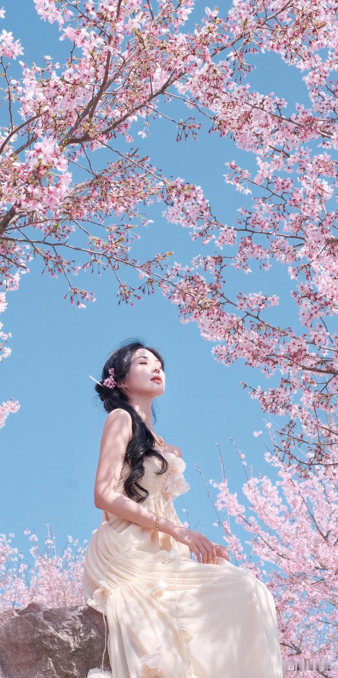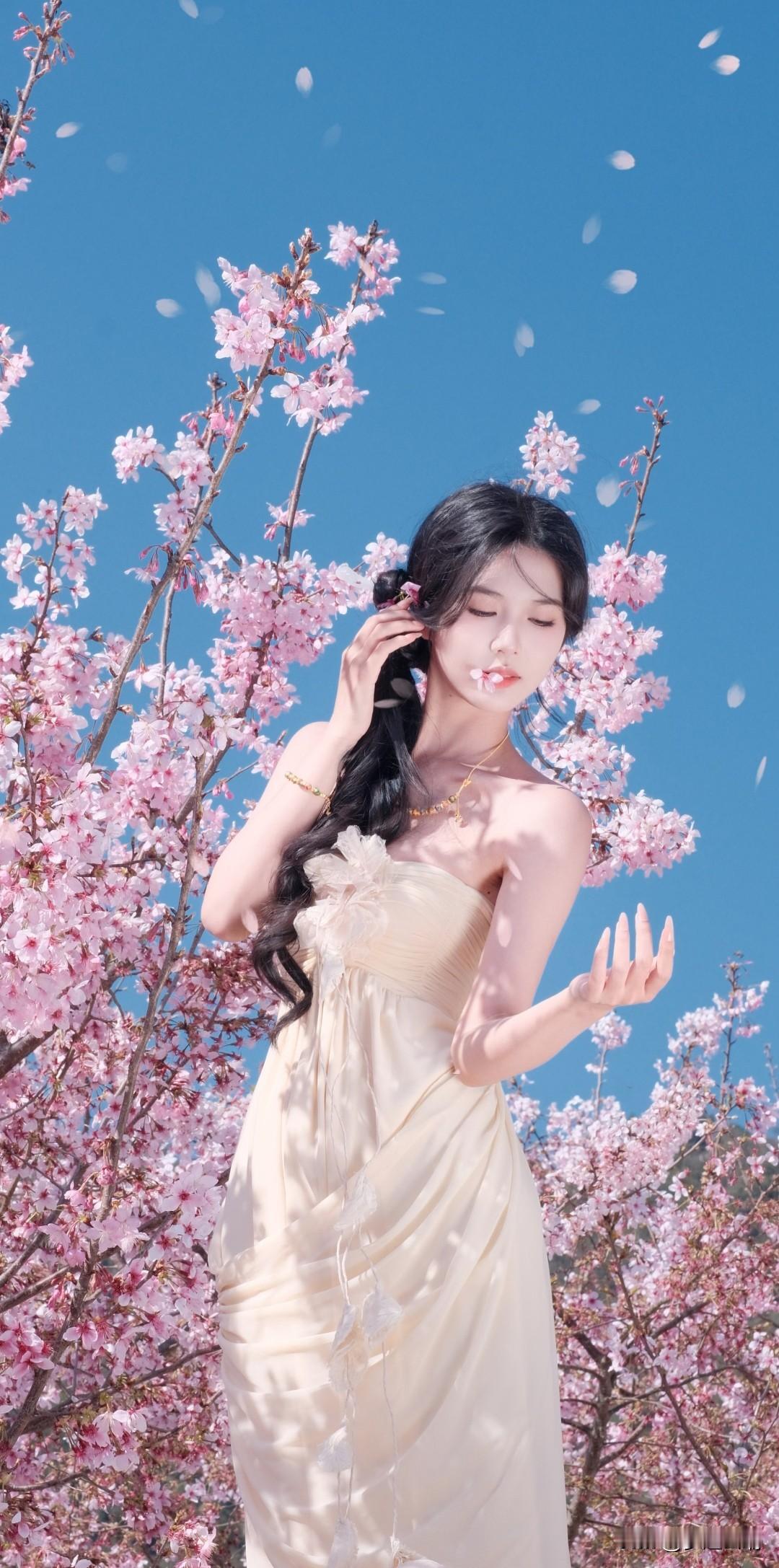 樱花树下,温柔少女,花环点缀,春意盎然。