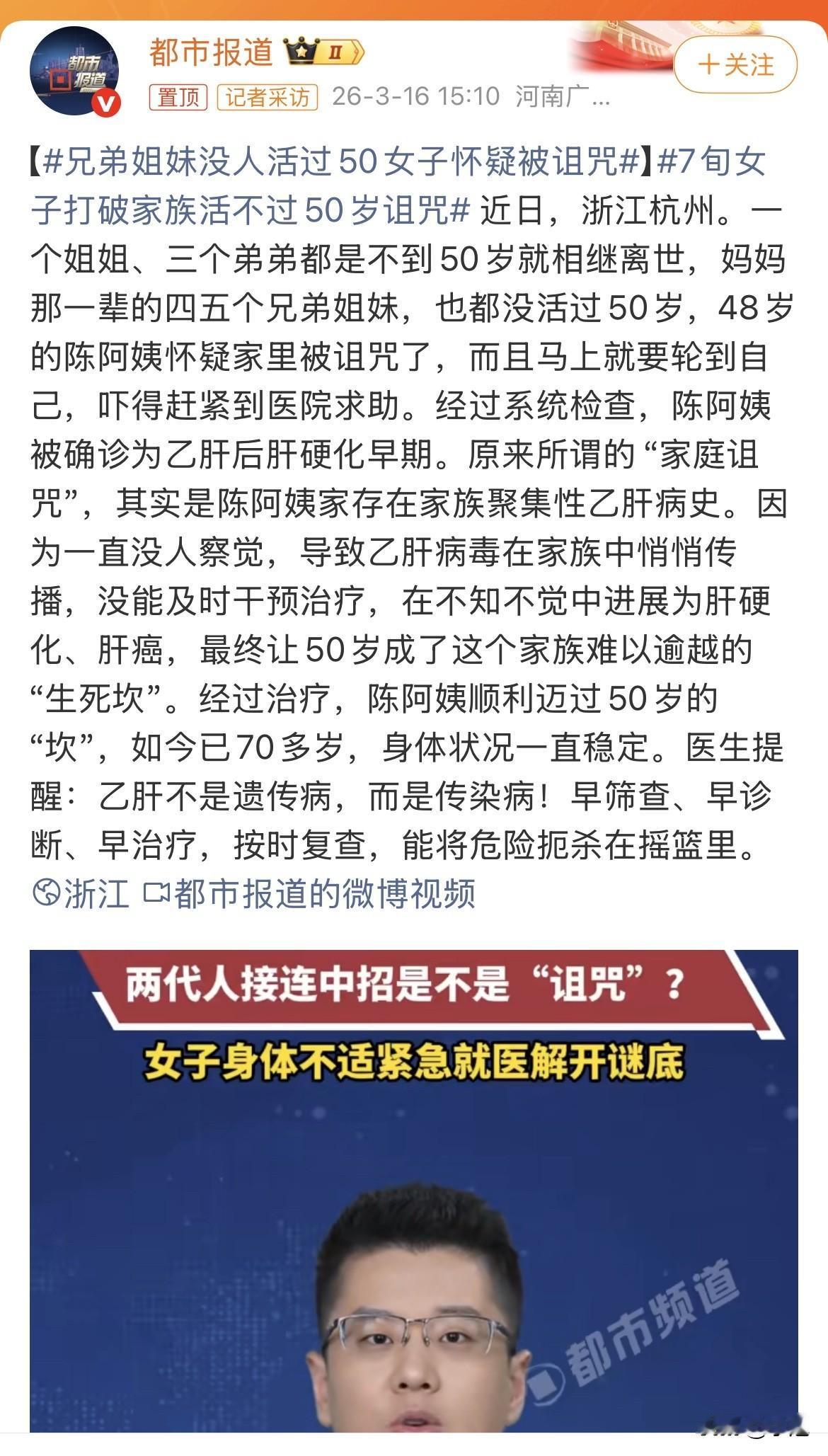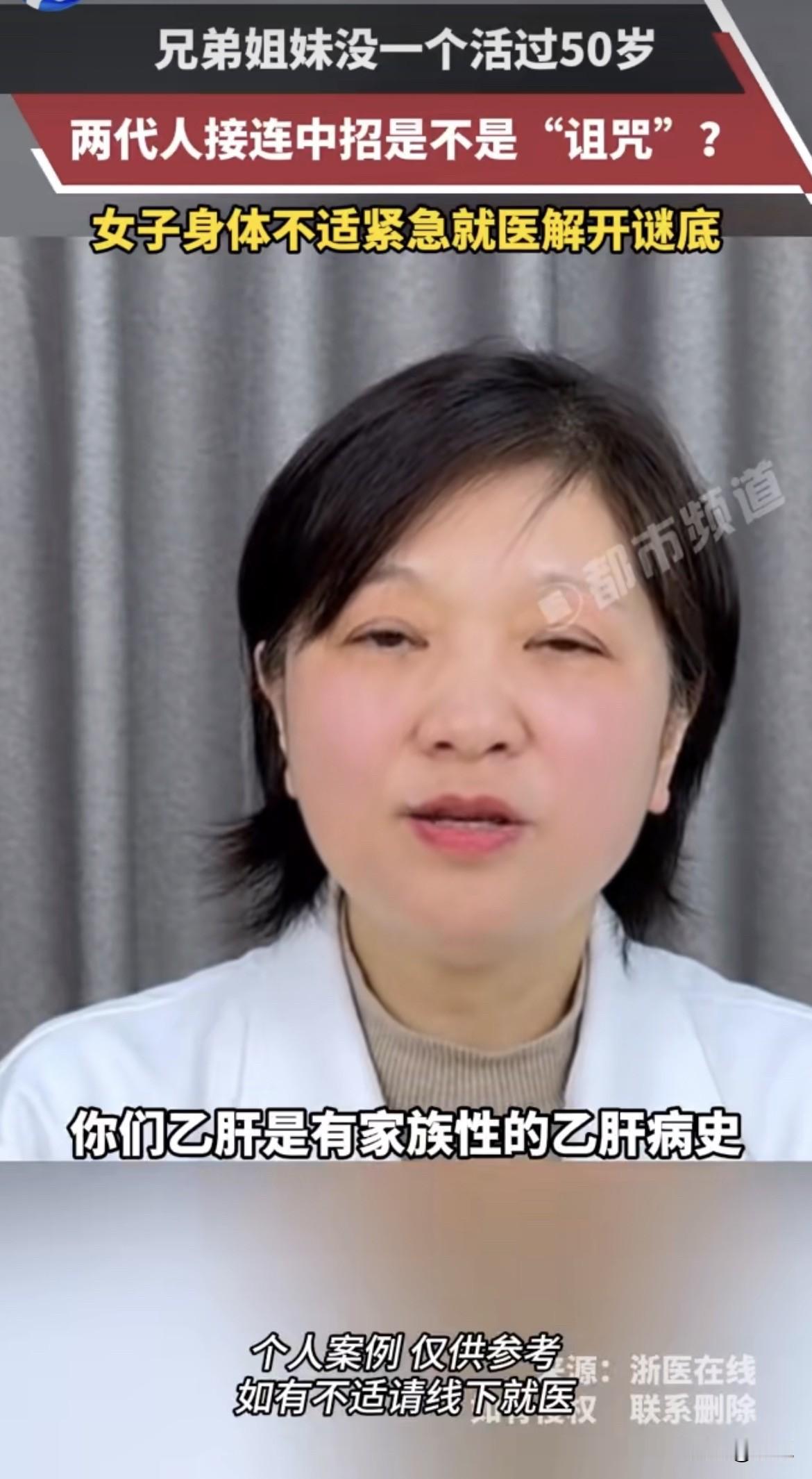 48岁的陈阿姨走进杭州市第一人民医院那天,脸上带着一种说不出的表情。不是害怕,是认命。她告诉医生,自己家里一个姐姐、三个弟弟,全是不到50岁就没了。妈妈那边四五个兄弟姐妹,也没一个活过50岁。现在眼瞅着自己就要到这个坎了,最近总觉得浑身没劲,饭也吃不下。她压低声音问医生:我们家是不是被什么诅咒缠上了? 医生听完这话,背后一阵发凉。这不是头一回有人这么问,但每次听到还是觉得瘆人。家里人不懂医,只记得那些亲人走之前,有的肚子肿得老大,有的老说右边肋骨下面疼。送到医院,诊断书上写的不是肝硬化晚期,就是肝癌晚期。一个接一个,像商量好似的,全卡在50岁这个年纪。 检查结果出来那天,陈阿姨才知道,哪来的什么诅咒。她得的是乙肝后肝硬化早期。这个诊断一出来,两代人的死亡谜团全解开了。 医生跟她解释,这叫家族聚集性乙肝。广州地区一项针对1096名慢性乙肝患者的研究发现,家族聚集率高达51.9%。也就是说,每两个乙肝患者里,就有一个家里还有别的病人。病毒就在兄弟姐妹之间、母子之间悄悄传了个遍。因为没人知道,也从没干预,病毒就在身体里默默啃噬肝脏。 陈阿姨家这种情况,说到底就是两样东西在作怪:母婴传播和日常接触。 先说母婴传播。这是国内乙肝家族聚集最狠的一条路。福州疾控中心的数据说得明白:围产期和婴儿时期感染HBV的,慢性化率能到90%左右。这些孩子长大结婚生子,又会往下传。有一项南京地区2020到2024年的研究,对259个乙肝阳性妈妈的新生儿做了规范的联合免疫,阻断成功率94.98%。换句话说,只要知道、只要做,孩子基本不会被传染。北京地坛医院的专家甚至说,HBsAg阴性以及HBsAg阳性但HBeAg阴性母亲的新生儿,采取正规预防后阻断率能到98%到100%。可陈阿姨妈妈那一辈,哪懂这些。孩子生下来,该喂奶喂奶,该亲亲抱抱亲亲抱抱,病毒就这么传下来了。 再说日常接触。乙肝病毒不光母婴能传,血液、唾液、汗液、精液、乳汁都能传。家里一把牙刷轮流用,一个剃须刀谁想用谁用,吃饭你一筷子我一筷子,摸完钱票的手直接抓花生瓜子往嘴里送——这些事儿在普通人家太常见了。可偏偏就是这些不起眼的小动作,让病毒在家庭成员之间来回串。埃塞俄比亚有一项2025年的研究,专门看家庭内部传播,发现家里人口超过7个的,感染风险能翻4倍多。还有,家里如果有人因为肝炎死过,其他成员感染的风险是普通人的3倍。陈阿姨那些姐姐弟弟,从小在一个锅里吃饭,一个盆里洗脸,一个炕上睡觉,病毒就这样一代传一代,根本没人察觉。 最可怕的是,这病毒在身体里是慢慢啃的。 广州那项研究还追踪了患者的发病年龄。家族史阳性的人在31到45岁这个年龄段,肝硬化比例明显比家族史阴性的人高。福州疾控的数据更吓人:聚集性感染家族里,子代感染后肝硬化和肝癌的发病年龄,比没有家族史的人提前10年。而且,有肝癌家族史的慢性乙肝感染者,自己得肝癌的风险高出32.9倍。陈阿姨那些姐姐弟弟,有的30多岁肝就不行了,有的40出头查出肝癌,没有一个扛过50岁。这哪是什么诅咒,就是病毒在家族里潜伏了几十年,到了时候一起收账。 陈阿姨从48岁那年开始,老老实实吃抗病毒药,每三个月到医院报到一次,做肝功能、做B超。这一坚持就是二十多年。如今她已经70多岁,不光自己活得硬朗,第三代的孩子也已经健康长大。那个曾经压得一家人喘不过气的50岁诅咒,在她这儿彻底断了根。 回头看看,这个所谓的诅咒,最扎心的地方在哪?不是病毒多厉害,是一家人被蒙在鼓里几十年,一个接一个地死,都没人想到去做个检查。如果她妈妈那一辈有人懂一点,或者遇到一个好医生做一次筛查,那四五个兄弟姐妹,会不会也能活过50岁? 可惜没如果。 现在陈阿姨逢人就说一句话:乙肝这病,最怕的不是治不好,是压根不知道自己有。而家里只要有一个人有,一桌吃饭的、一个屋睡觉的,都可能成为下一个。那个诅咒,不过是一层没人捅破的窗户纸。 你看完这事,啥感觉?你家或你身边人,会定期做肝脏检查吗? 来源:都市报道
