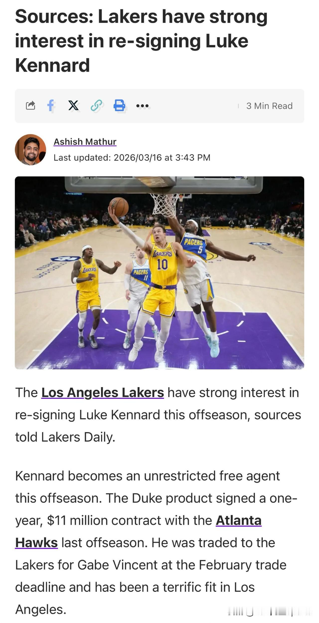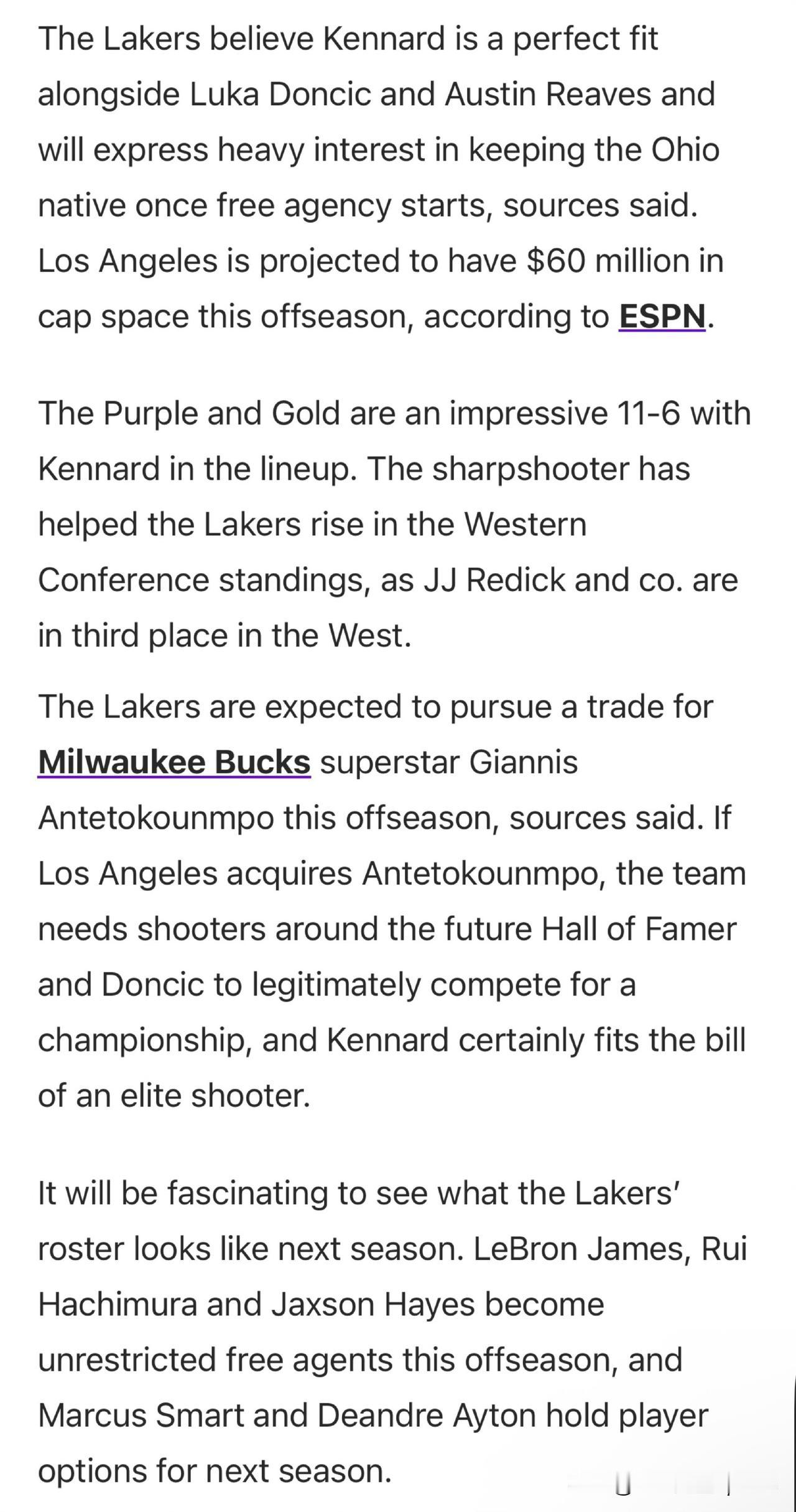 据《湖人日报》记者Ashish Mathur报道,湖人对休赛期续约肯纳德兴趣浓厚。 肯纳德将于本赛季结束后成为完全自由球员。这位杜克大学出身的球员在上赛季休赛期与老鹰签下一份为期一年价值1100万美元的合同,并在2月交易截止日被送至湖人,换取文森特,他在洛杉矶的表现堪称完美适配。 消息源称,湖人方面认为肯纳德与东契奇、里夫斯的组合堪称天作之合,将在自由市场开启后,向这位出生于俄亥俄州的球员表达强烈的留队意愿。据ESPN报道,湖人预计将在休赛期拥有约6000万美元的薪资空间。 紫金军团在肯纳德出战的比赛中取得了11胜6负的战绩。这位神射手助力湖人在西部排名稳步攀升,目前在雷迪克的带领下位居西部第三。 消息源还指出,湖人预计将在休赛期尝试交易雄鹿巨星扬尼斯·阿德托昆博。若湖人成功得到字母哥,球队需要围绕他与东契奇配置射手,以具备争冠实力,而肯纳德无疑是理想人选。 下赛季湖人阵容将如何演变,无疑备受关注。勒布朗·詹姆斯、八村塁和海斯将于本赛季结束后成为完全自由球员,斯玛特与艾顿则持有下赛季的球员选项。