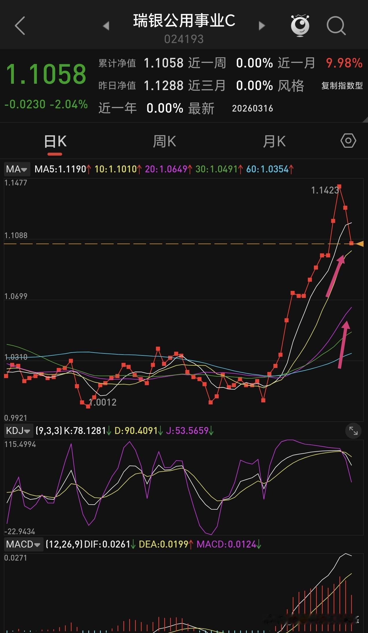 这个电力基金瑞银公用事业周线4连跳,下面有四个向上跳空缺口(图下图所示),可以说前期电力板块表现比较强势。目前股价距离下方5 周线有点远,为了修复指标,有回调需求。再看看它的日线走势(下图二),周一已经跌破了5日线支撑,马上就要到了10日线支撑,守住最好。假如守不住,那就下看20日线支撑位,大约还有近4%的下跌空间。 再看看电力板块指数日线走势,周一也是跌破了5日线支撑,接近10日线,距离下方20日线支撑还有4%下跌空间。所以,这个瑞银公用事业基金是紧跟板块指数的,误差比较小,不像那些混合型主动基金,波动太大,比如那个平安鑫安电网设备基金,这几天下跌幅度严重偏离板块指数,三天大跌10%! 电力板块行情没有走完,距离夏天还早呢!