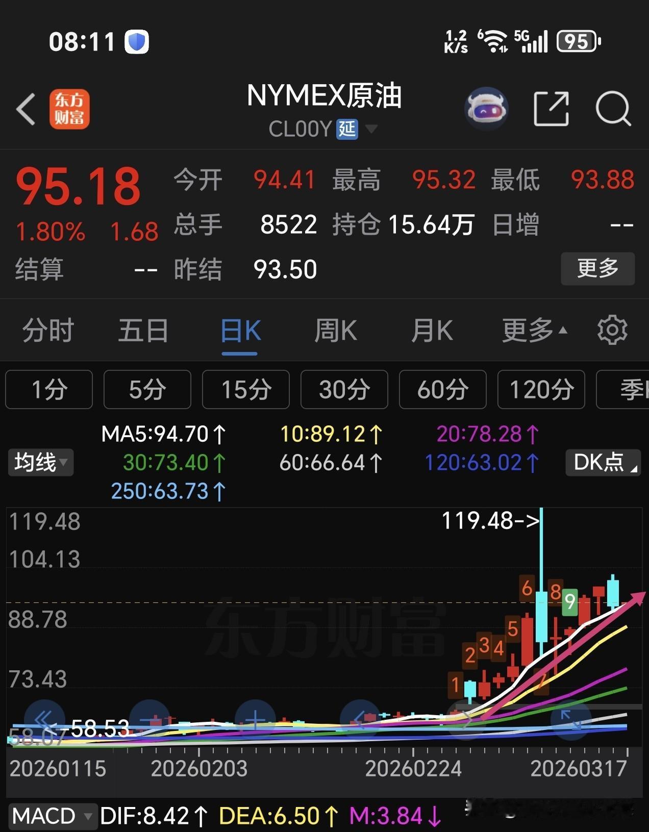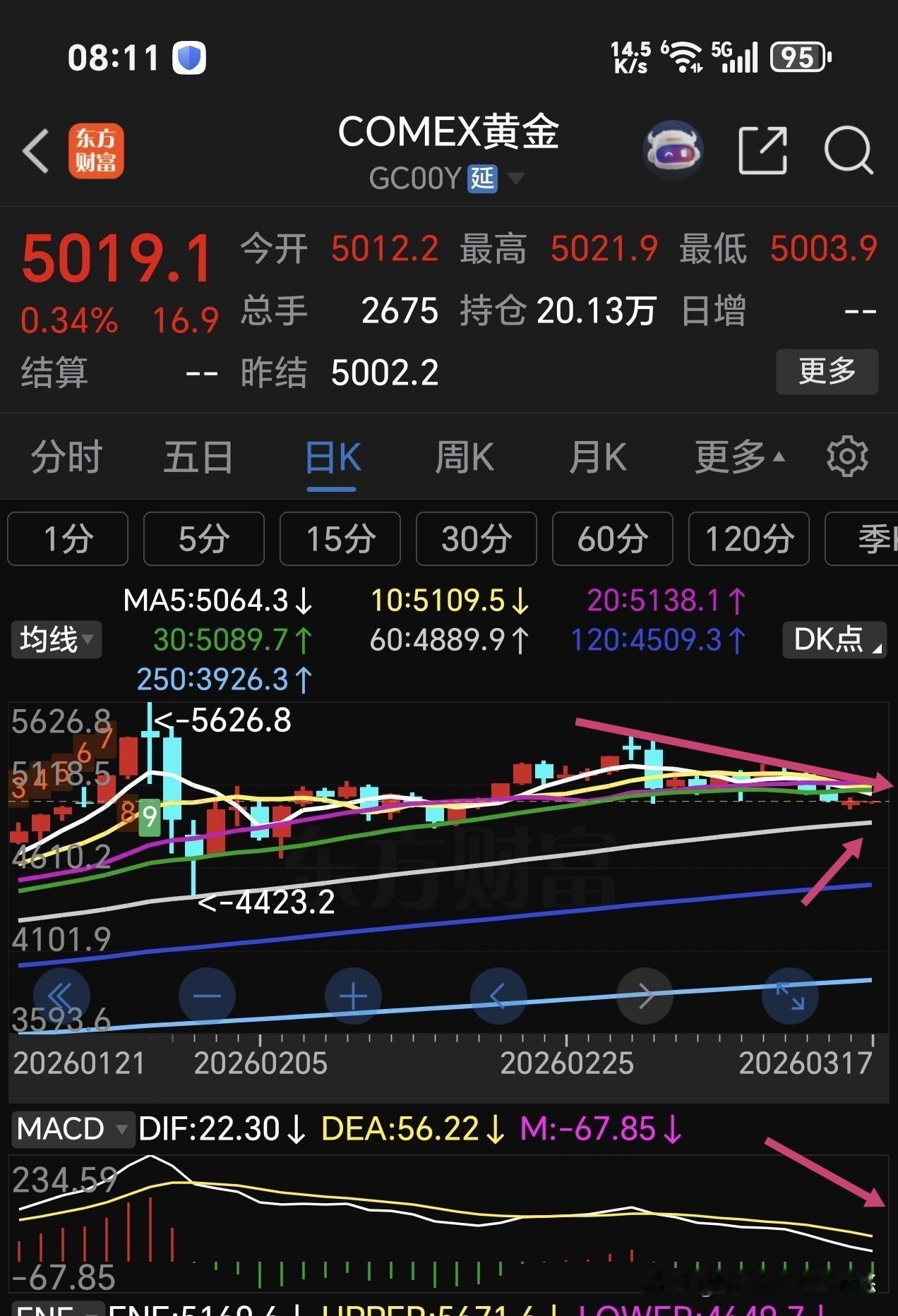 现在8点10分,今天外盘期货已经开盘2个小时,目前美三大股指期货小幅低开,小跌!它变化比较快,经常由大绿翻红。 国际石油目前涨幅近2%,最近一直沿着5日线上涨,昨天下跌到5日线支撑就止住,今天还是紧贴5日线上行。那边枪声不停,石油涨势不减! 国际黄金目前小幅反弹,昨天一度跌破了5000美元每盎司。它与美元关联比较密切,美元走强黄金就变弱。现在美元已经近100了。