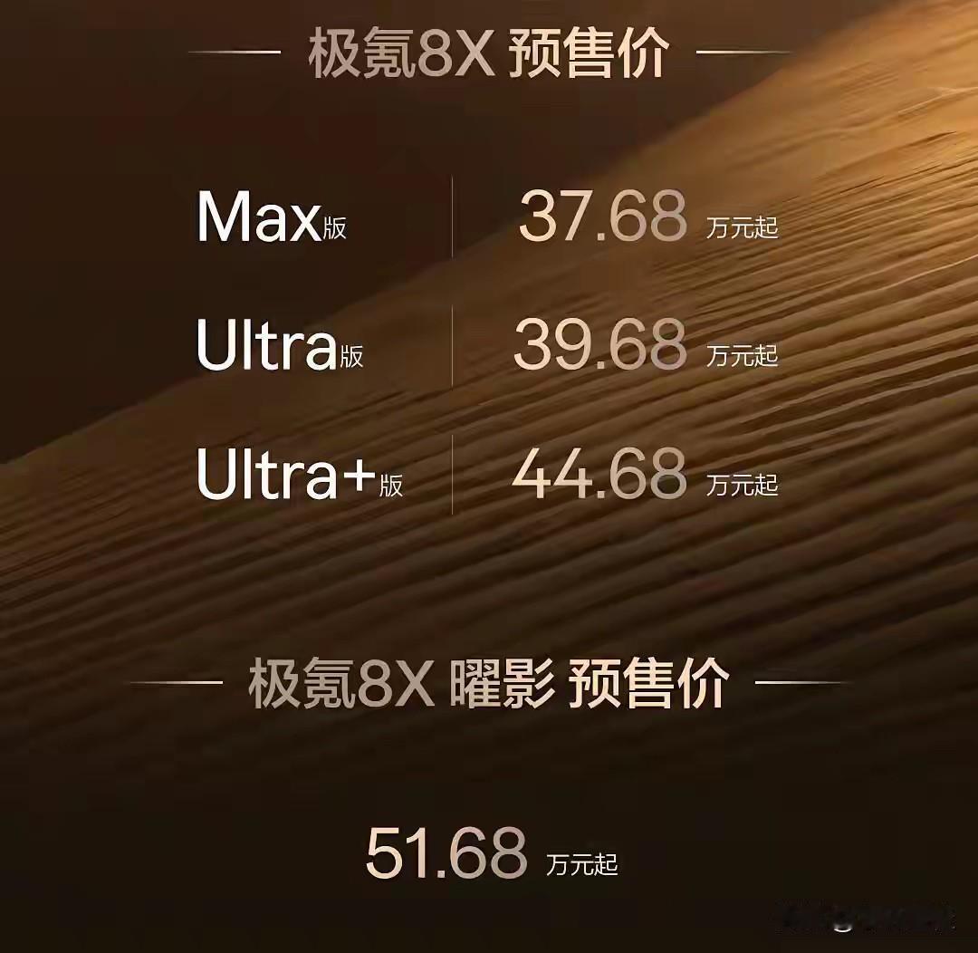 预售38分钟,小定突破10000台,零百加速2.96秒,1400匹马力! 极氪8X预售价37.68万-51.68万?极氪这是越战越勇了? 腾势压力山大了,极氪9X售价跟销量吊打腾势N9,现在又推个售价接近甚至顶配高于腾势N9的极氪8X,如果极氪8X又成功的话,那腾势就真没脸了! 感觉是要连问界、理想、蔚来一起挑了![呲牙]