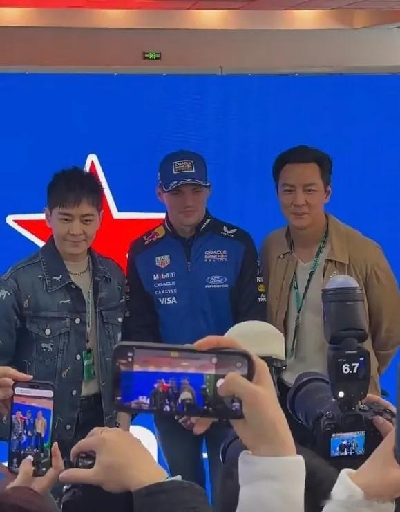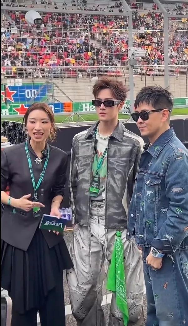 林志颖里面穿灰色T恤,外面套了一身蓝色的牛仔套装,看起来很有青春风采,他戴上墨镜之后像个专业的赛车手。